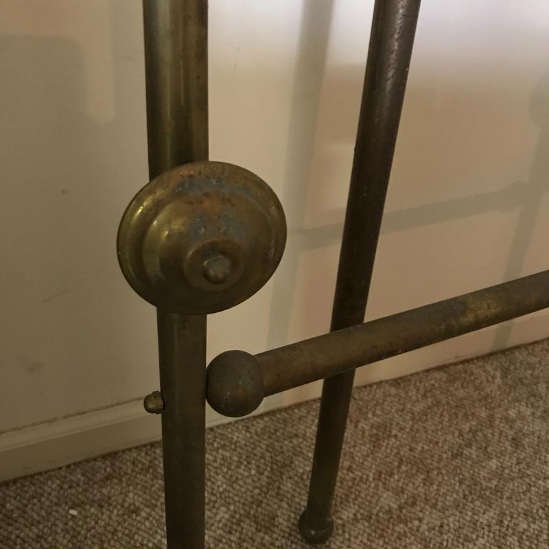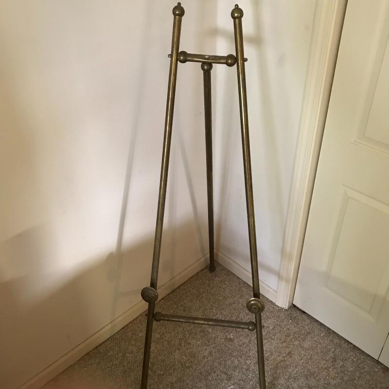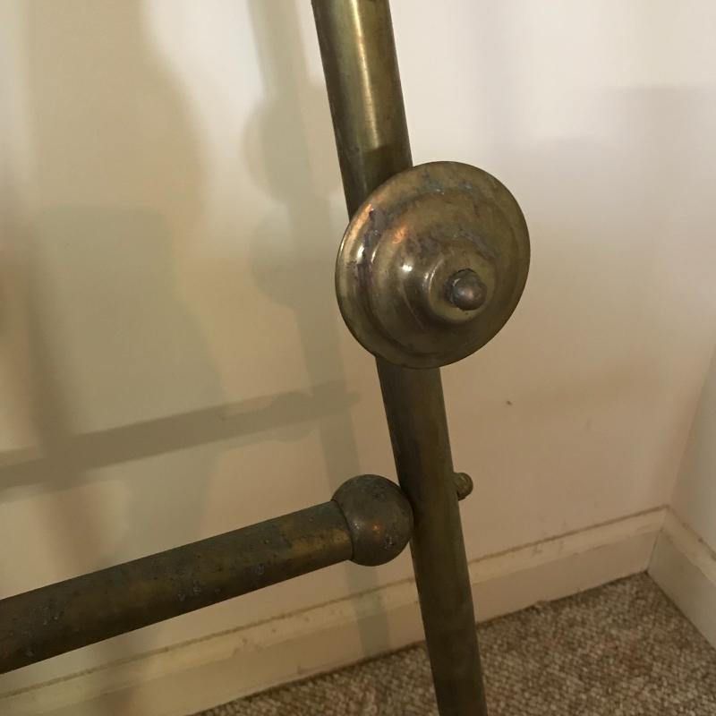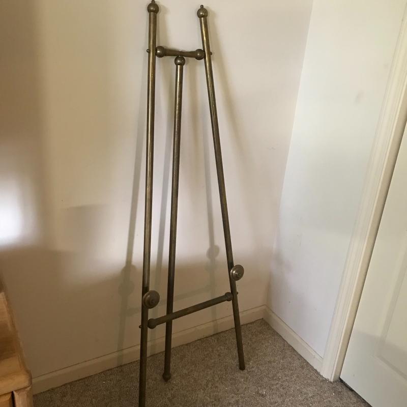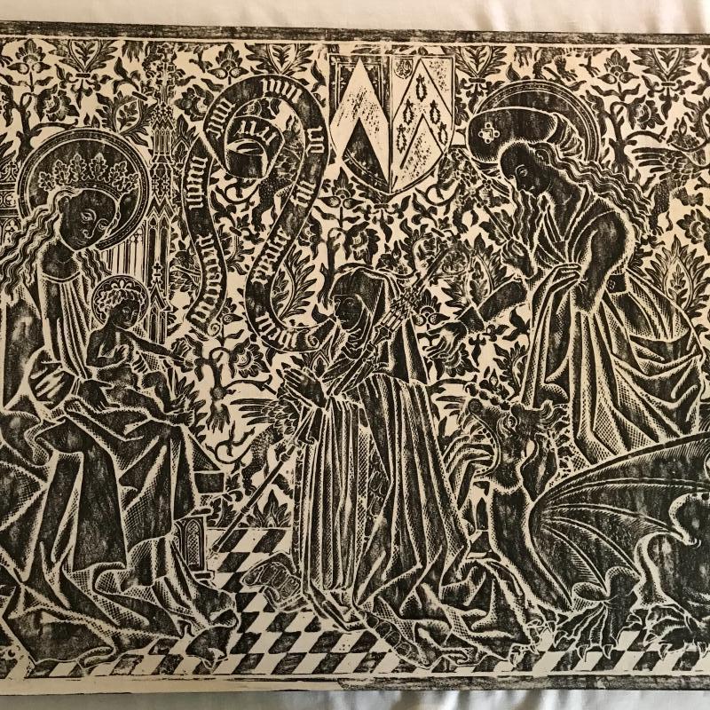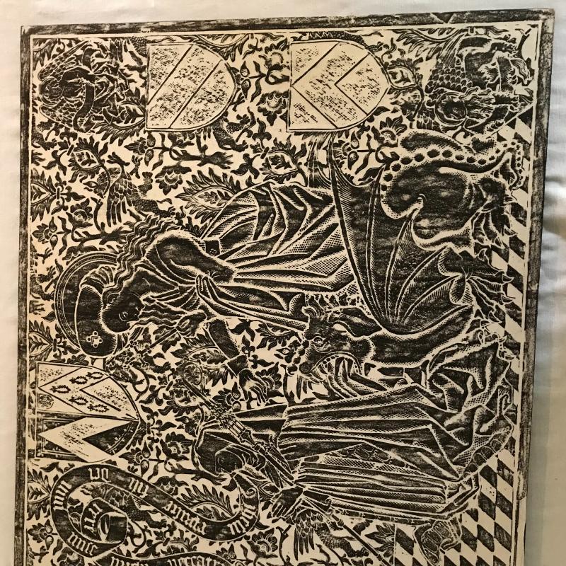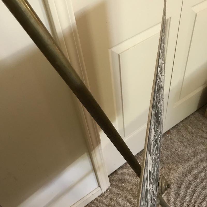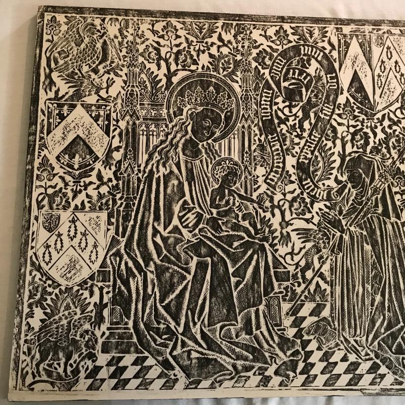 Tall brass easel with a pair of ornate mythical themed rubbings one pressed on particle board and the other appears to be tag board. Amazing details including feathers, talons, a dragon, a queen with child. Zoom in to catch all the details. Brass rubbings are done by stretching a linen rag paper over the deeply etched monumental brass that is usually found at the gravesite. After securing the paper, heelball (a very hard wax) is rubbed vigorously over the paper surface to get an exact copy of the brass plate. A single rubbing can take from 2 hours to 2 days to complete depending in it's size, condition, and complexity.(Description taken from google) The brass easel’s front legs stand 59” high with the handle 20” from base. Height is adjustable depending on angle between front and back legs. Use for the rubbings or for any nice art piece that you want to highlight. Rubbings are similar in size, the particle board rubbing is at 33” x 19.5” while the second rubbing is 32” x 19.5”. No shipping.