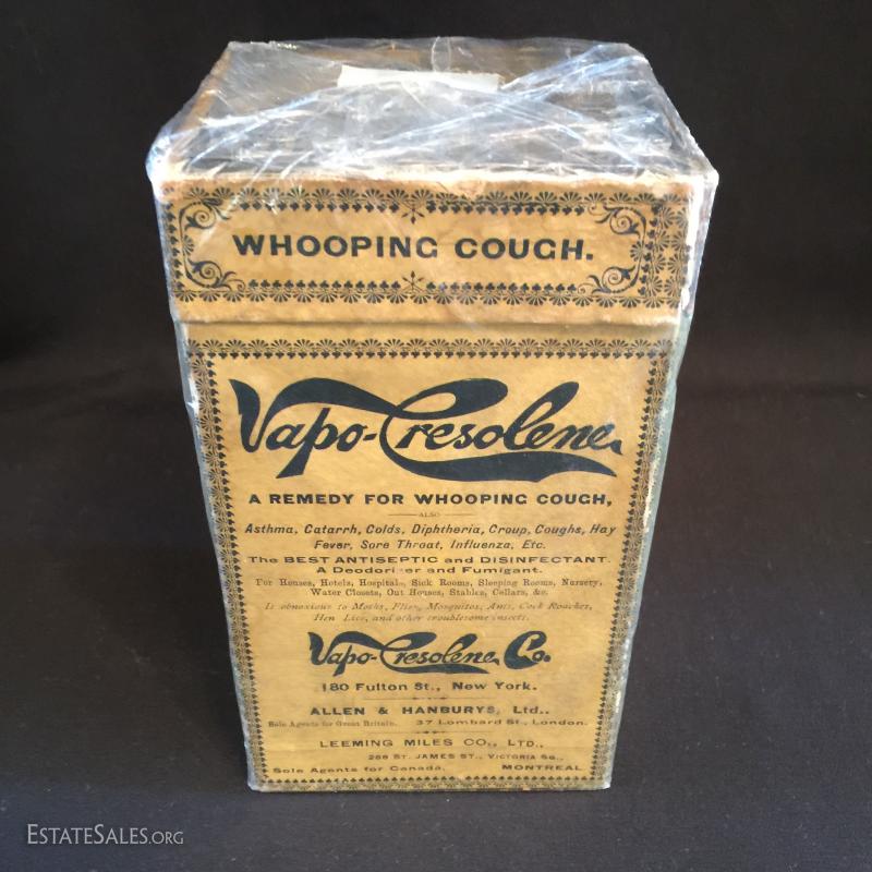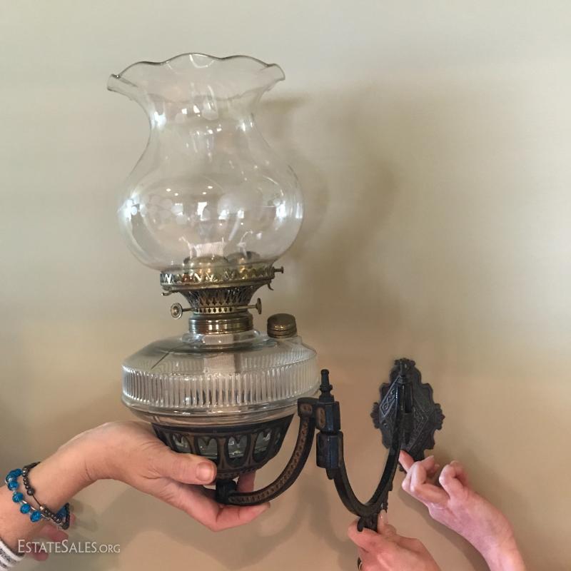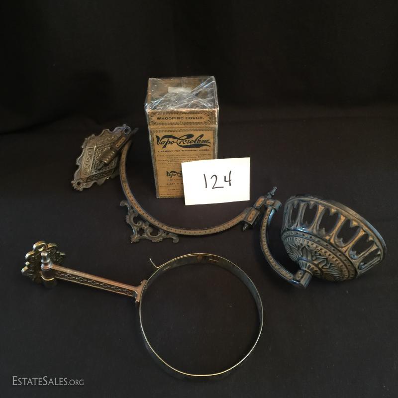Two wall mounted lamp or candle holders, Vintage Vapo Cresolene Whooping Cough box and a 3 wick Kerosene lamp with etched globe.