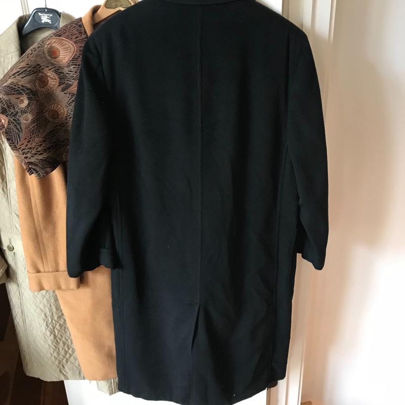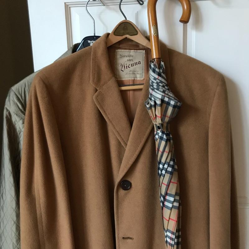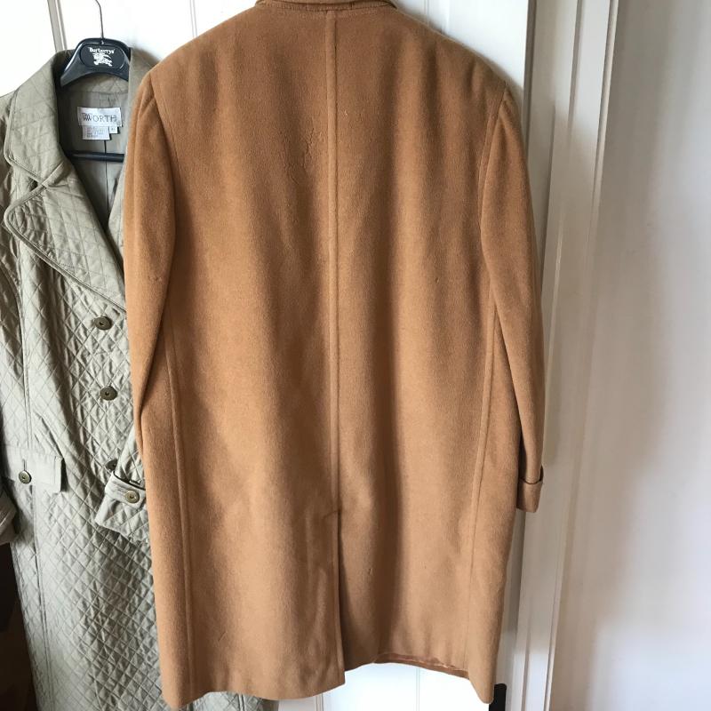 Vicuña wool coat is in good condition with just a few blemish spots in pix, this appears to be an XL in size and made for Whitehouse of Hardy. Black coat is from Tepper’s the Men’s Shop and is in good condition. Silk overcoat by Worth is an XL Ladie’s Coat and also great condition. Burberry umbrella and Brooks Bro’s. camel hair scarf also in Lot. Shipping available.