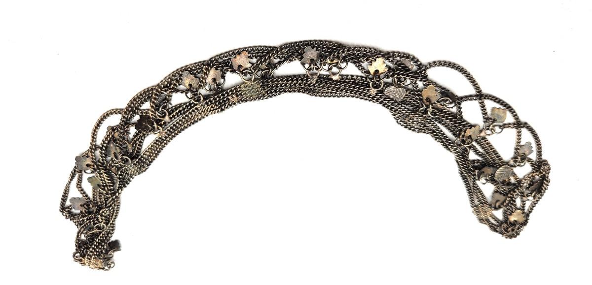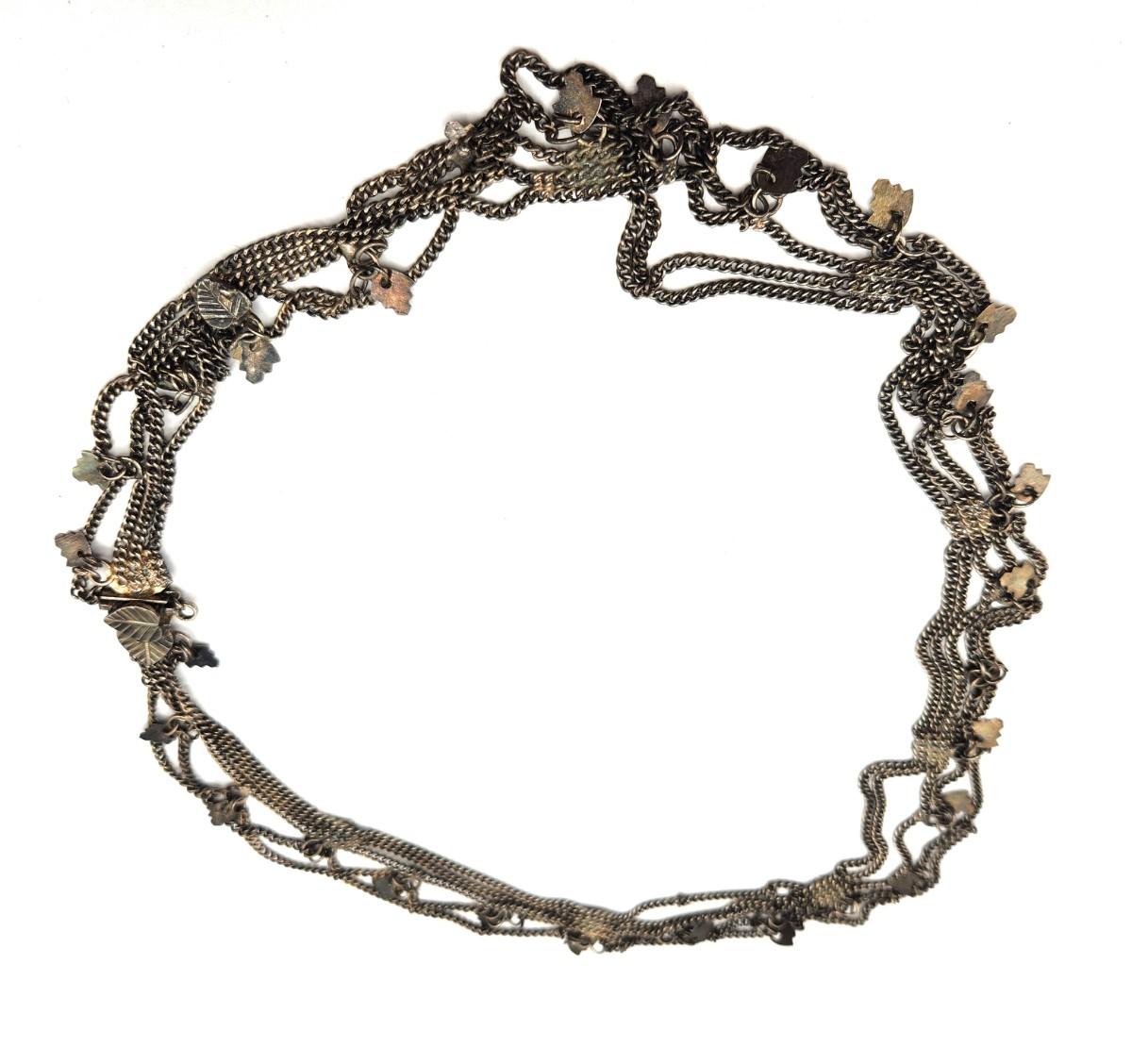 Silvertone metal, lots of danglies - festoon/draped leaf design - made to be worn by a belly or exotic dancer while she's "shaking it." Vintage - good condition. Clasp works fine. about 32" long.