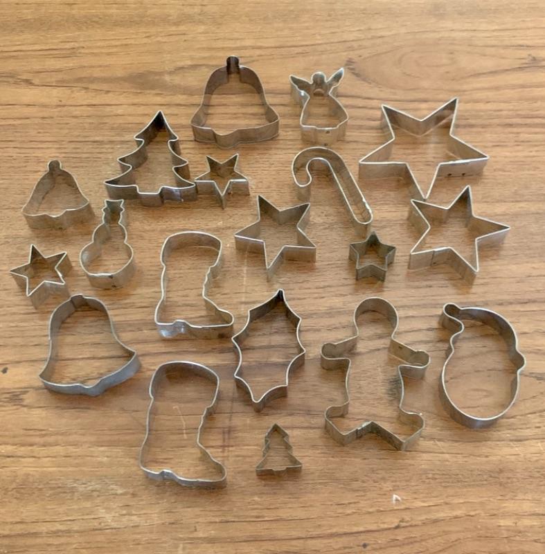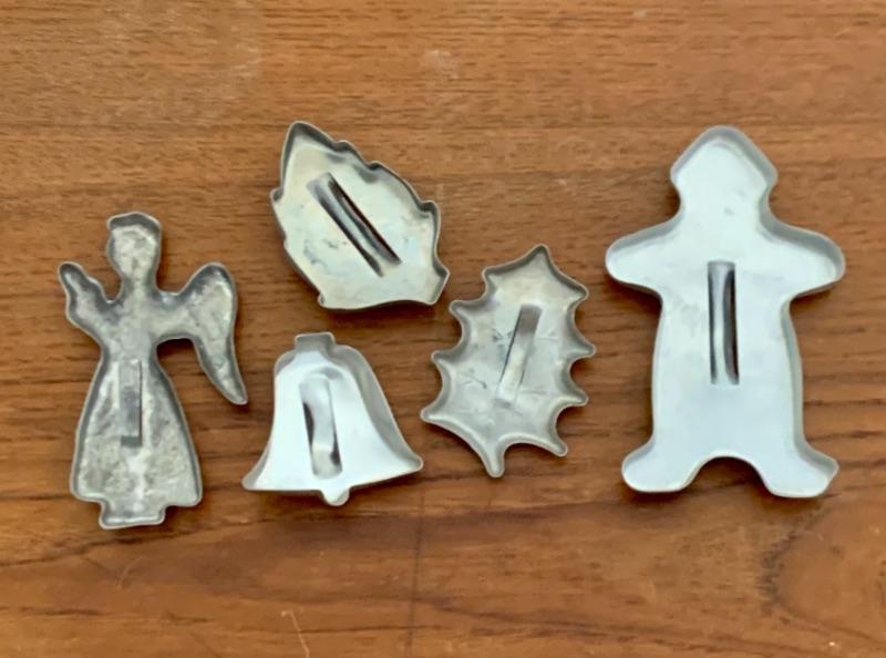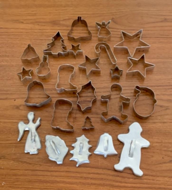 19 open cutters and 5 closed aluminum holiday cookie cutters. Total of 24 pcs. All intact and in very good-excellent condition. No food gunk, less than typical wear for age. Smallest (Xmas tree) measures 1 1/2” and largest (closed gingerbread man) measures 6 1/2.”