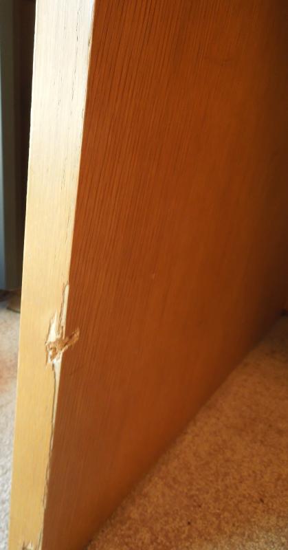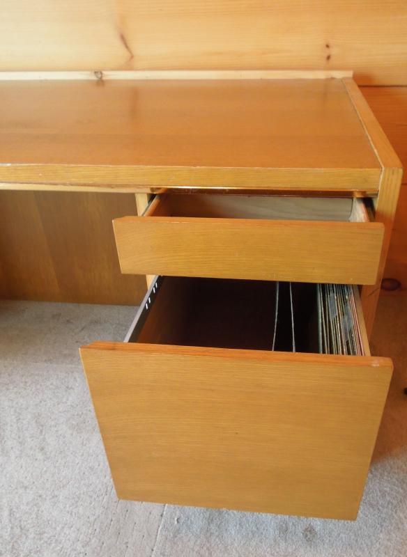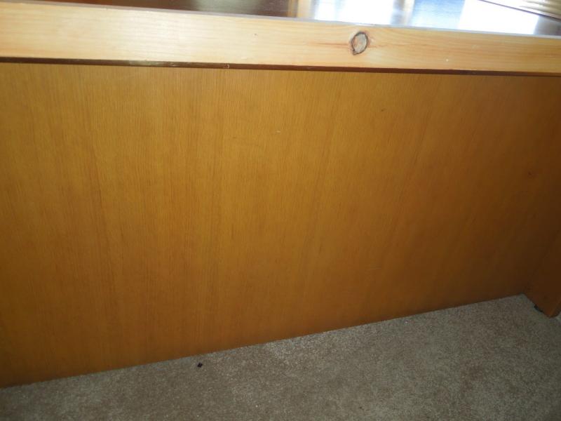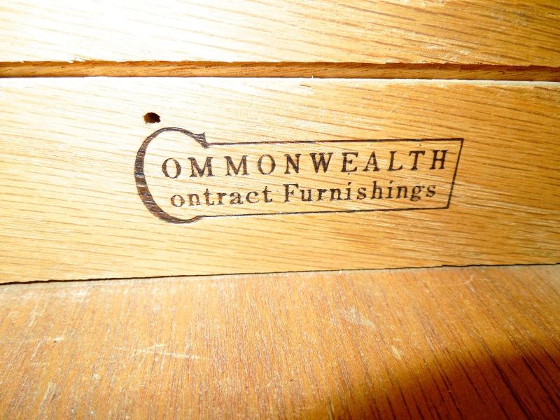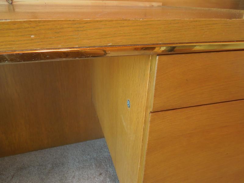 60" L x 30" H x 28" D. Made by Commonwealth for contractors. Polished blonde wood construction with metal trim. 2 drawers with hanging filing cabinet. Previous owner added wood strip along backside. Also has removable home constructed podium for elevating a computer monitor. Three areas pictured where there is damage.