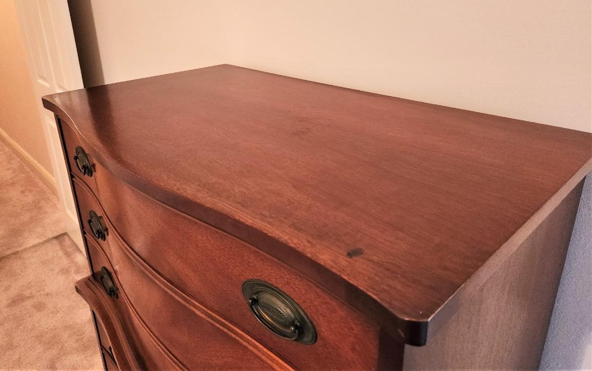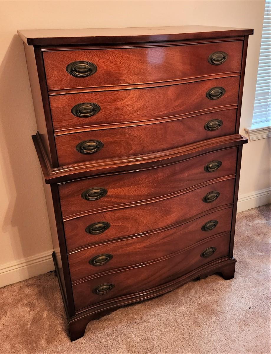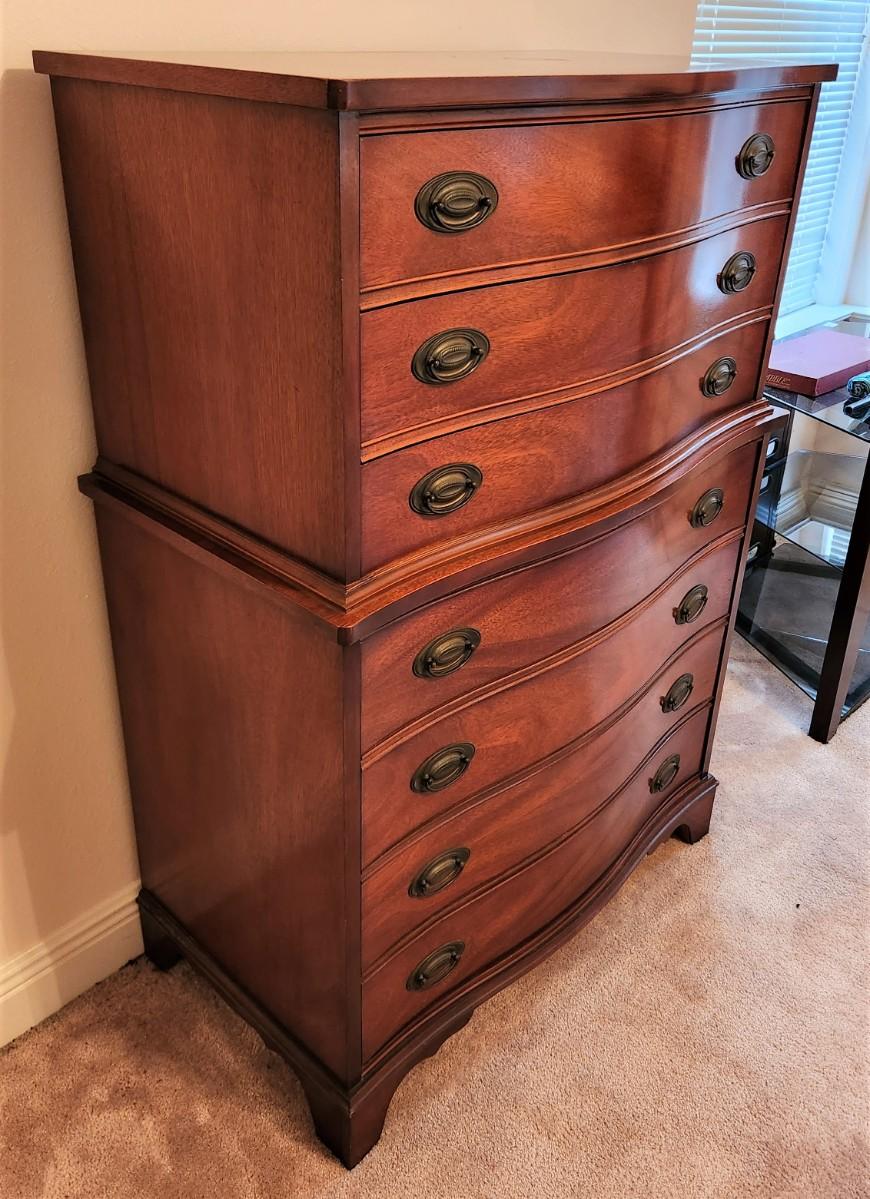 Classic vintage bowfront Chest of Drawers - all original - clean. 19" deep, 49.5" tall, 33" across, 7 drawers. One small old "hickey" on the top - as shown. Don't know if it is an old gouge or a burn mark. It's about 1/2 inch long.