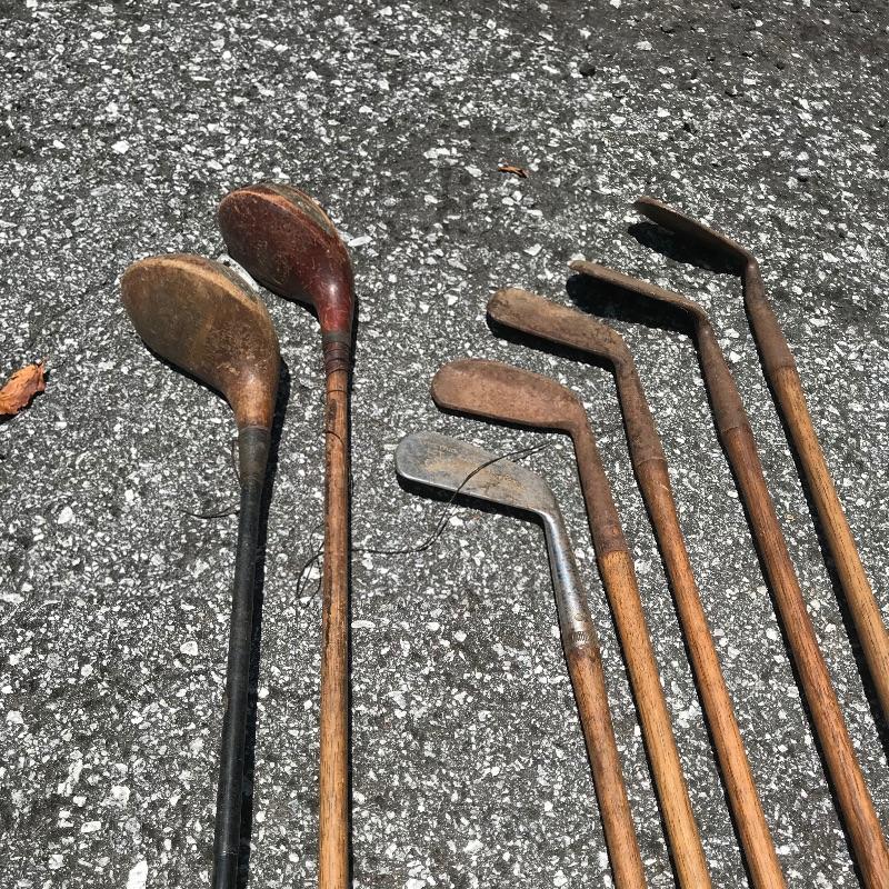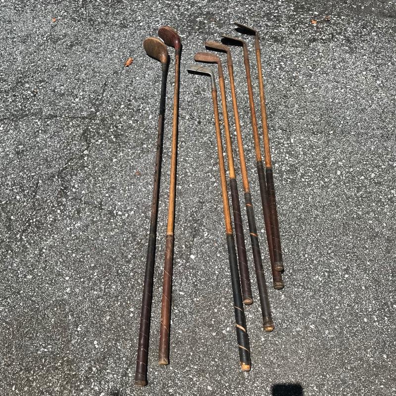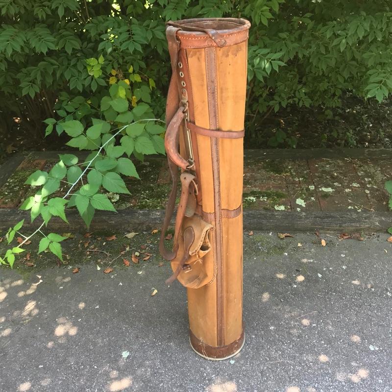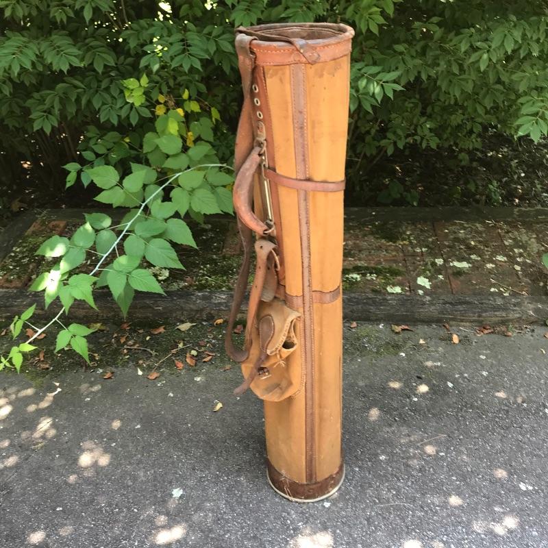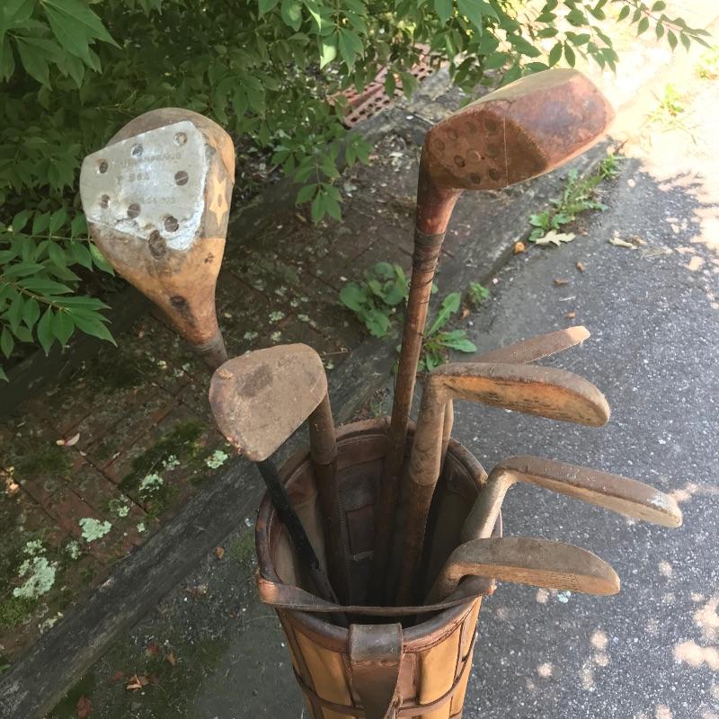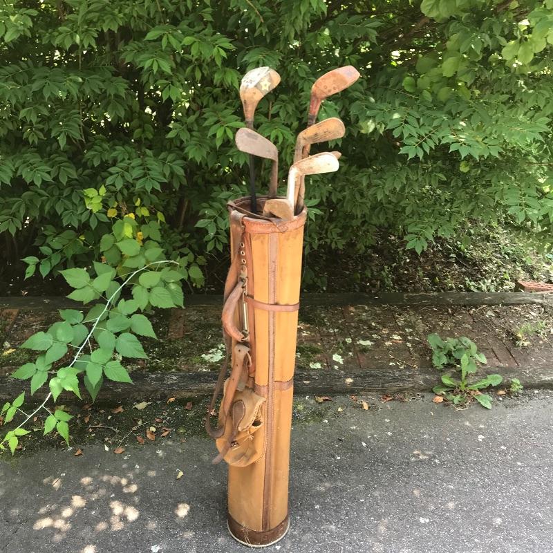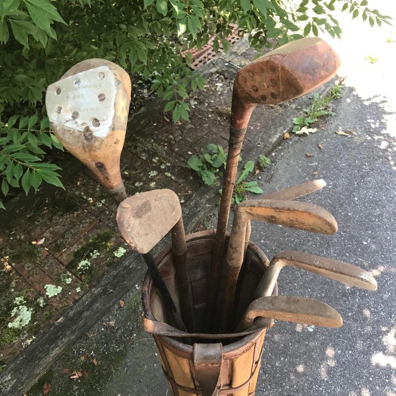 Super cool golf bag that appears to be canvas and leather along with seven clubs. Two wooden drivers and five irons. All the clubs need restoration if used for their intended purpose, but entire lot is cool as historical decor. Shipping available, but due to size we suggest calling UPS with dimensions at 828-252-6930 for a shipping quote prior to bidding. Bag has an almost 7” diameter and stands 46” with tallest driver.