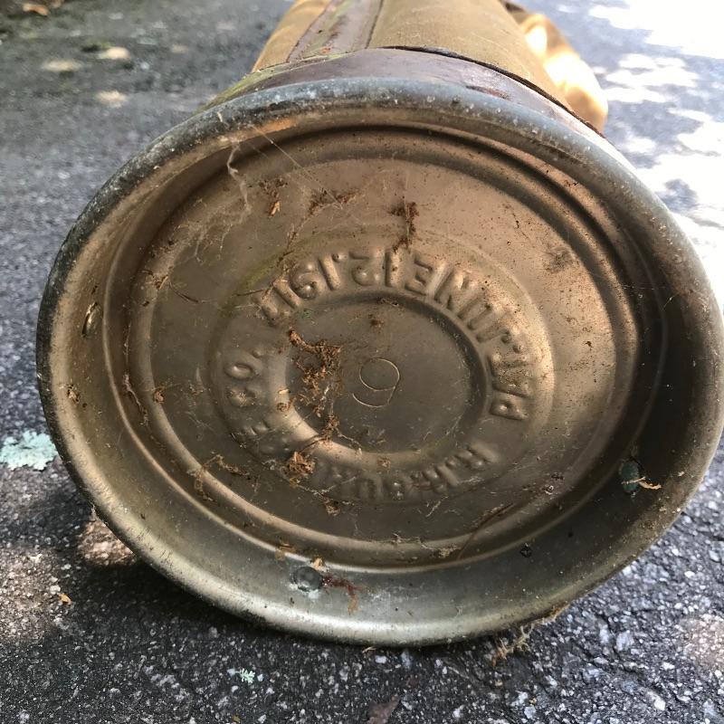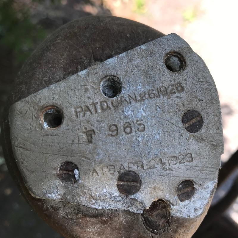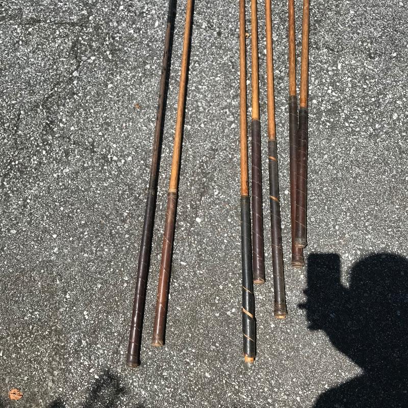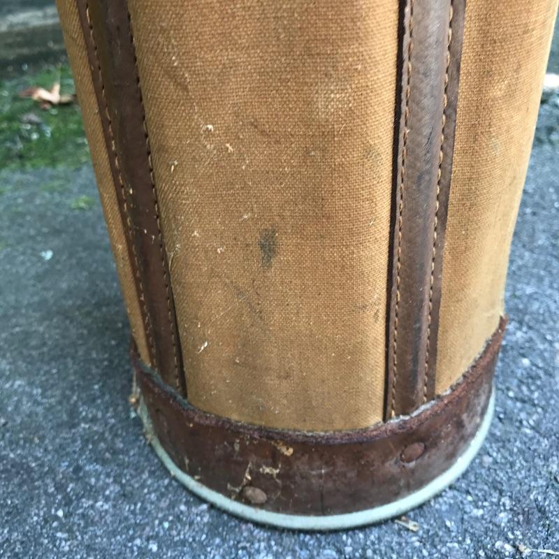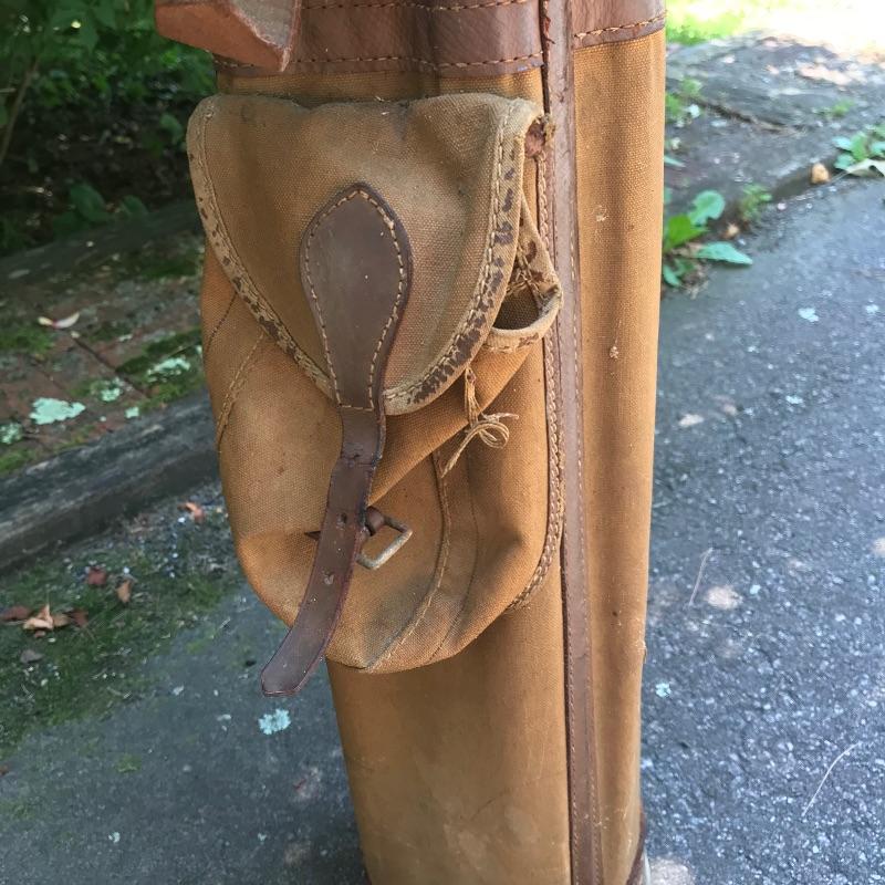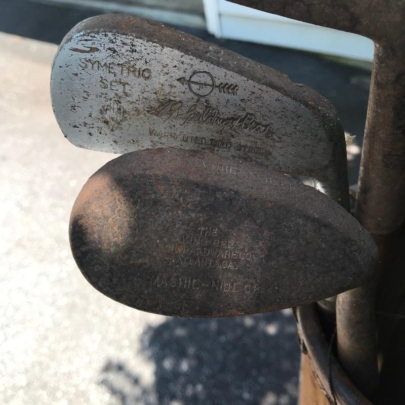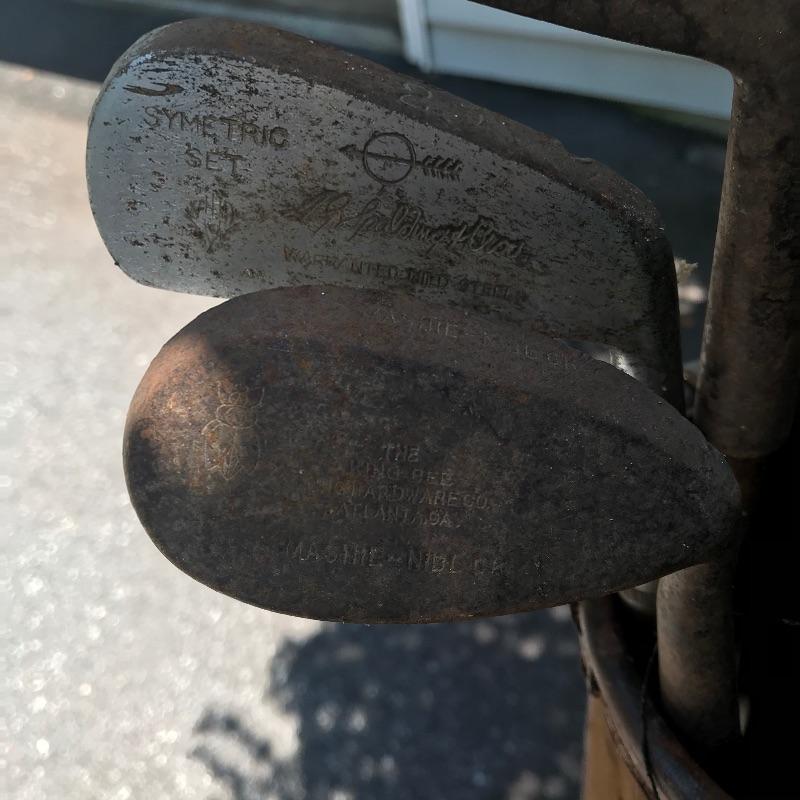 Super cool golf bag that appears to be canvas and leather along with seven clubs. Two wooden drivers and five irons. All the clubs need restoration if used for their intended purpose, but entire lot is cool as historical decor. Shipping available, but due to size we suggest calling UPS with dimensions at 828-252-6930 for a shipping quote prior to bidding. Bag has an almost 7” diameter and stands 46” with tallest driver.