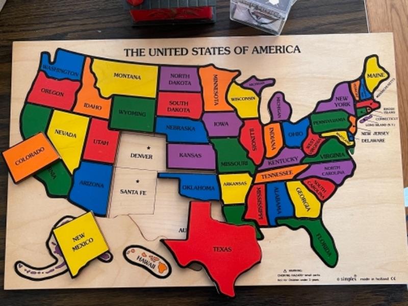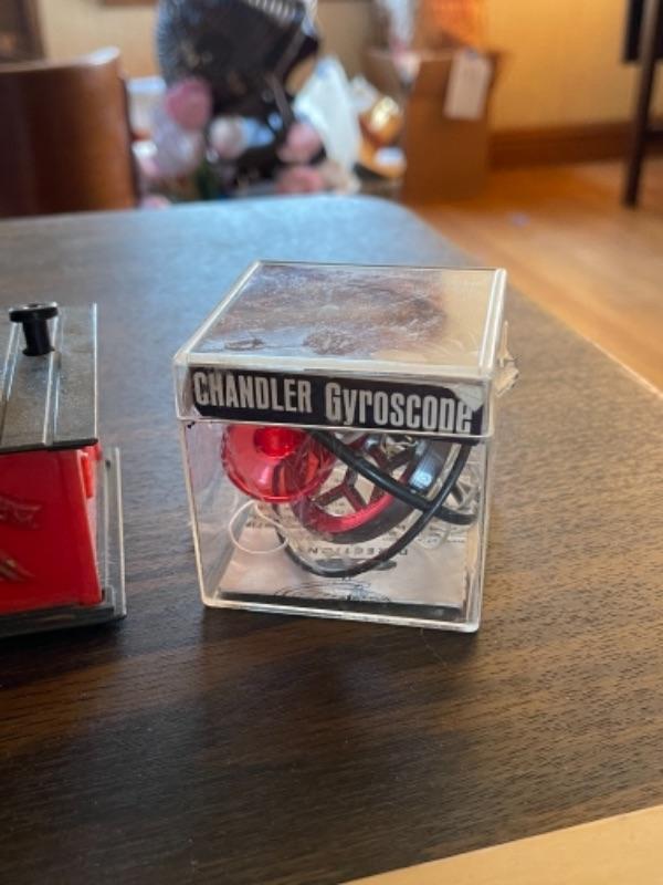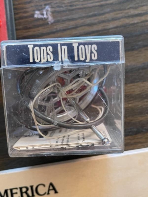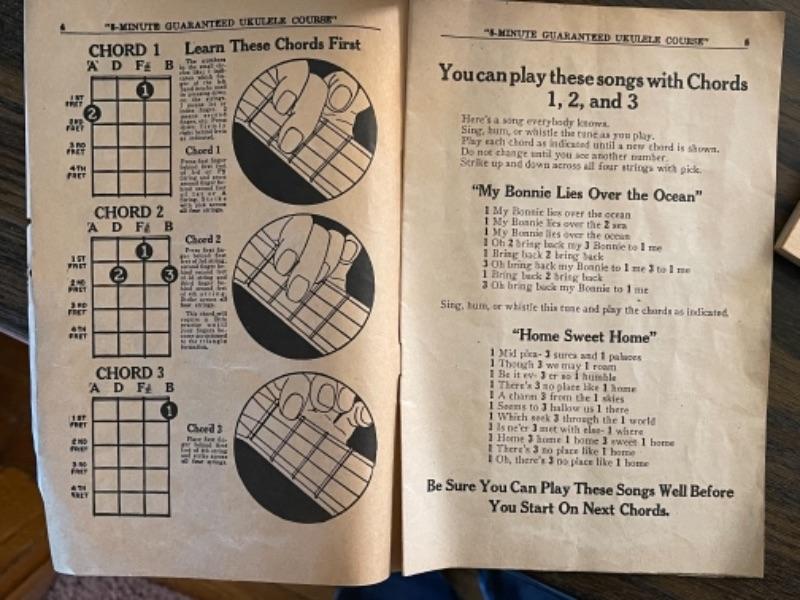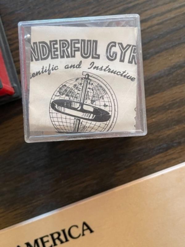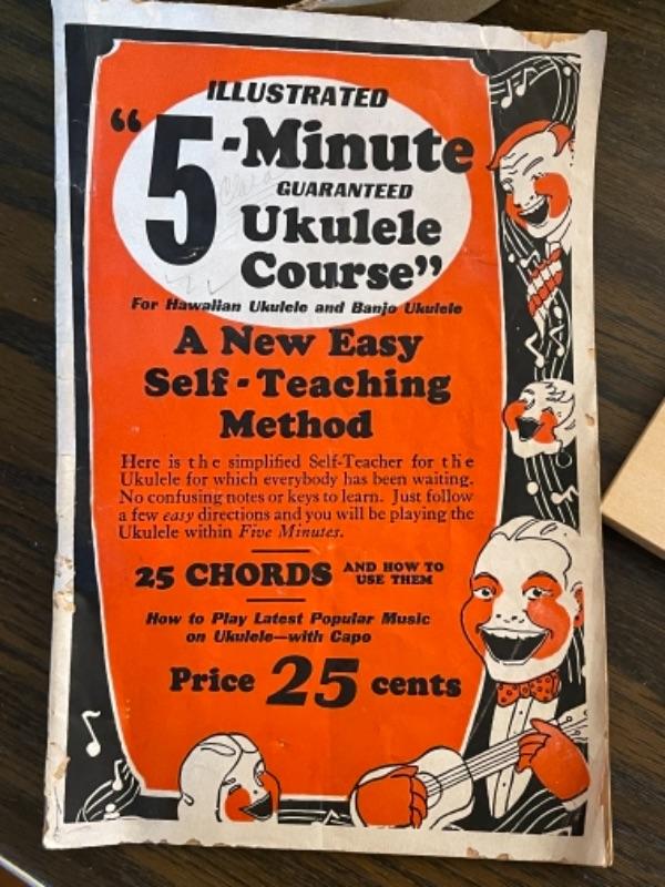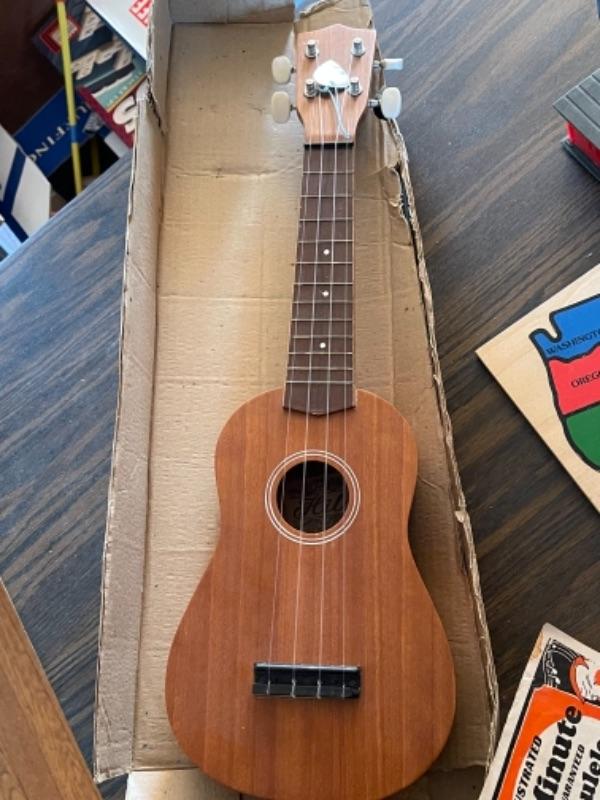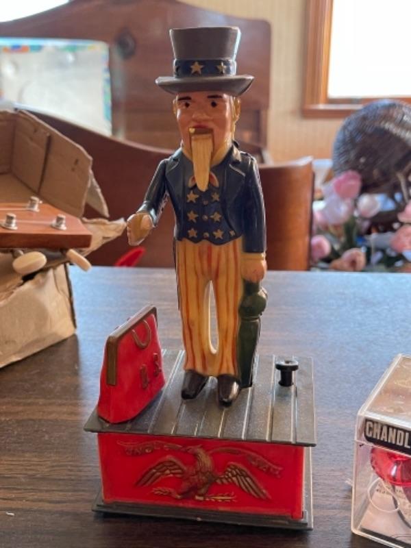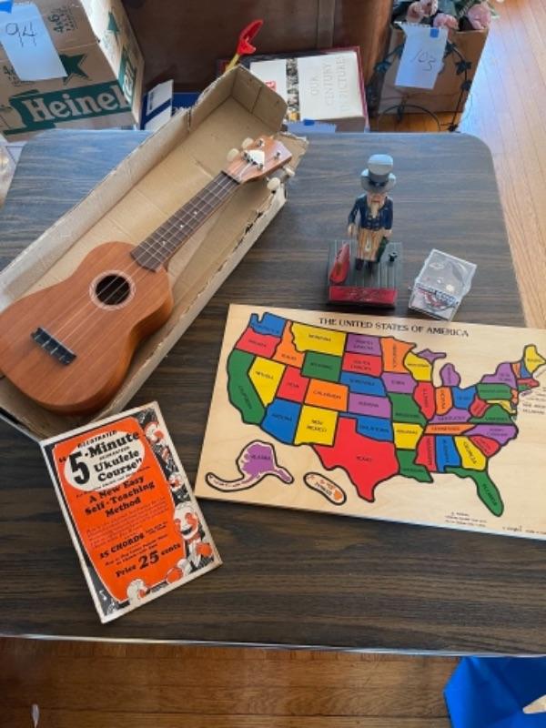 Lot 124. Vintage Hilo ukulele, made in Taiwan, with instruction book, United States puzzle, vintage Uncle Sam bank, vintage Chandler gyroscope--$35