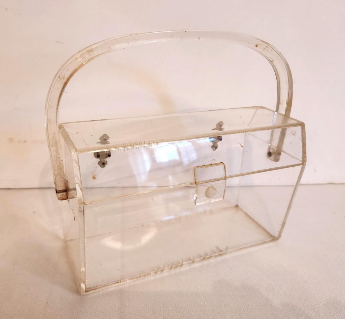 Vintage clear Lucite Purse with handle - measures 7" x 7" (not counting handle). Minor wear, scratching.