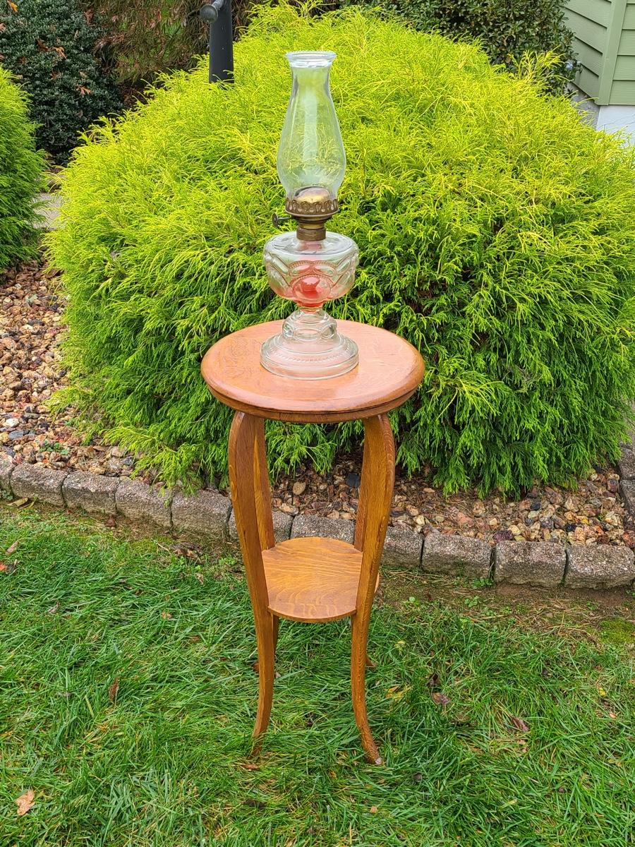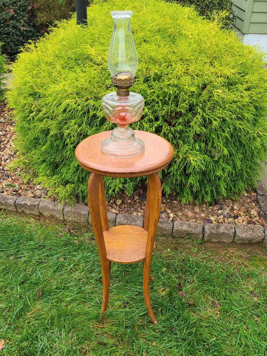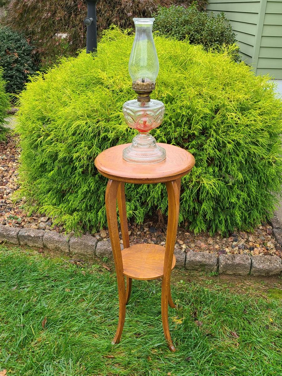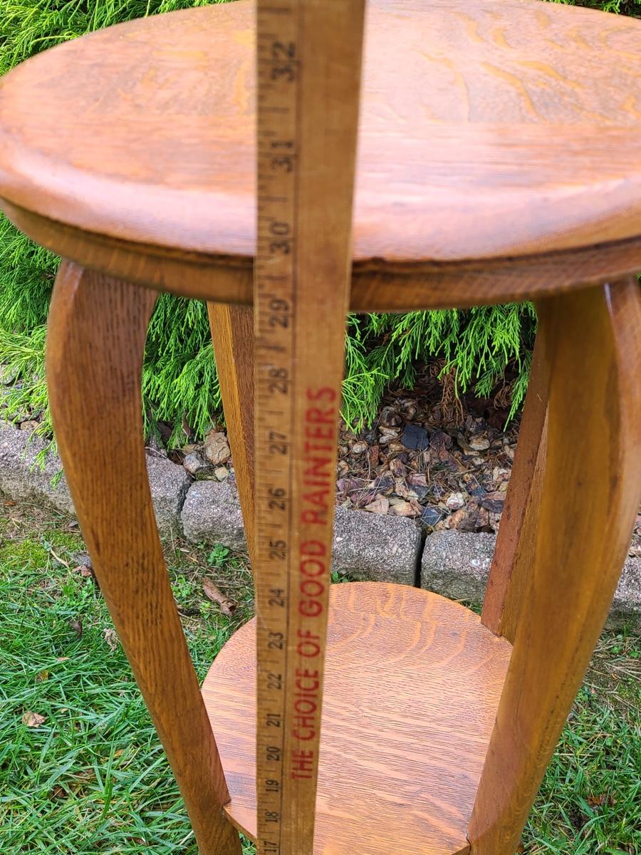 Vintage tall oak stand used as side table for lamp or plant, this is solid wood, but could use a light tightening. The lamp has eagle on turn switch. Please see all pictures as they are the best representation of the items. The pictures show condition, measurements if taken, and what is included in the lot. Due to the large amount that we photograph and the time frame, we are not always able to take measurements. All items unless noted, are pre-owned and have been used. If you purchased furniture, you must bring help. We do not allow one person to carry large furniture out on their own. Bring help, tools and a truck for the safety of our client’s homes, and your personal safety. Company policy. Thank you.