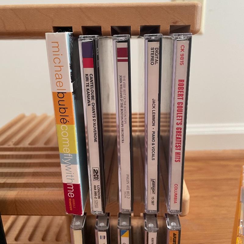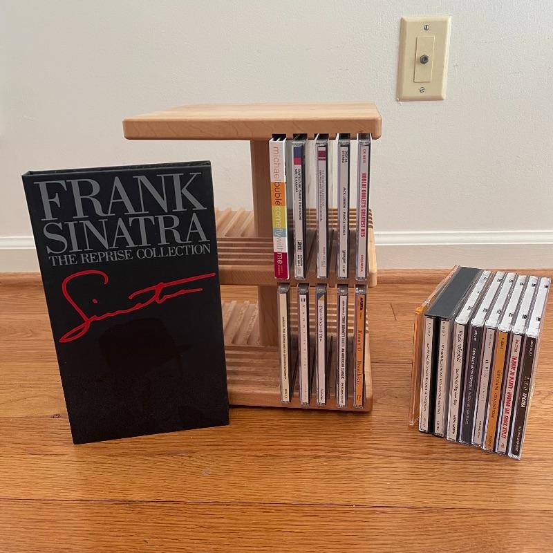 Here’s a small variety of CDs and a nice rotating wooden CD rack. Artists include Jack Lemmon, Kenny G, Michae Bublé, Frank Sinatra and more. See images for titles. All cases contain the CDs stated on the case, but we have not verified the conditions. Local pick up only.