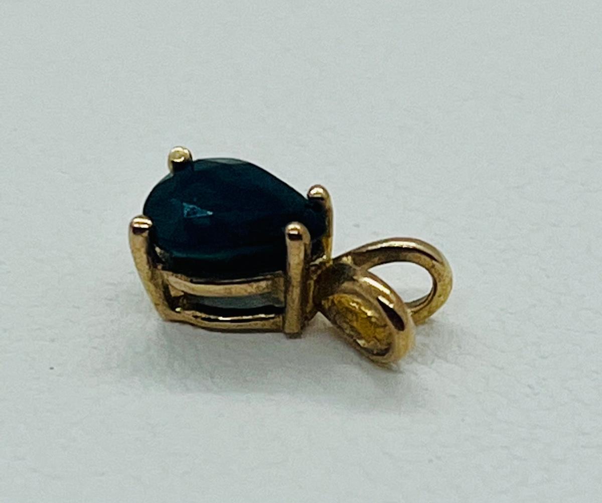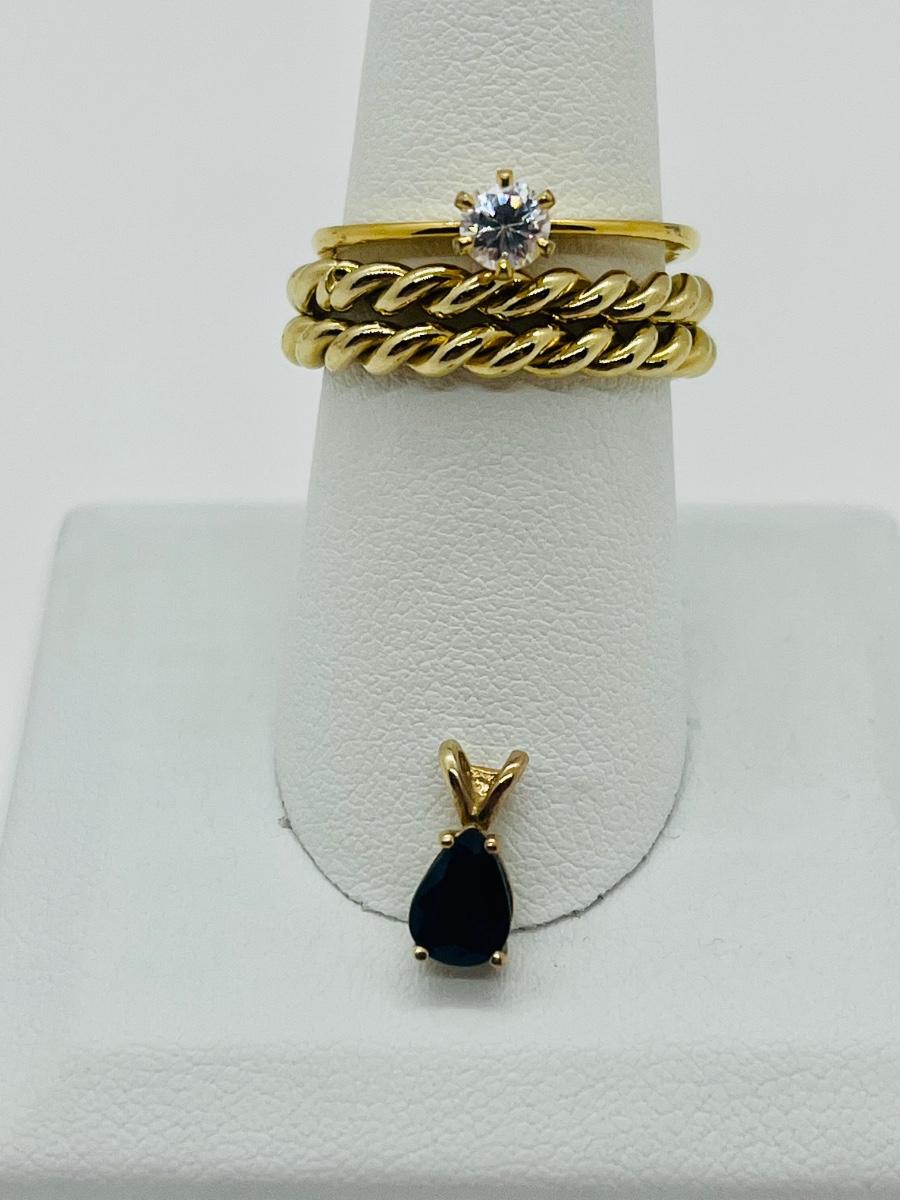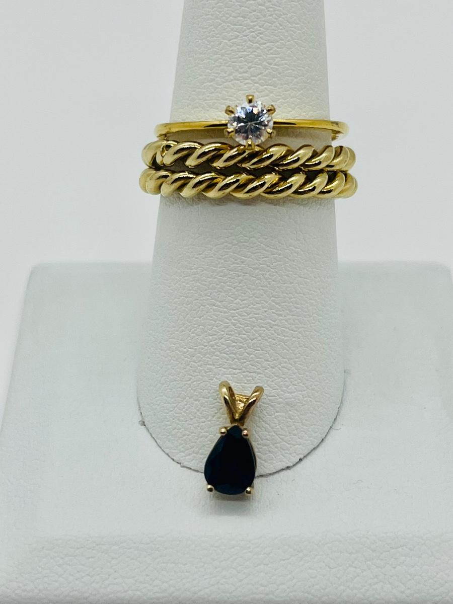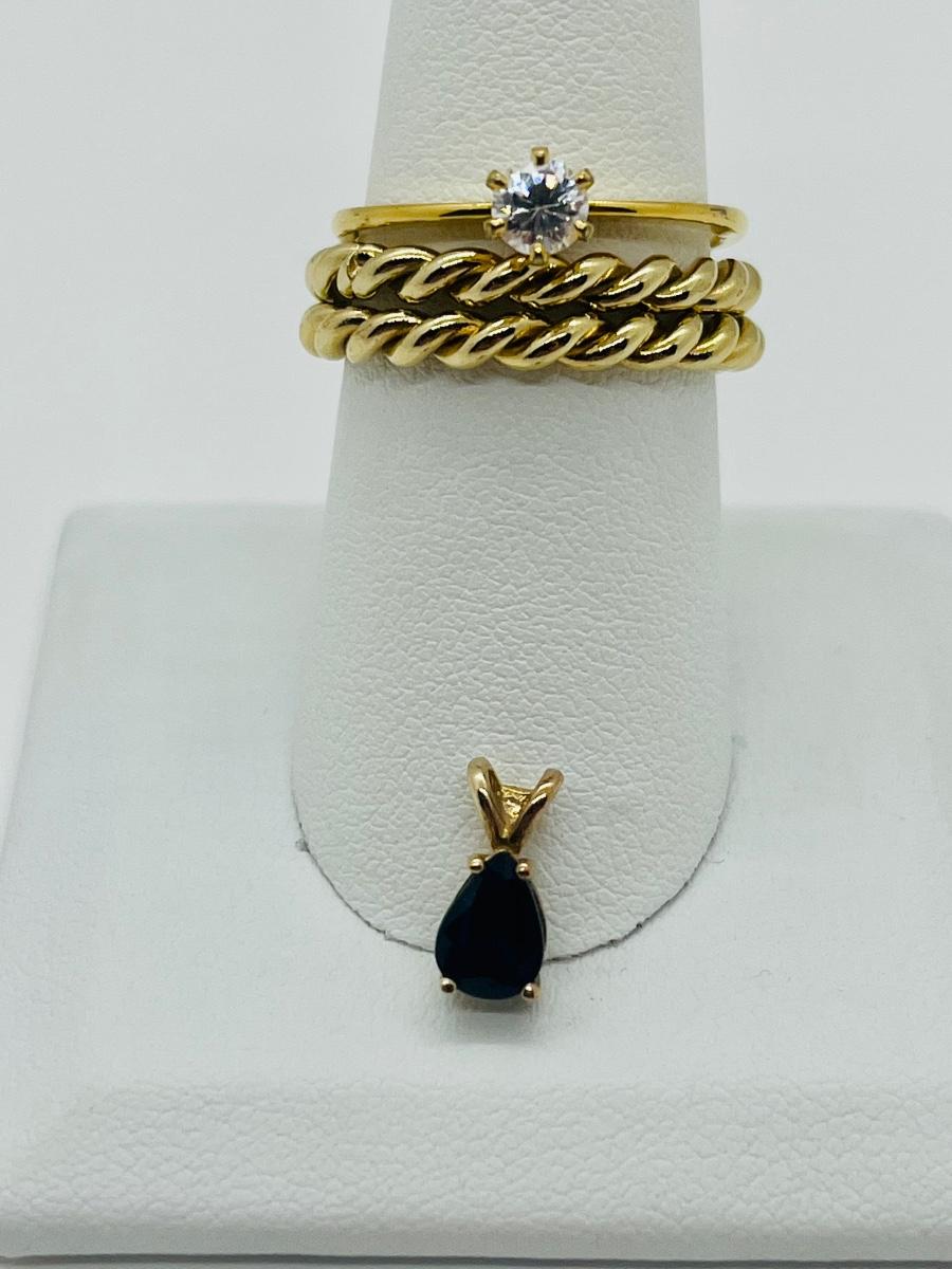 Lot 125: 10k gold lot- Blue Sapphire Pendant, CZ Solitaire & 2 Twist Rings