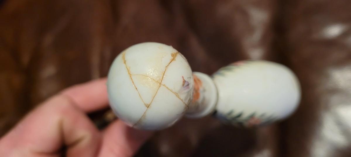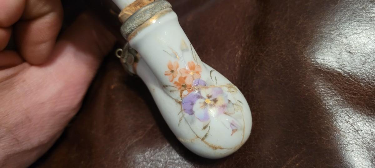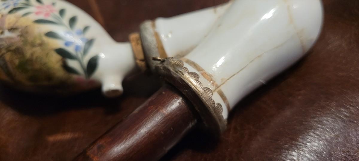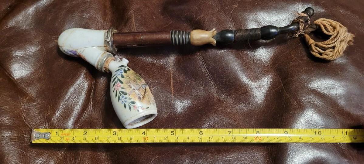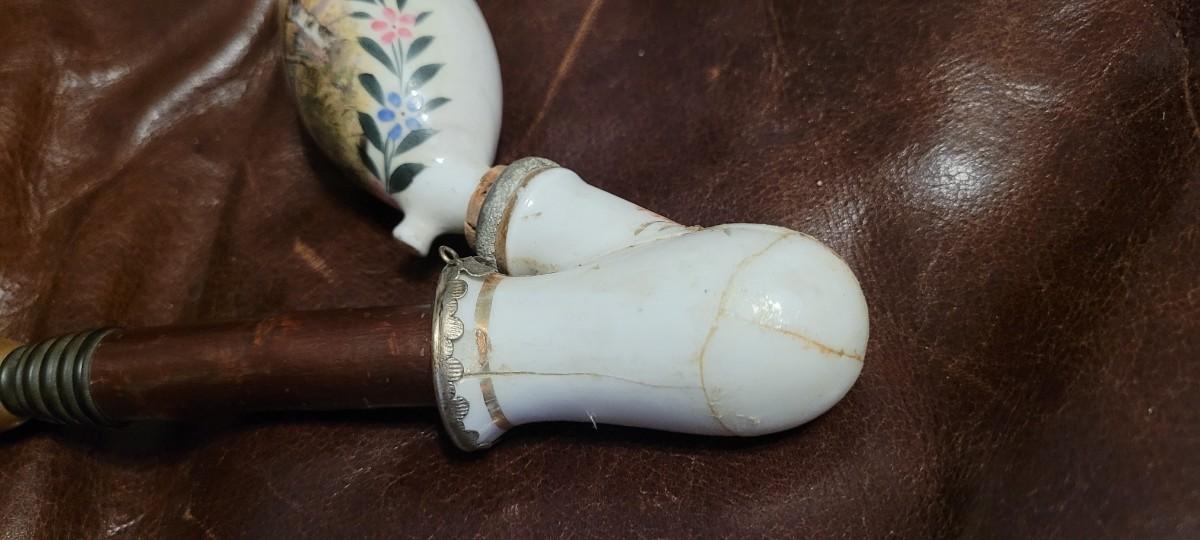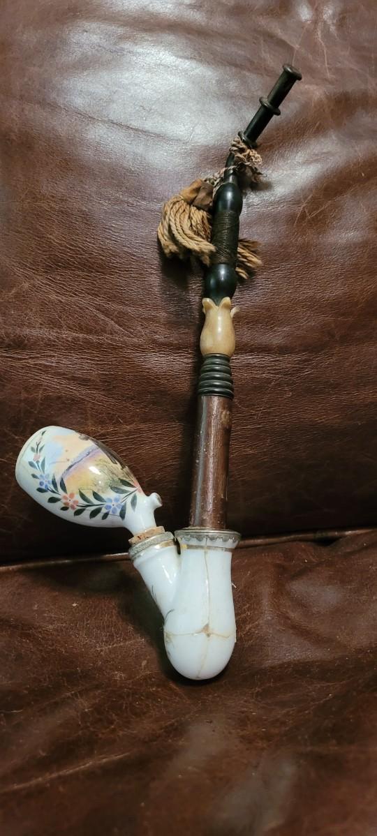 This Antique Porcelain Hand Painted Smoking Pipe has been repaired previously but is complete. Great collector's item.