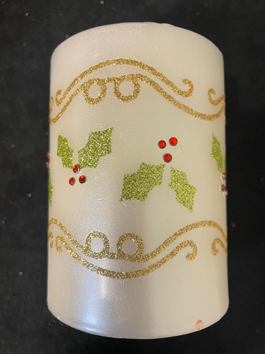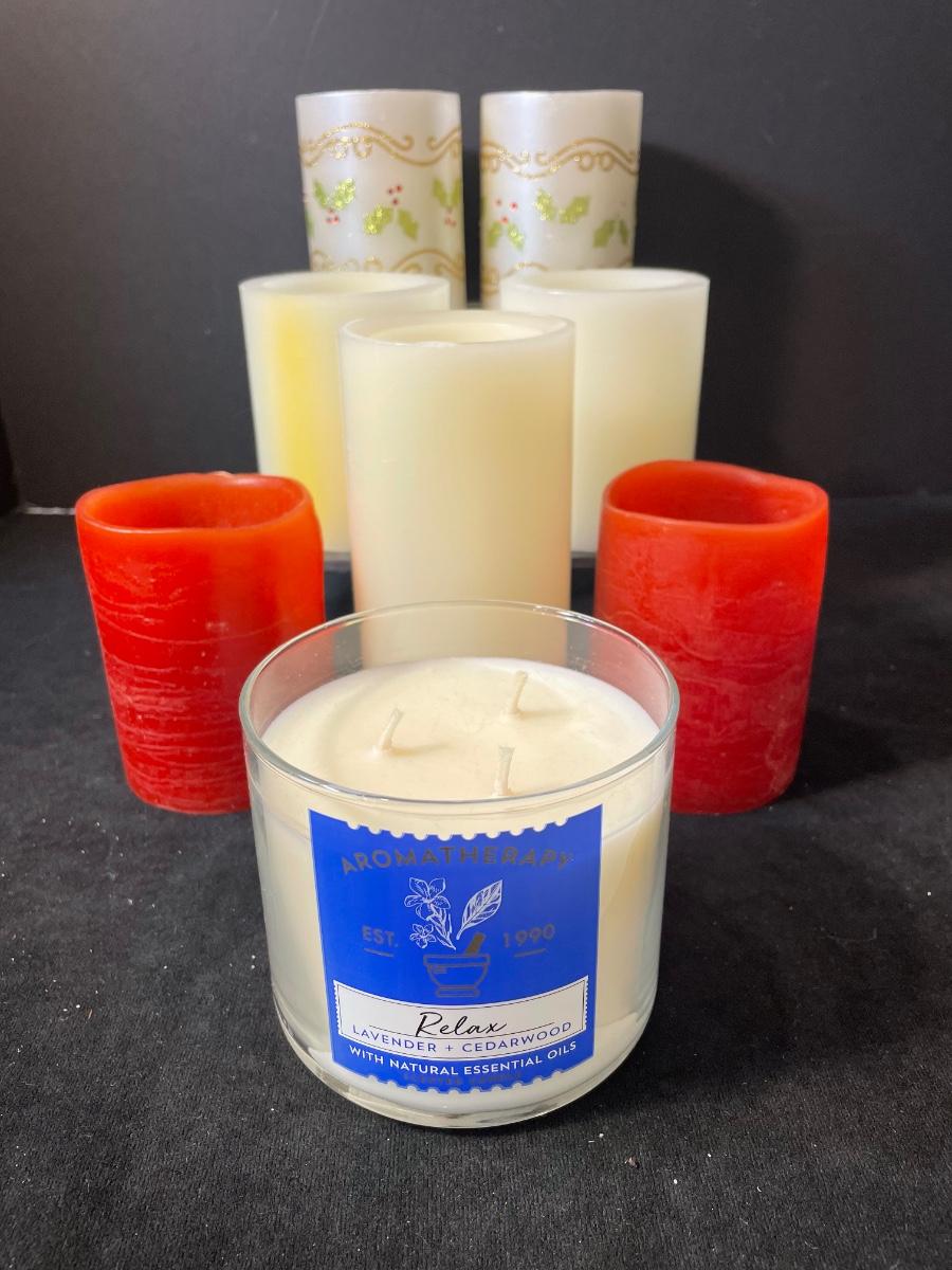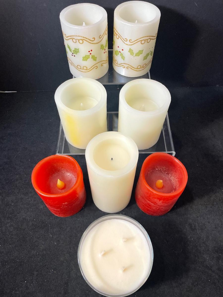Includes 8 candles, most are flameless. 2 are Christmas themed.