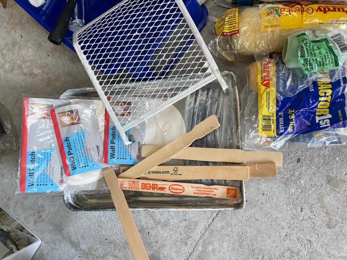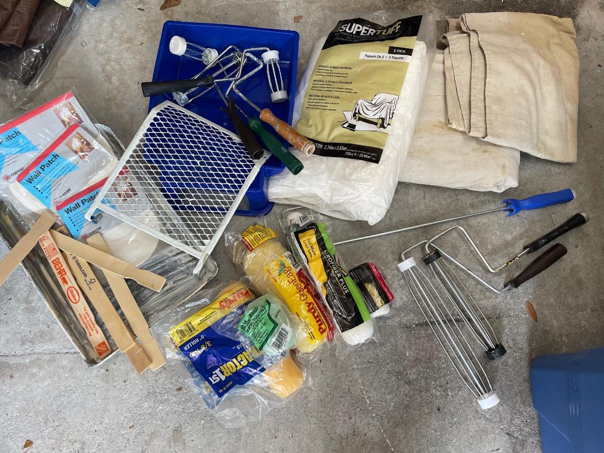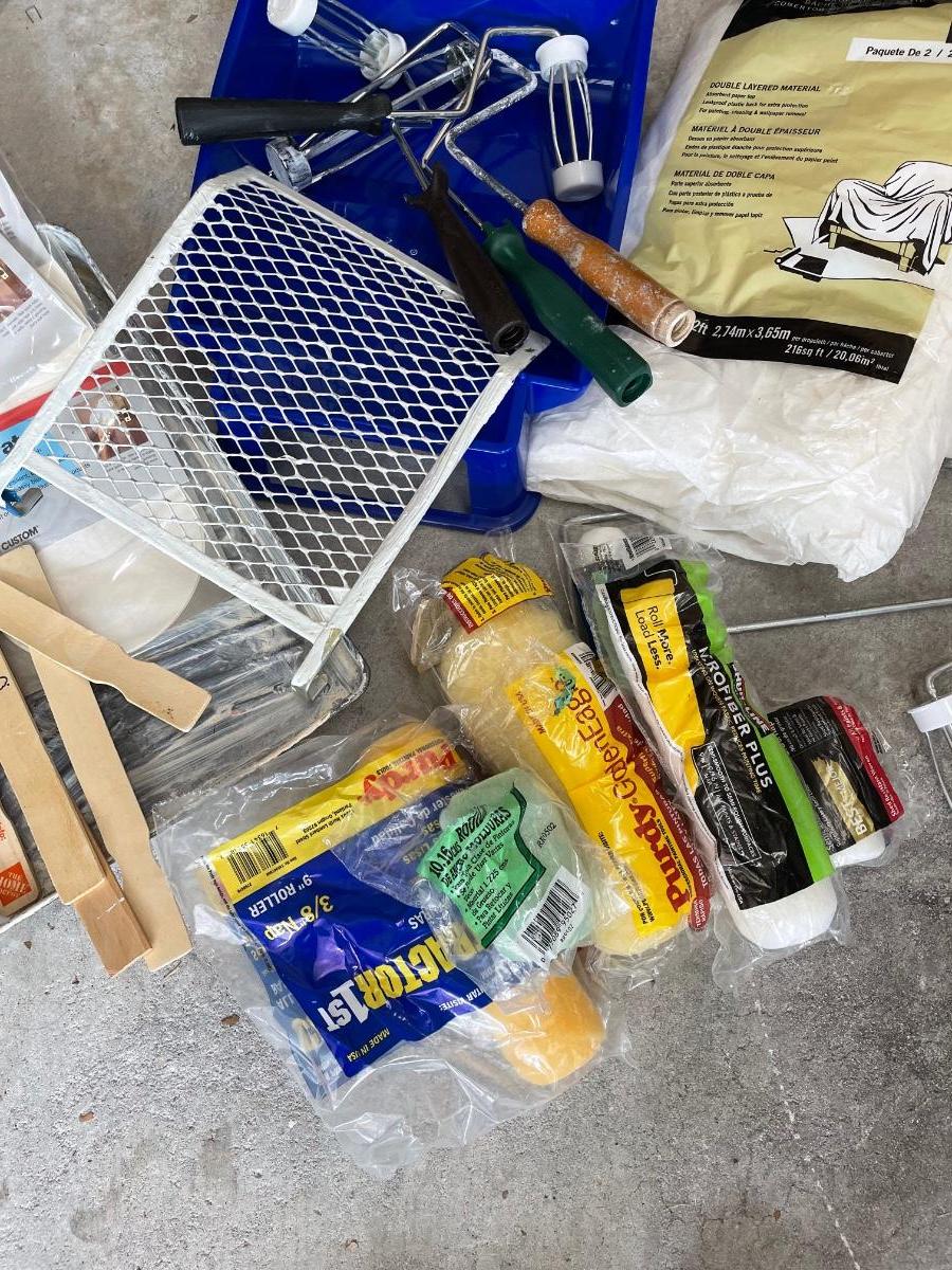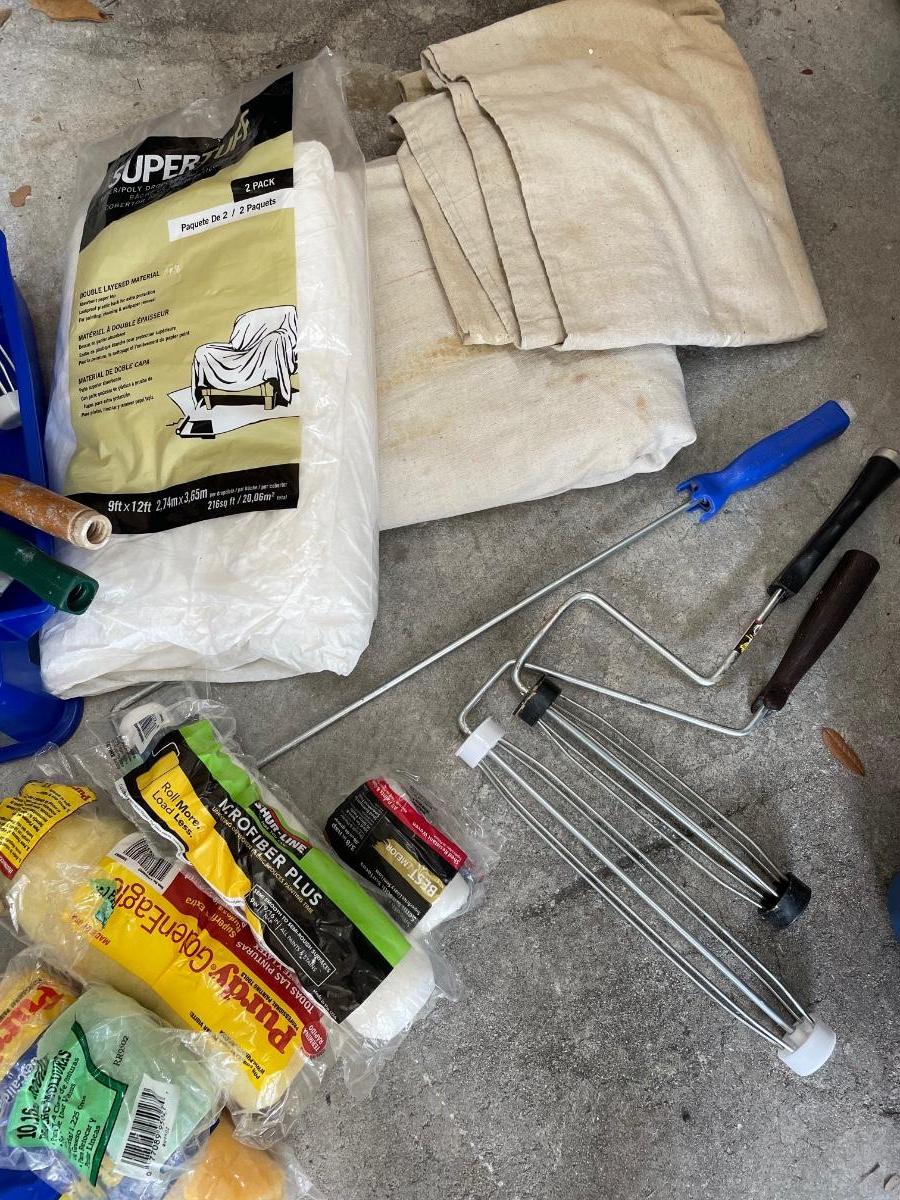 Assortment of rollers and covers, roller trays and drop cloths