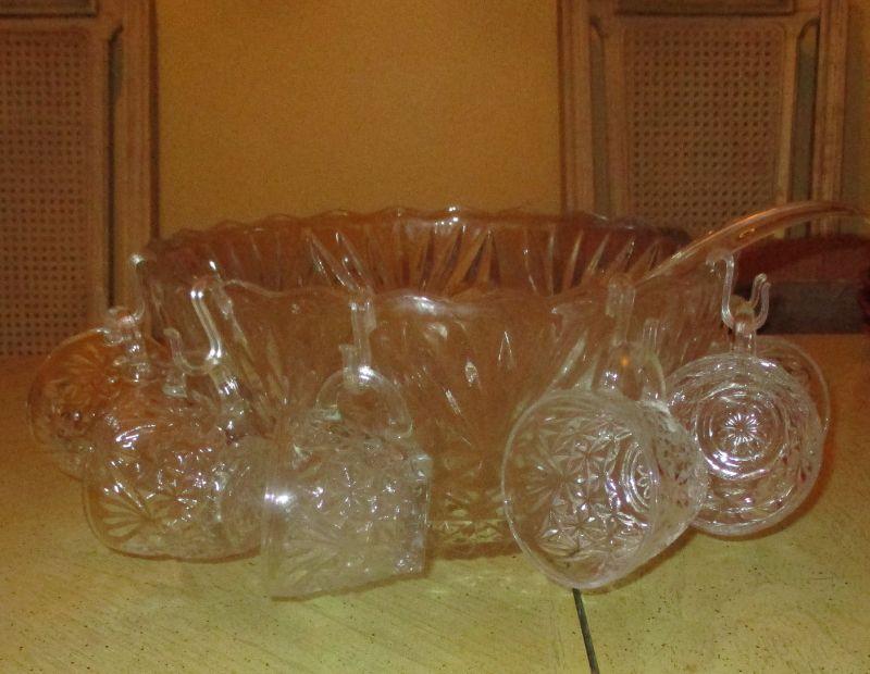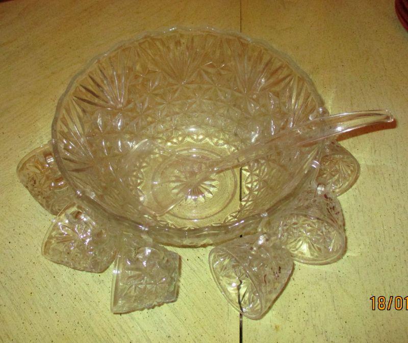 This pattern was made by Anchor Hocking. I can't find a date range, but it was more late 1960's - 1980's. The lot contains the bowl, 6 cups, 6 plastic hooks, and a plastic ladle. All in excellent condition.