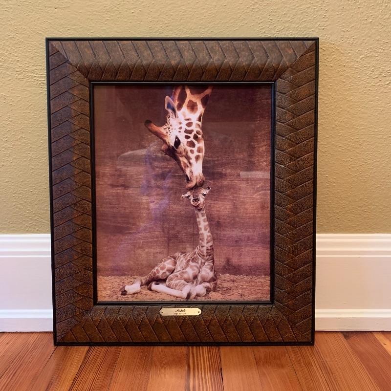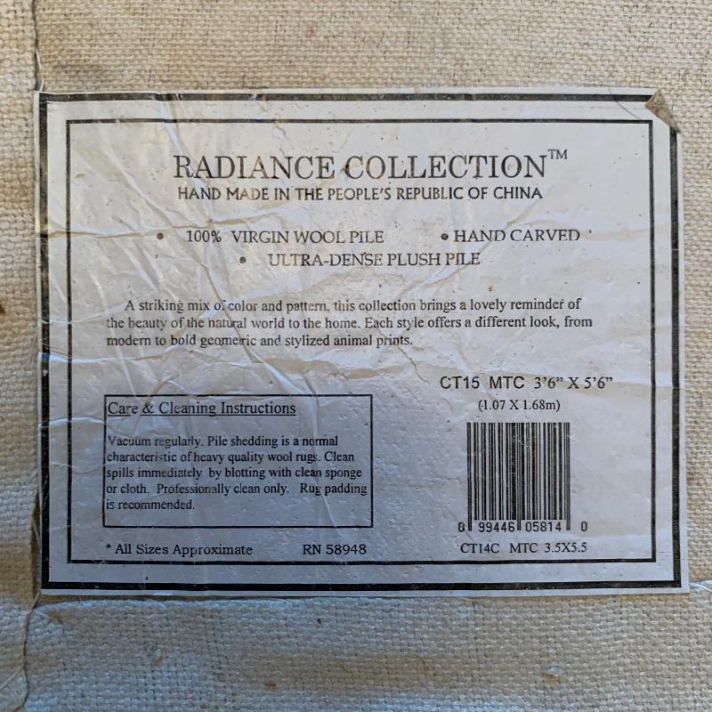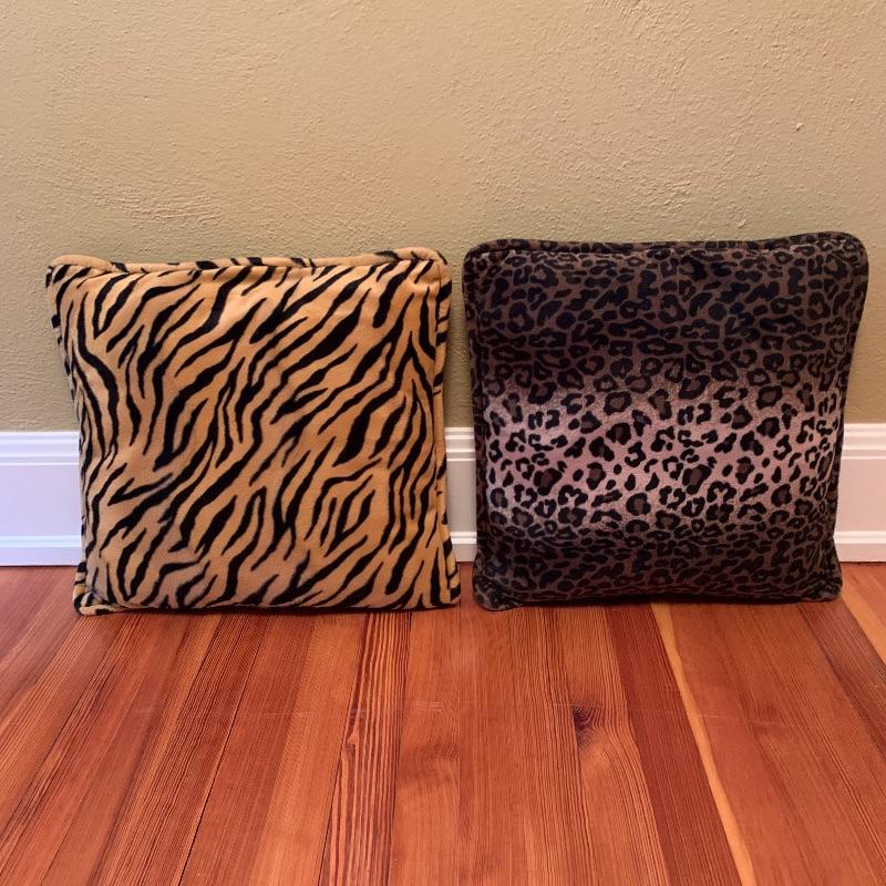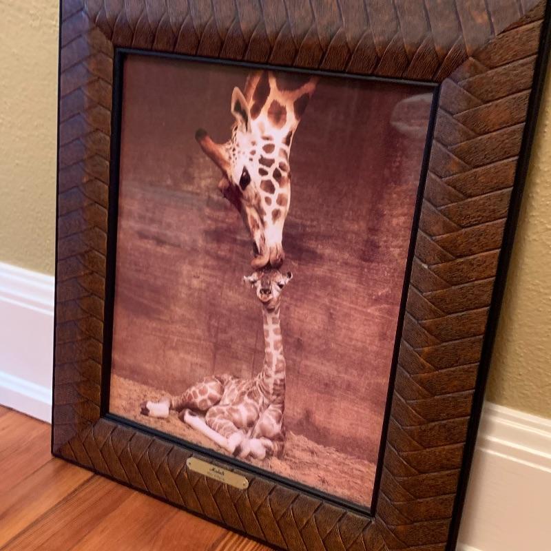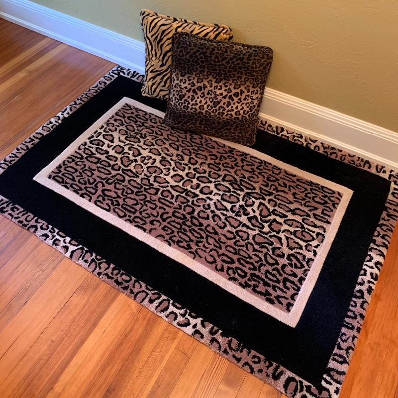 This lot includes an animal print rug, two plush animal print pillows, and a framed print of giraffes. The rug measures 3.5’ x 5.5’. According to the tag it is Radiance Collection brand, made in the USA, 100% wool pile. The two pillows are plush and velvety. One has a tiger print and the other is a leopard print. They have a little dog hair on them and could use a cleaning. They measure 19” x 19”. The framed artwork is a sweet print print of two giraffes. The frame is plastic and measures 19” x 22.5”, with a wire for hanging. It has a plaque that says “Makalu, Ron D’Raine”. Shipping available.