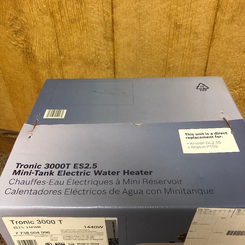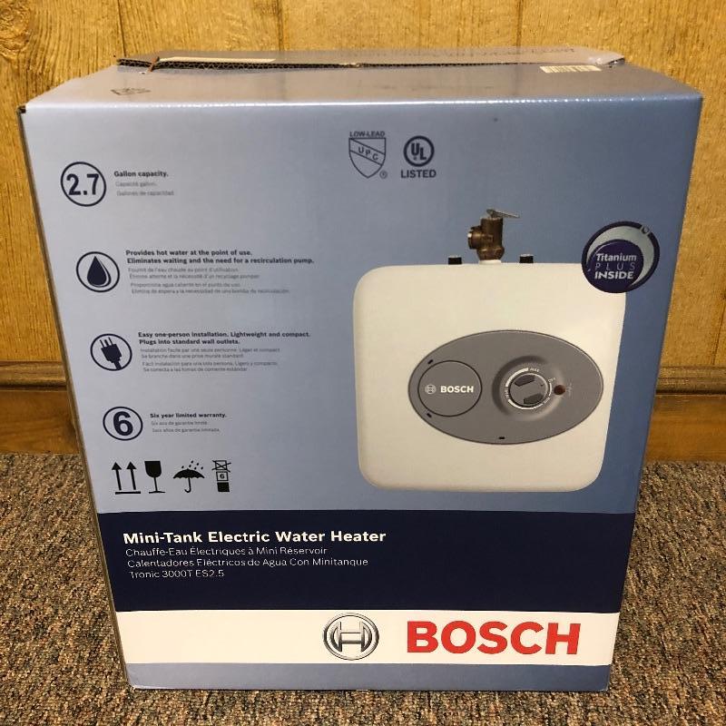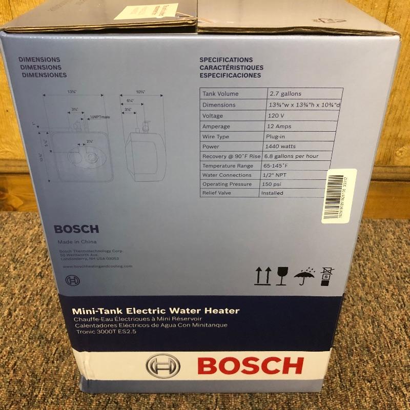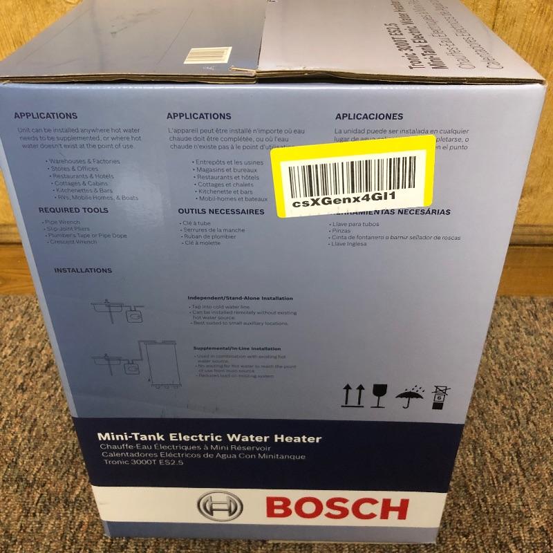 This lot is a Bosch electric water heater. This heater has a 2.7 gallon capacity. The staples are intact (pictured) and the box appears to have not been opened. Water heater measures 13.75”W x 10.75”D x 13.75”H.