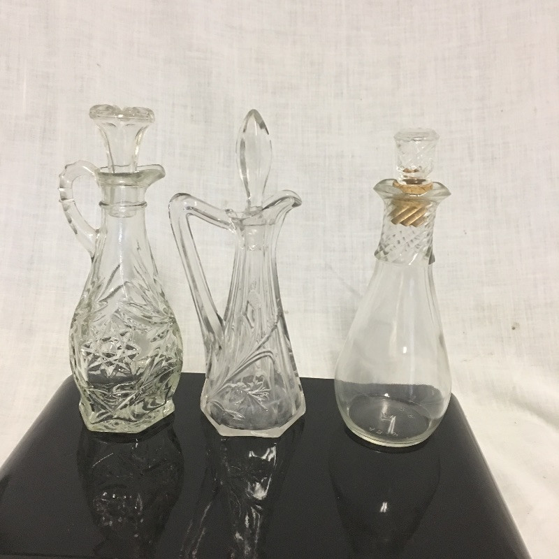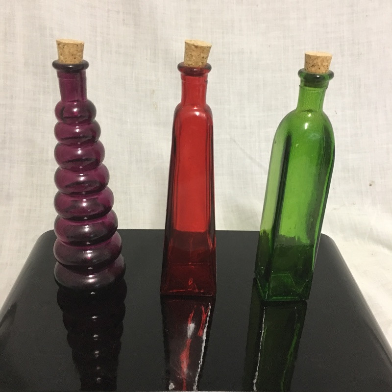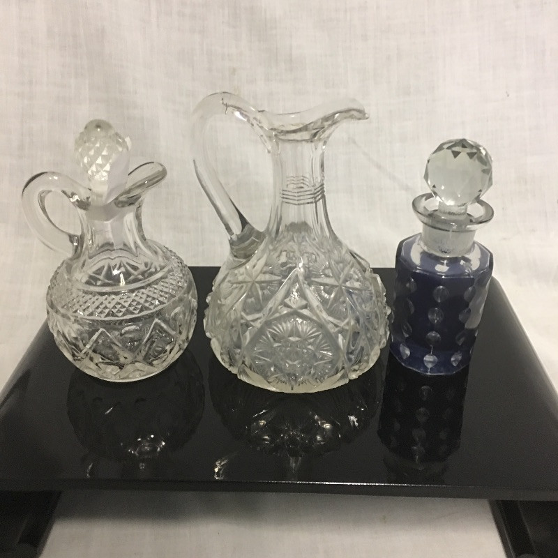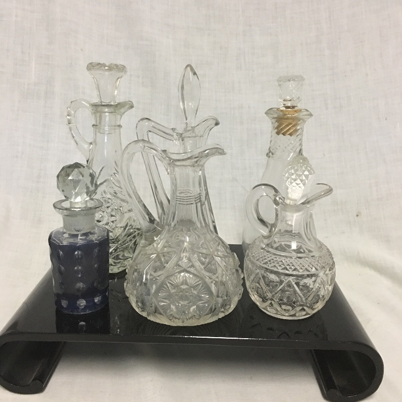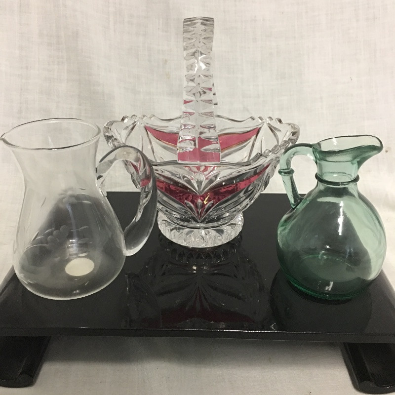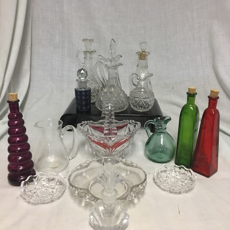 Superb selection of colored glass bottles, pitchers, bowls, basket and more. This quint lot would make a great display in your cabinet.