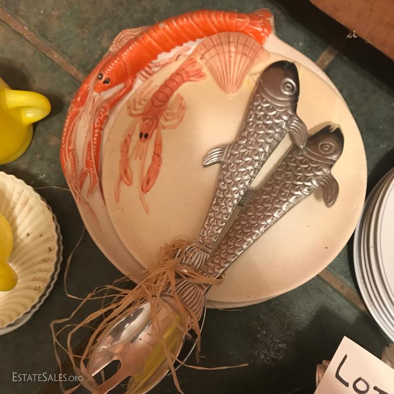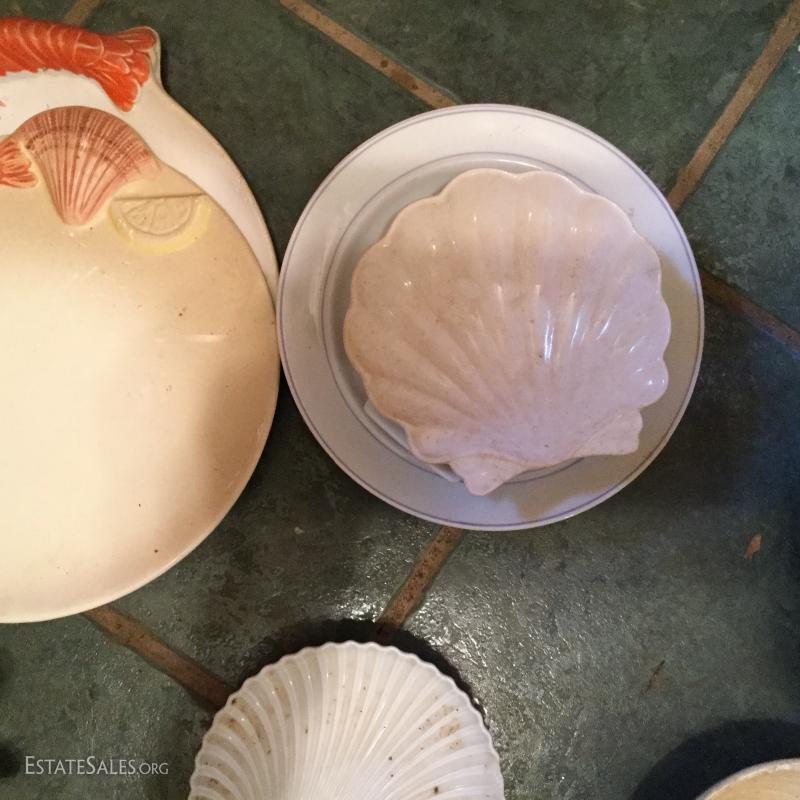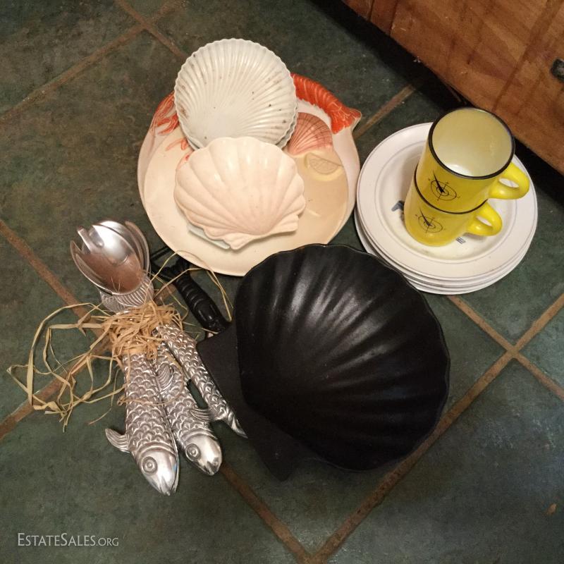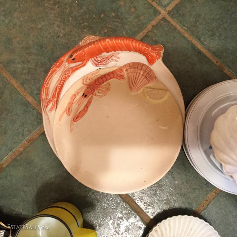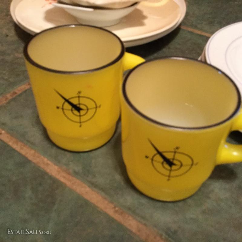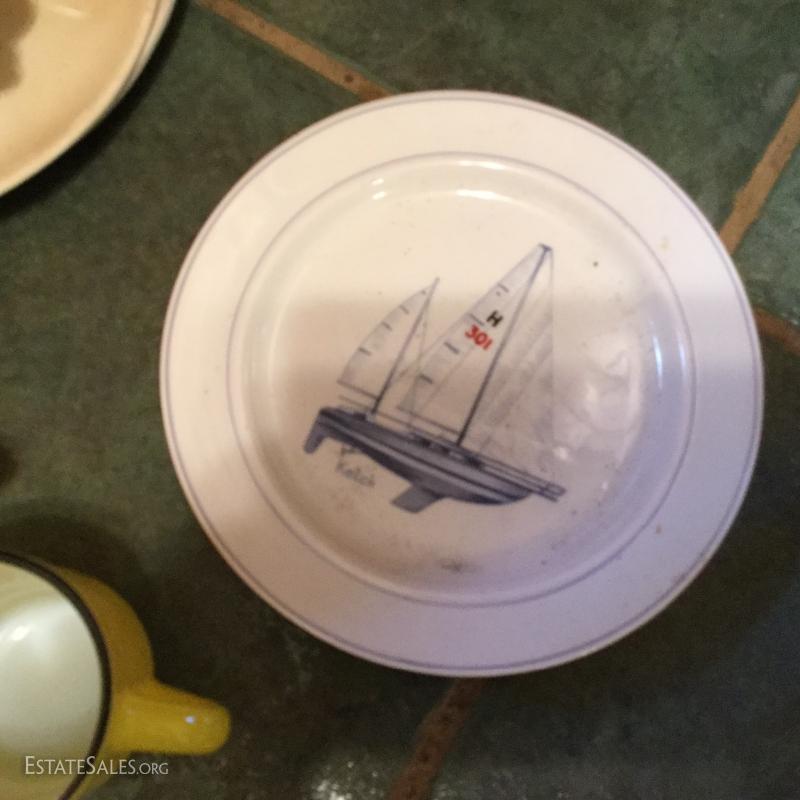 Set of five sail boat plates by Saks Fifth Ave, 2 Anchor Hocking/Fire King yellow coffee cups, multiple Apilco Au Gratin baking and souffle dishes and more.