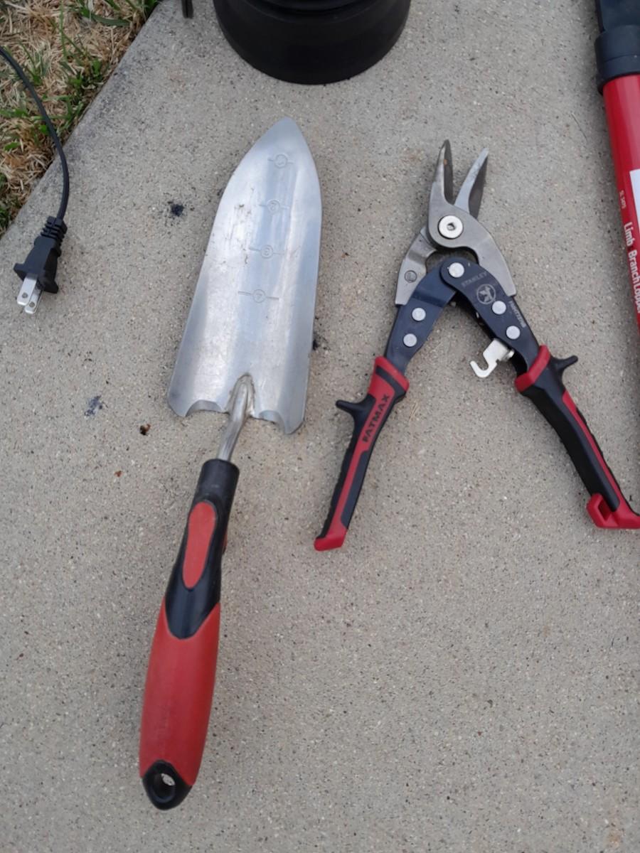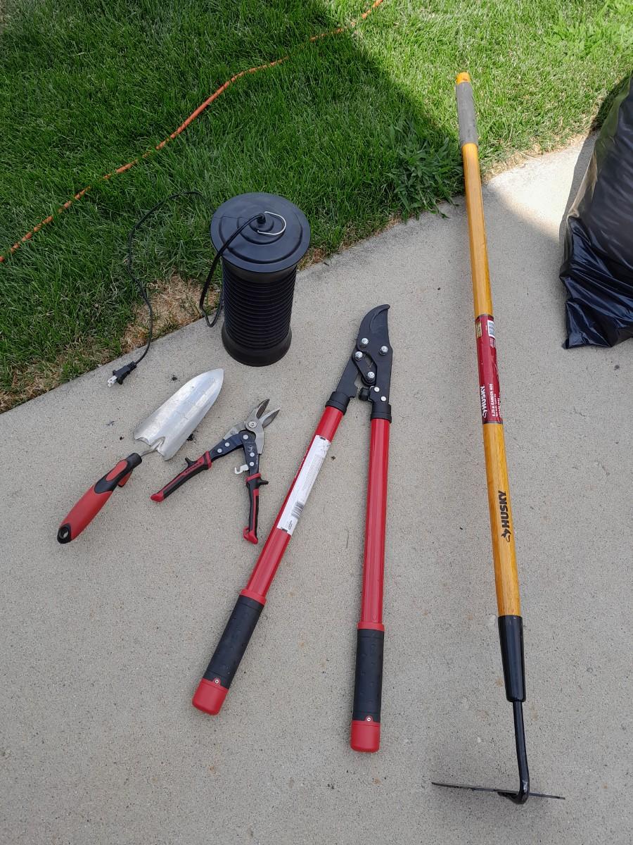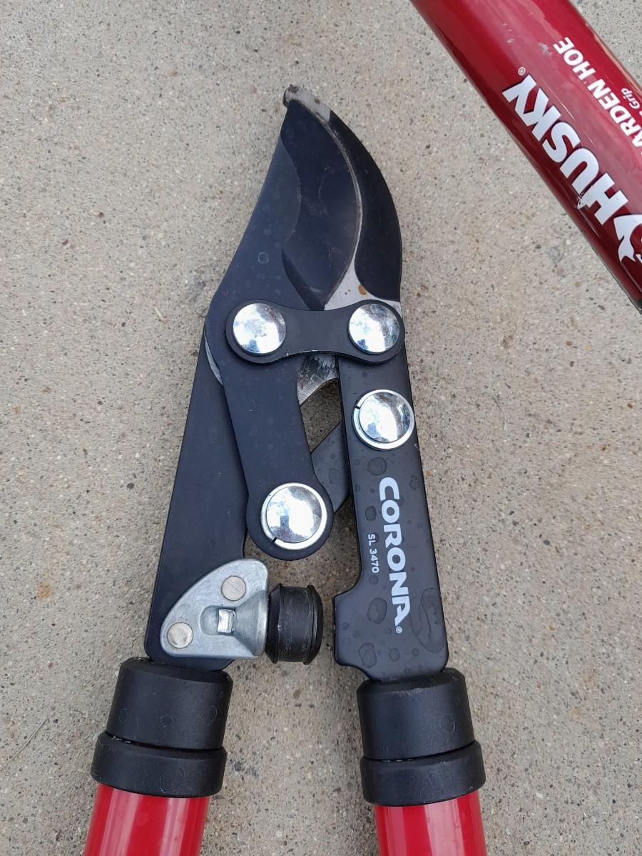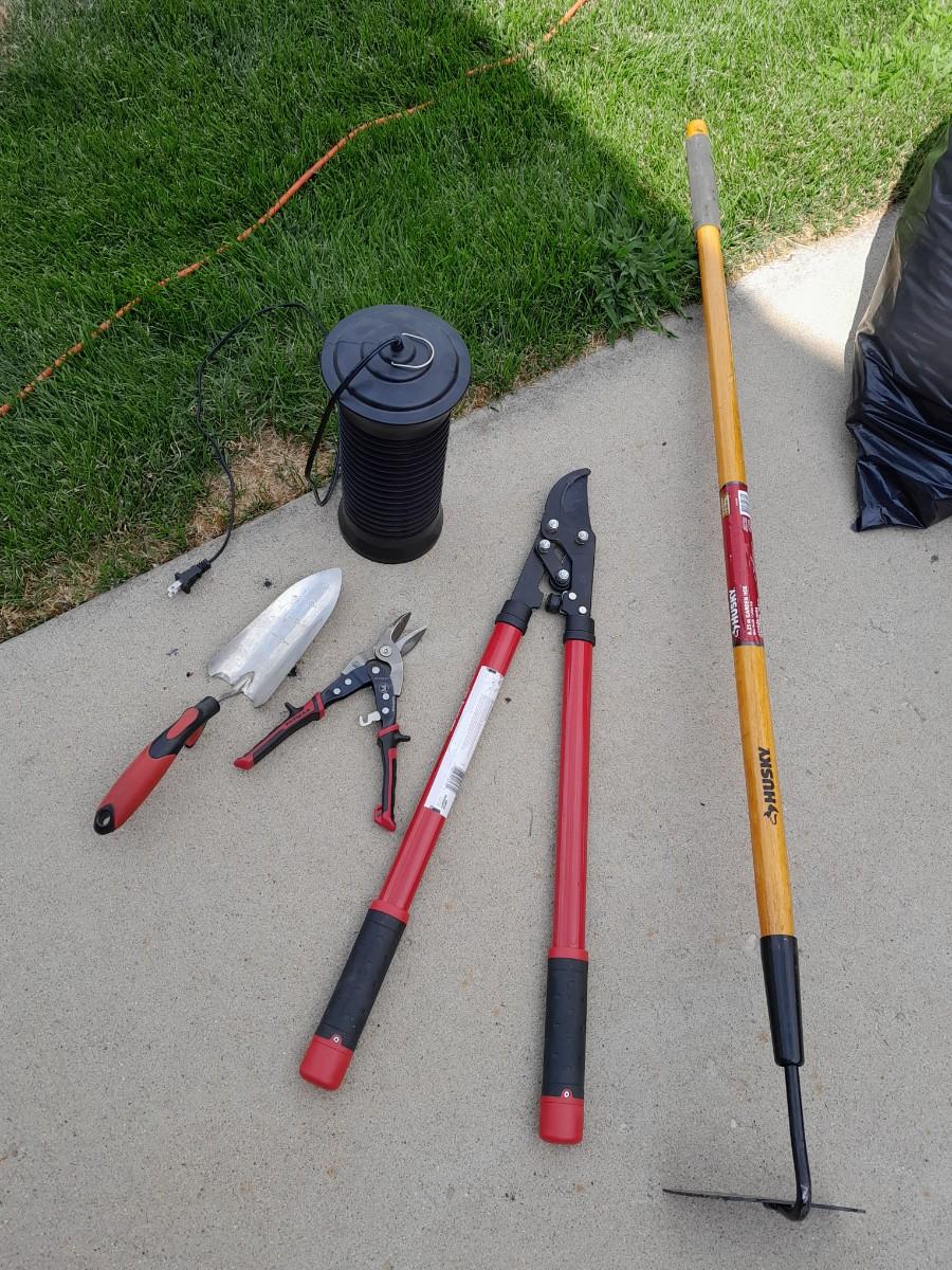 GARDENING TOOLS, CORONA EXPANDABLE 1 1/2" CUT LOPERS, SMALL SHOVEL, YARD HOE, SMALL BUG ZAPPER AND MORE