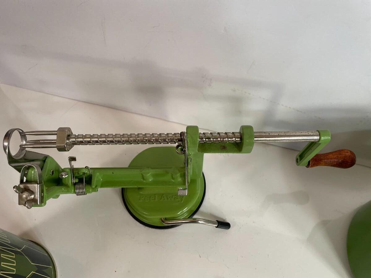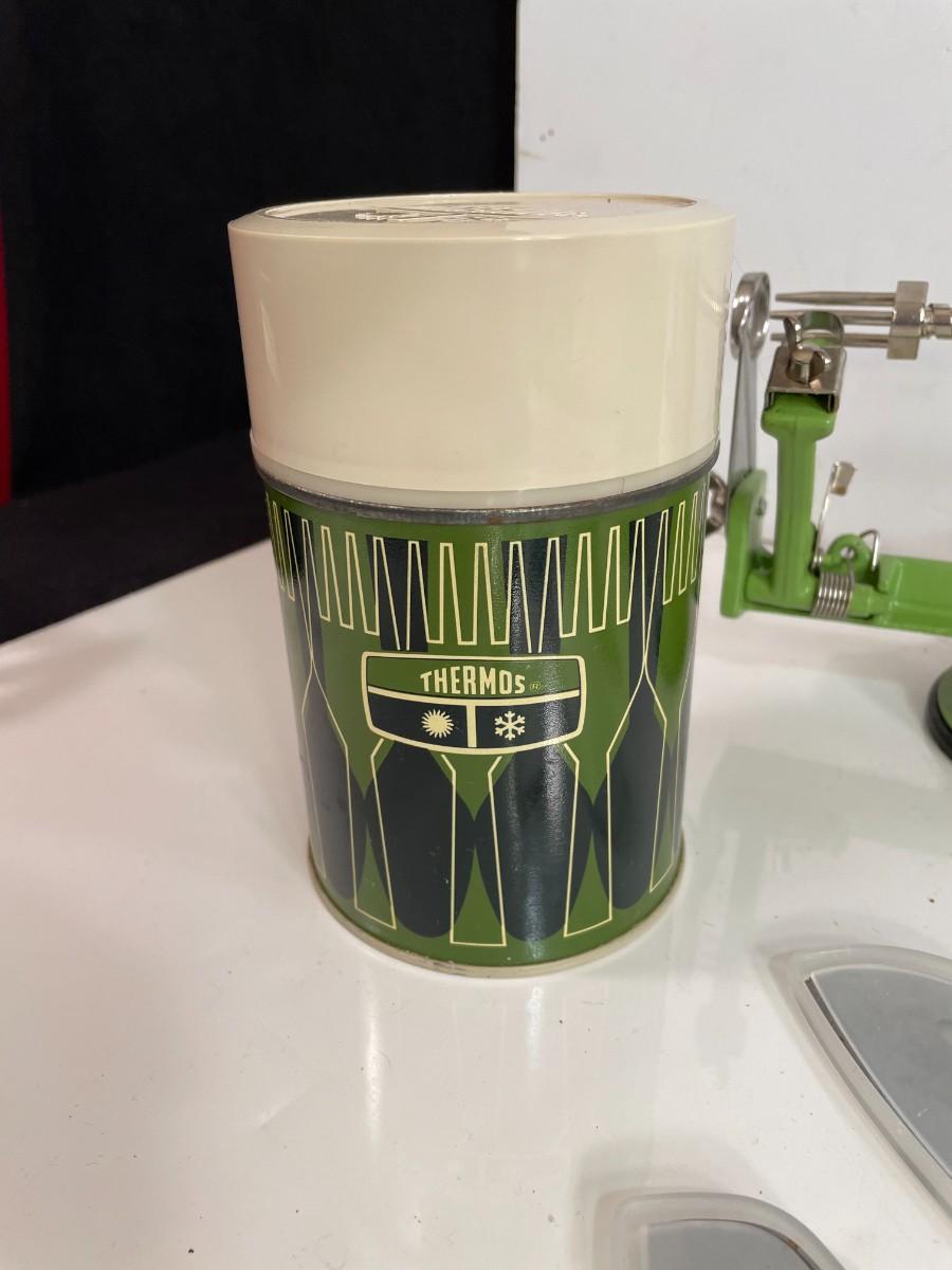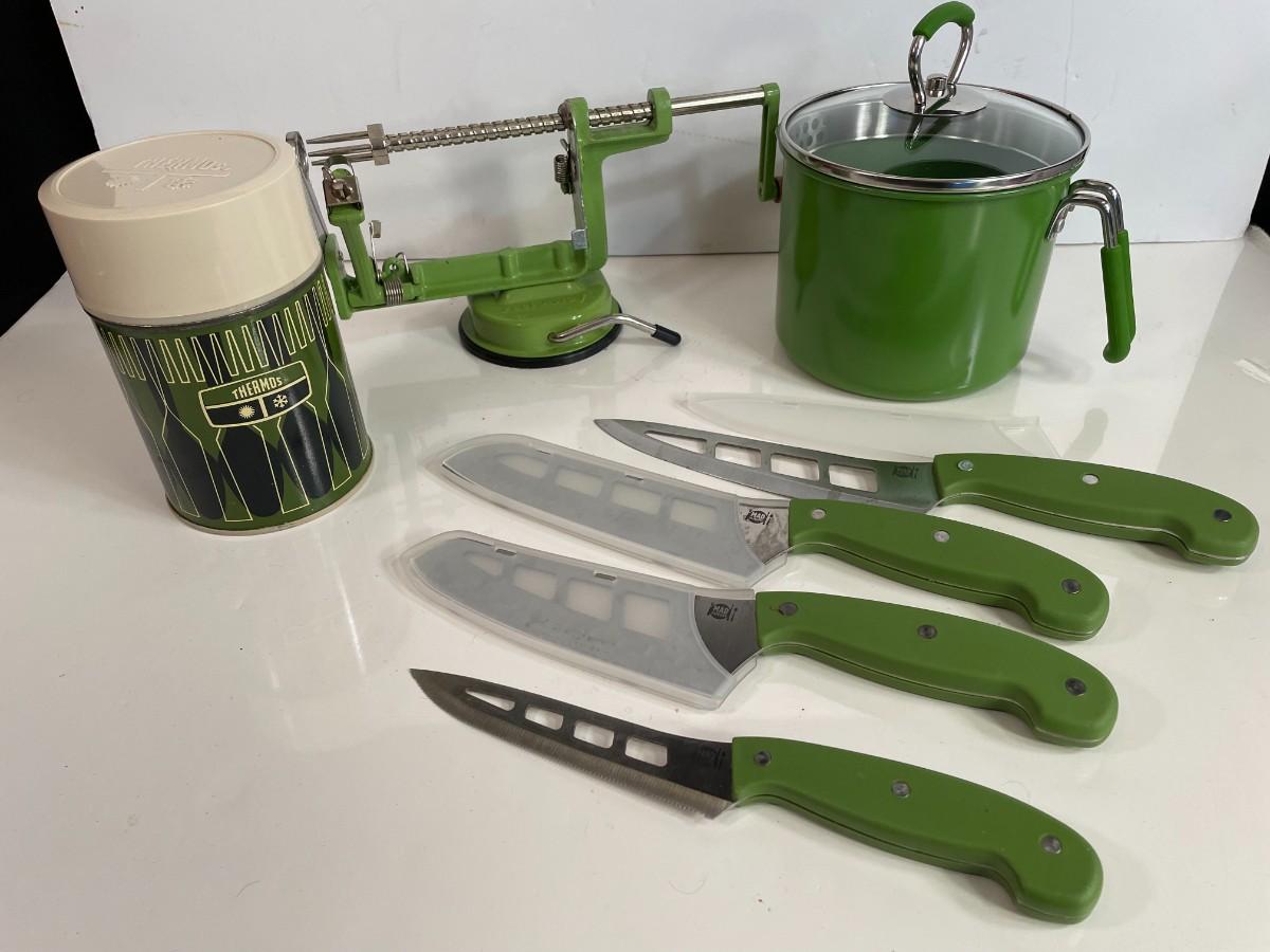 Lot 125  Green Thermos, Kuhn Rikon Swiss Pot, Mad Hungry Knives, & Green Easy Peel Peeler