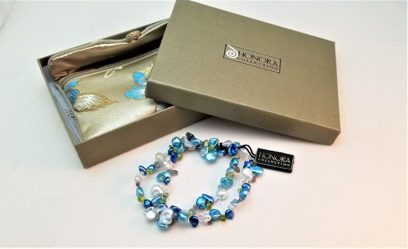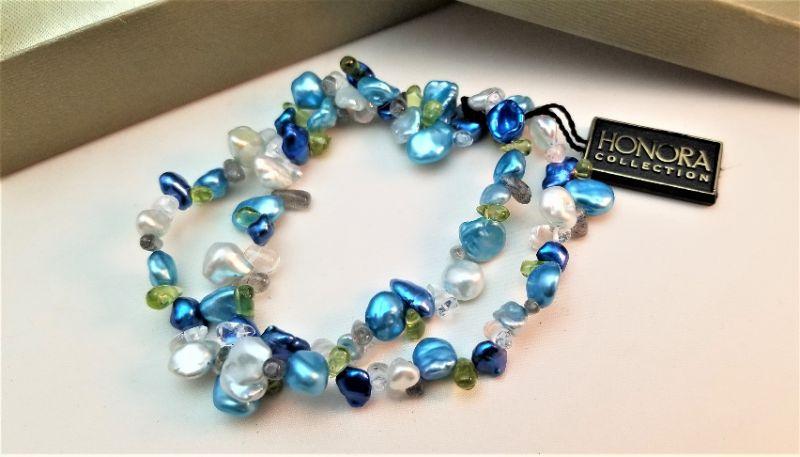 Nice HONORA brand natural pearl stretch bracelet in the colors of the sea - blues, pearlized white, and seafoam green. Original packaging. Double strand.