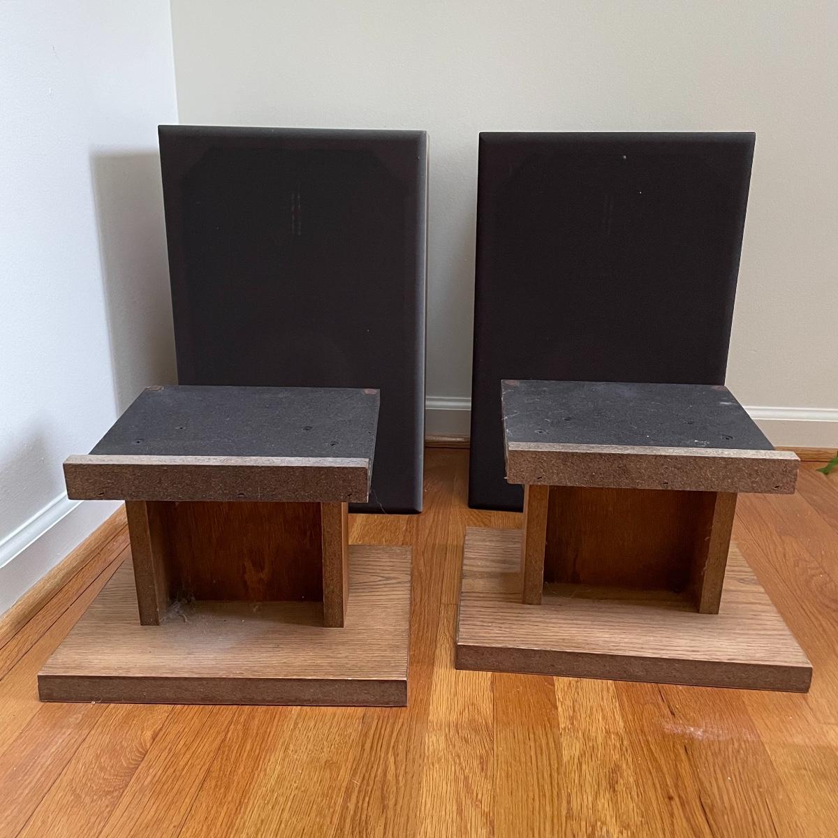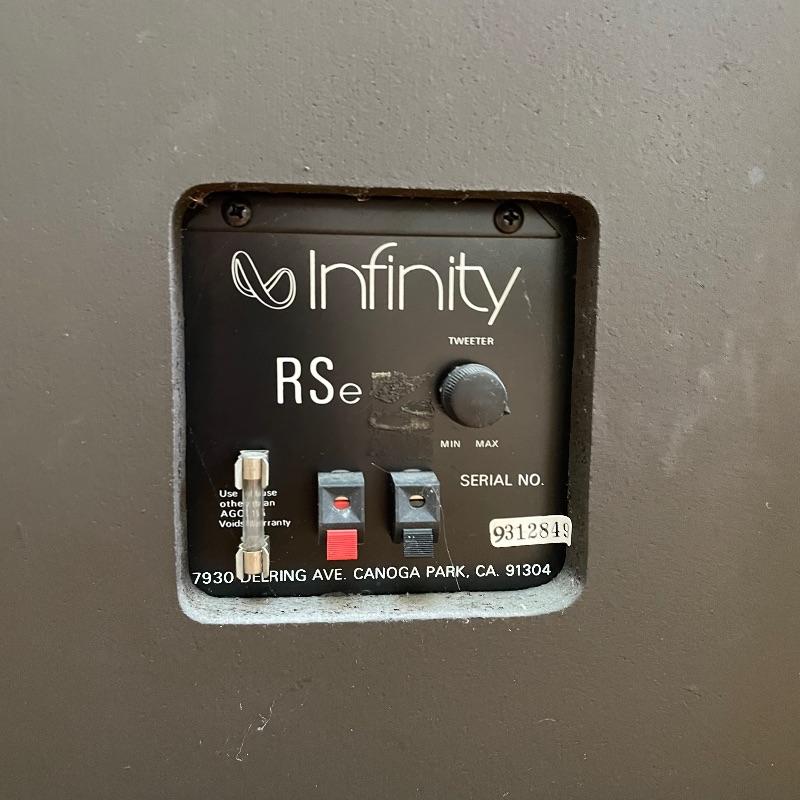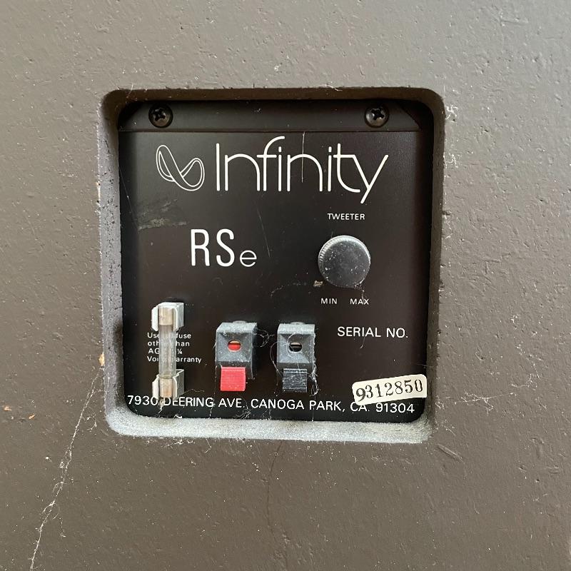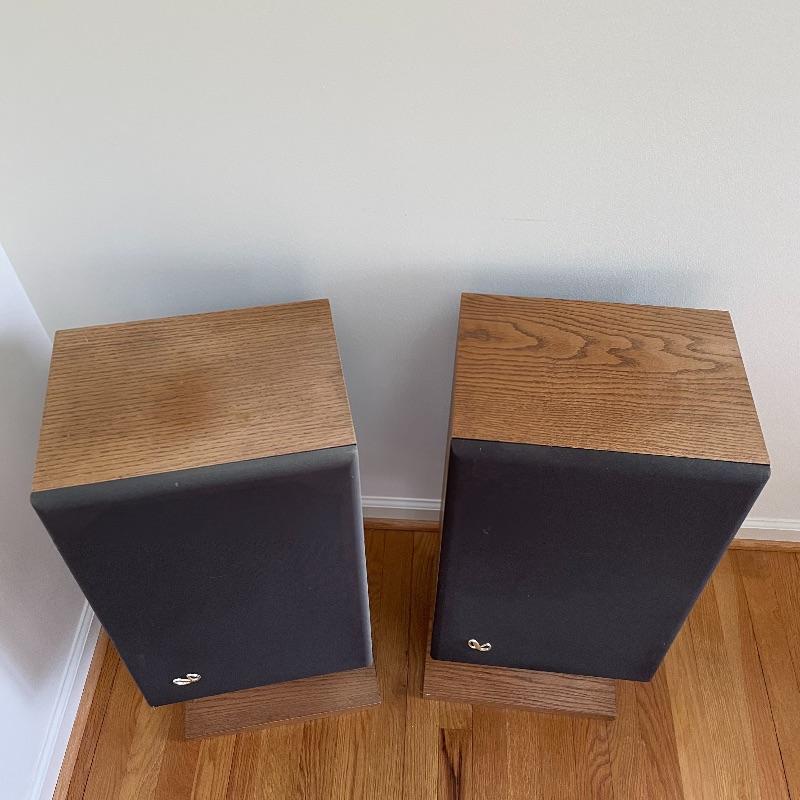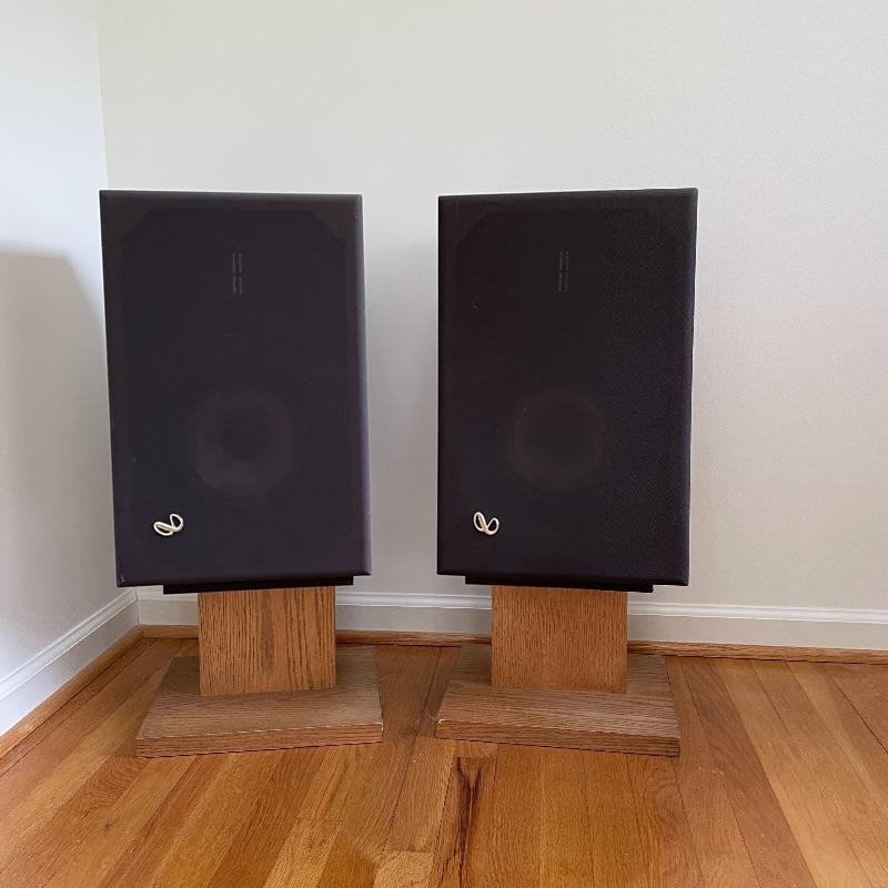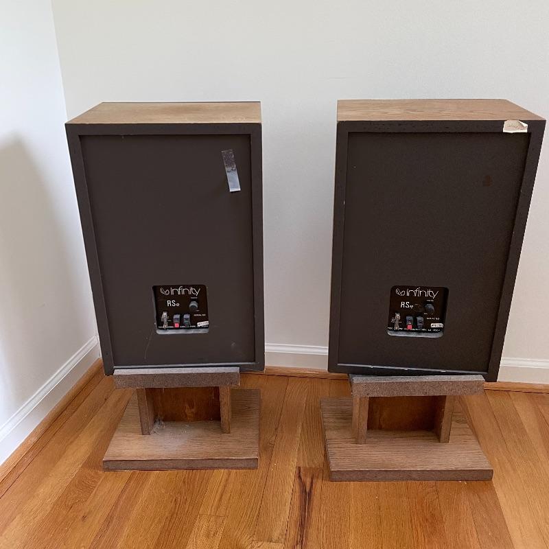 Two nice looking Infinity RSe floor speakers with wooden stands. Both speakers show a little sun bleaching, one is more pronounced than the other. Stands appear to be pressed wood. Speakers appear in great shape on the outside, but show some needed repairs to the woofers when covers are removed. One speaker alone measure 13” x 10.25” x 20”. The stands add about 8.5” to height. See images. Shipping available. Each Speaker has a substantial weight and stands are not connected. Please call UPS with dimensions at 828-252-6930 for a shipping quote prior to bidding.