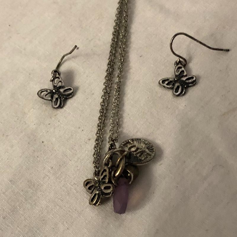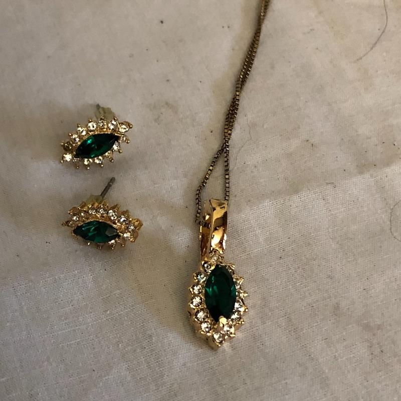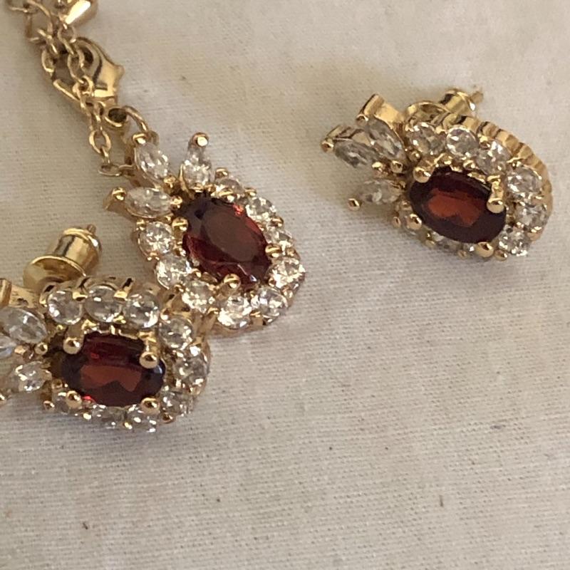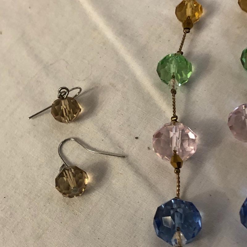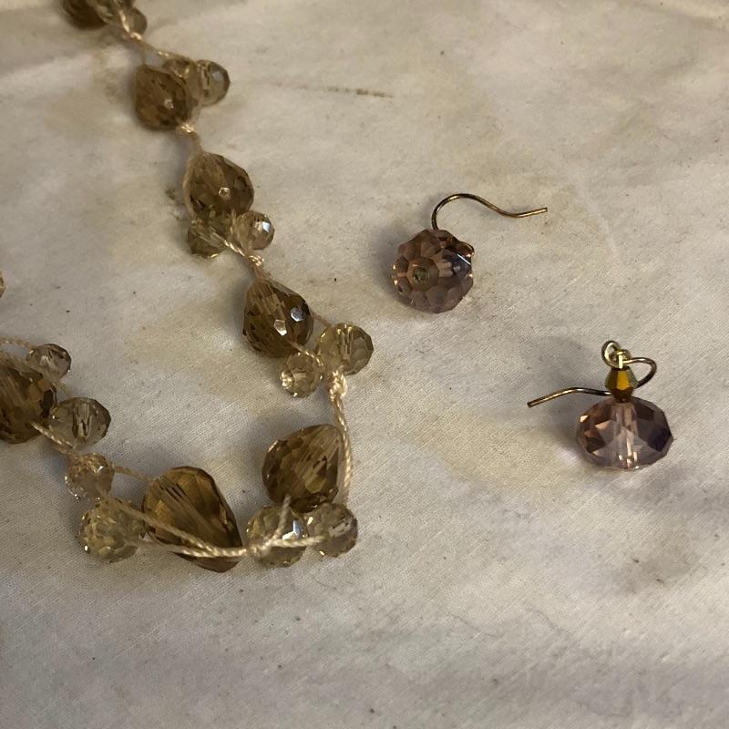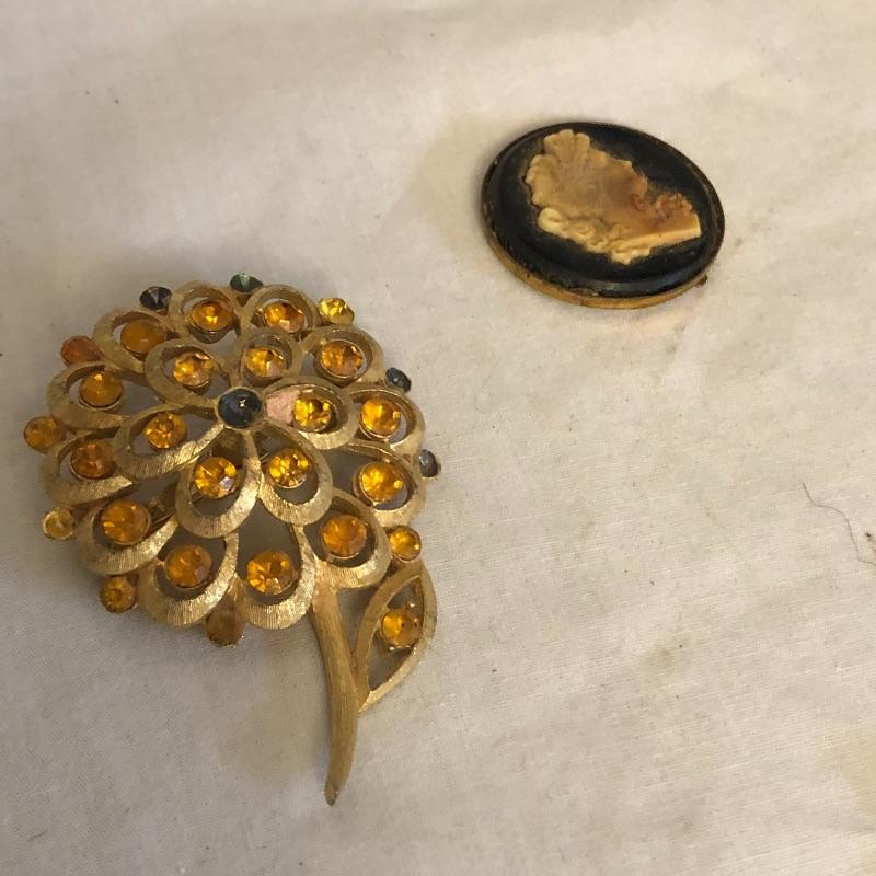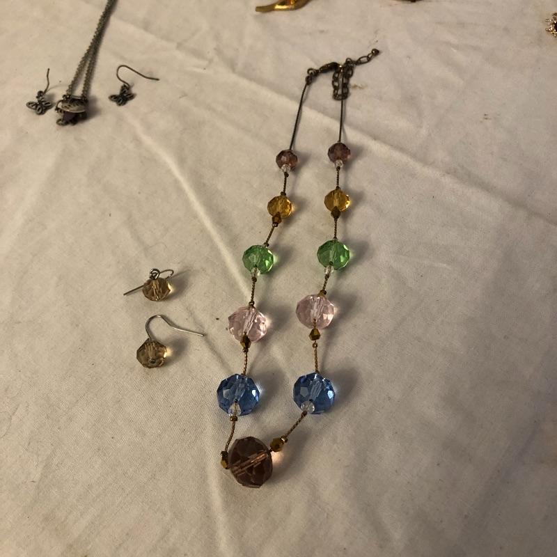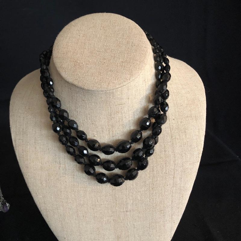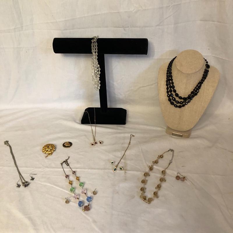 This lot contains five jewelry sets consisting of a necklace and earrings, and two additional necklaces-one crystal and the other black. And two brooches. Please note the cameo brooch is missing the pin on the back side. Shipping Available.