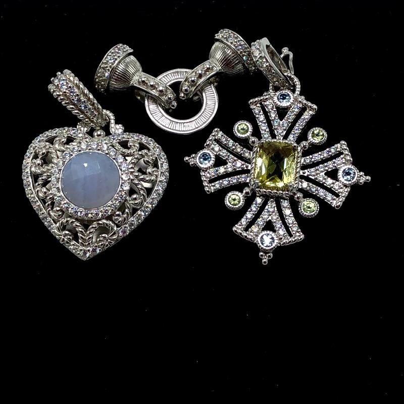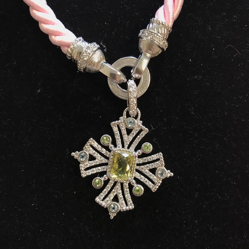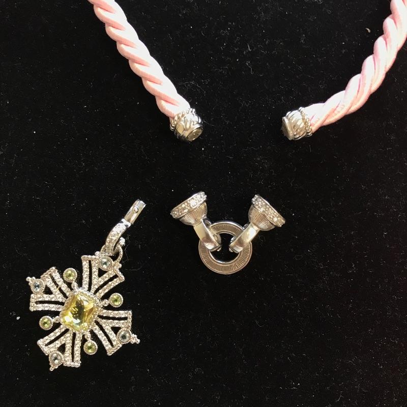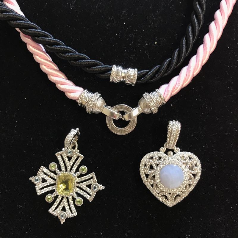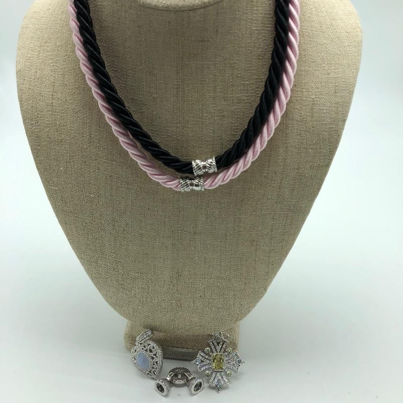 Very nice Judith Ripka black and pink rope necklaces with 925 magnetic clasps. This comes with two hanging pendants and a magnetic clasp to use to hang pendant. Elegant mix and match set is marked 925 and CZ.