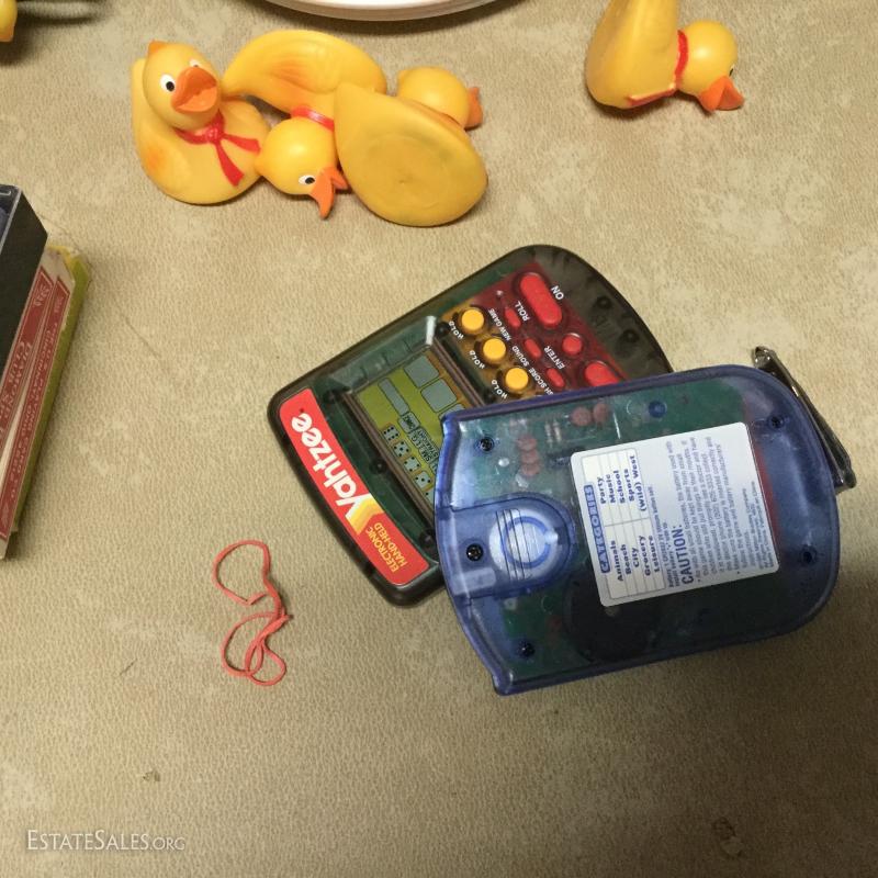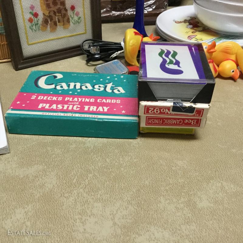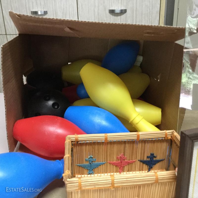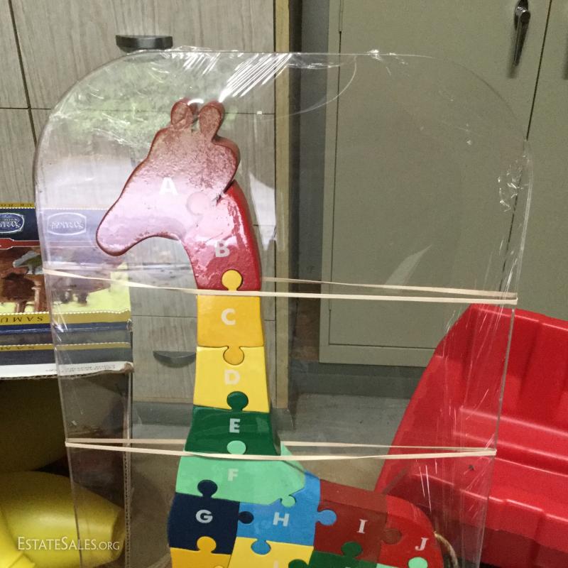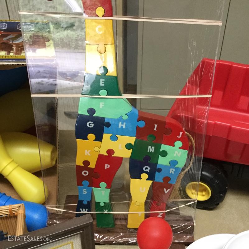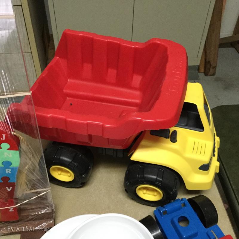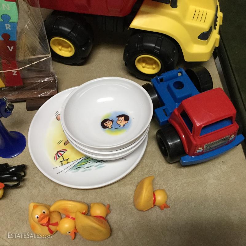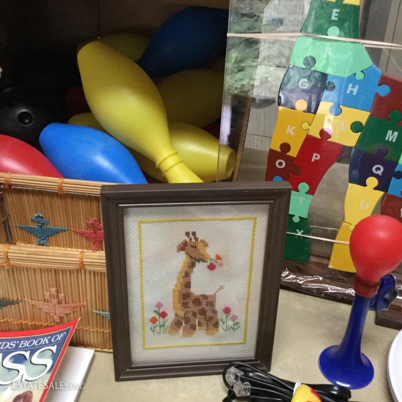 Misc. kid toys including super cute almost-new giraffe puzzle art. Tonka truck. Three melmac plates and bowls. Electronic games. Cards. Plastic bowling set. Chess book. Cute basket and framed giraffe.