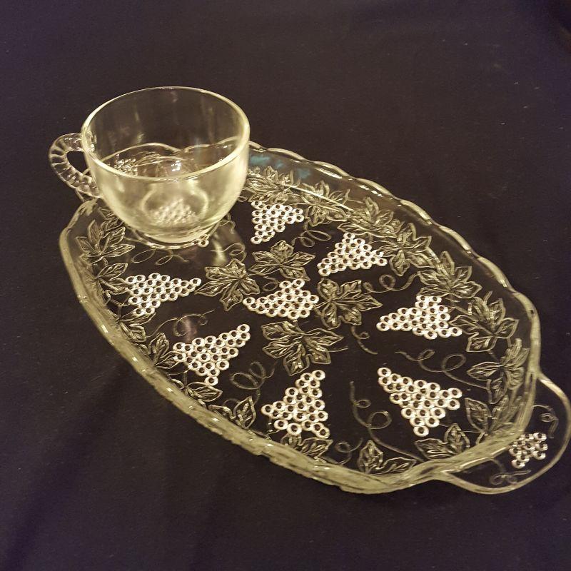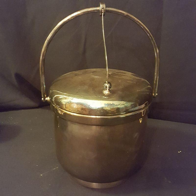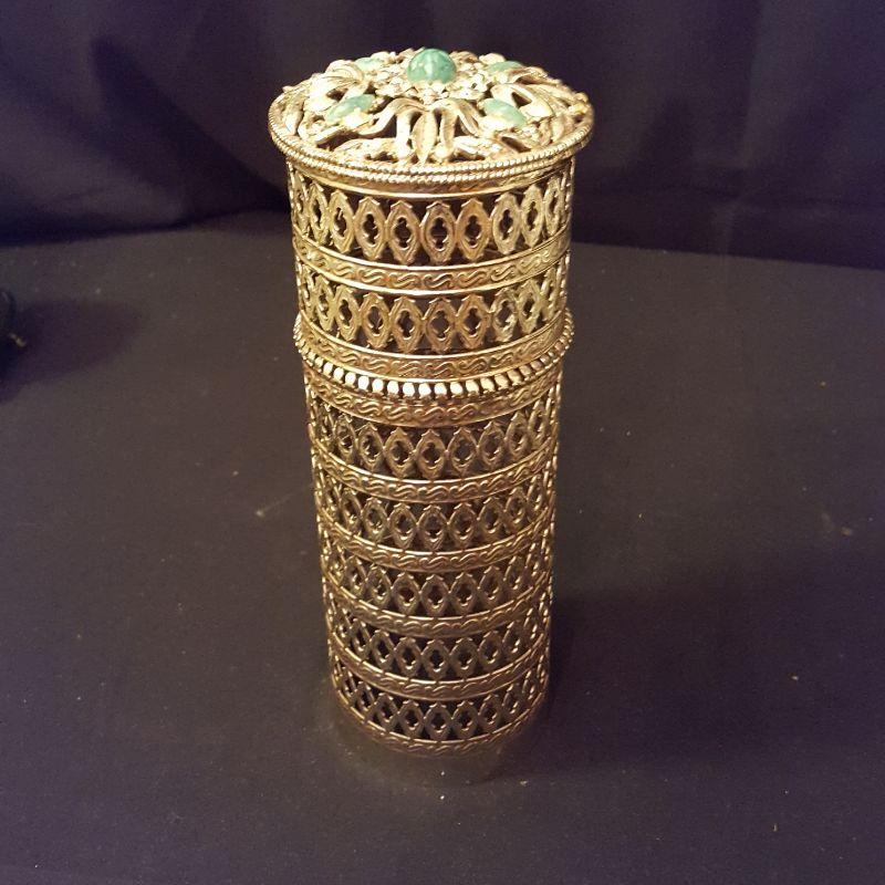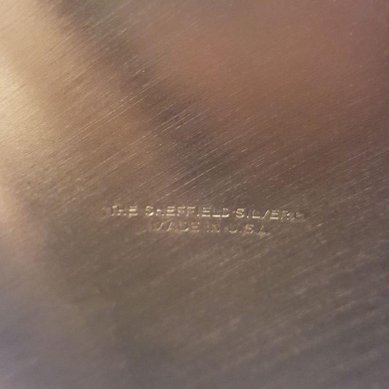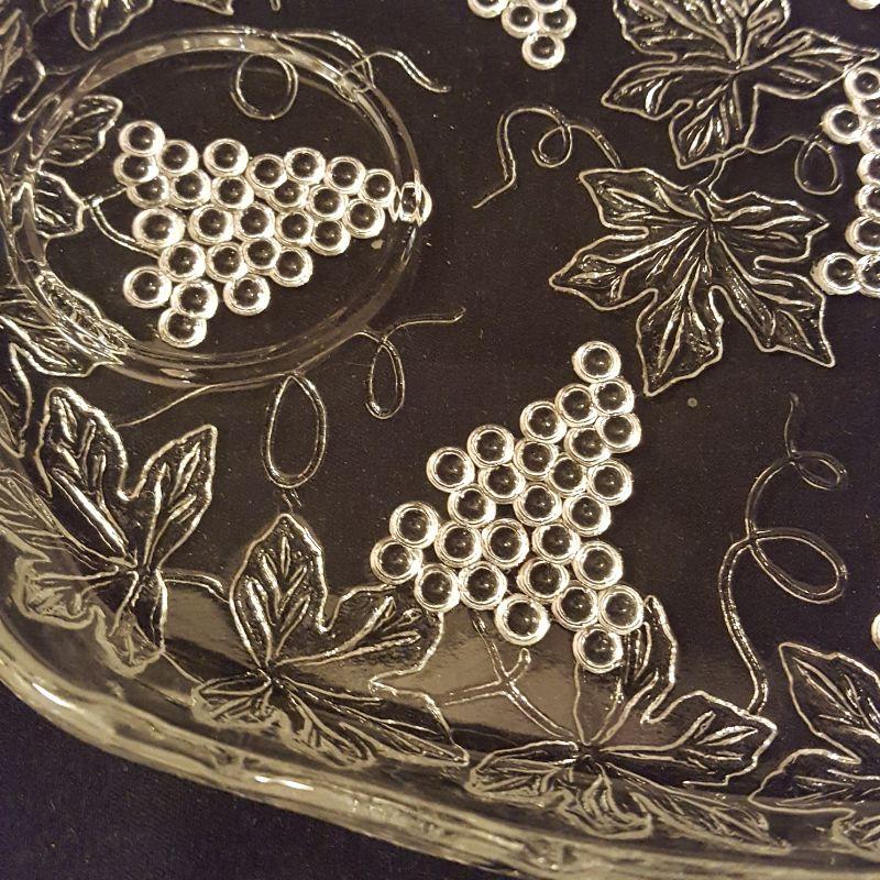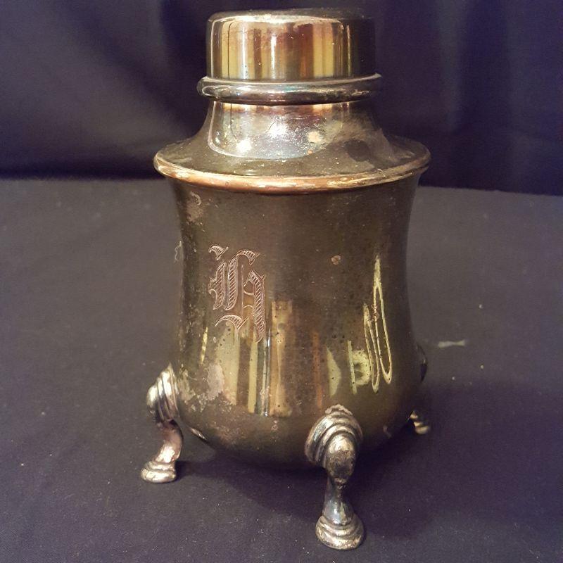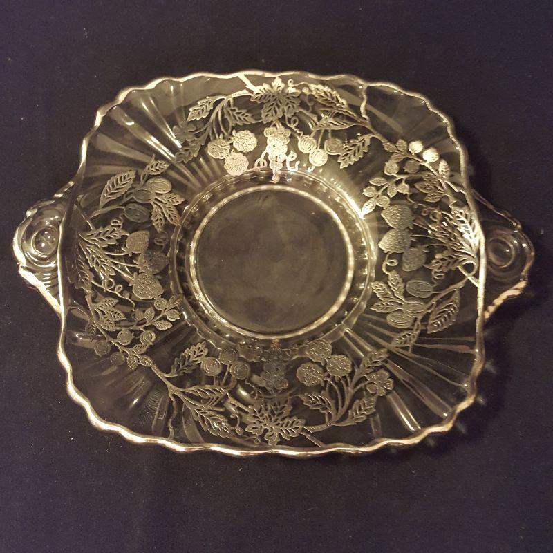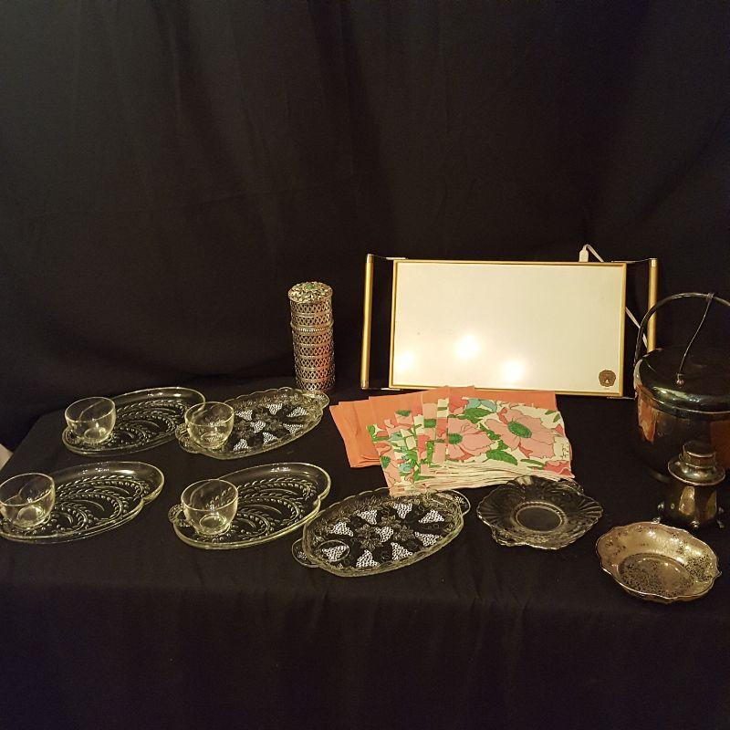 Ladies! This lot will get you ready for a fun day! We will start you off with 5 glass snack trays and 4 cups that fit the ring on the tray. Next, there are 7 floral print linen napkins and 6 coral linen napkins, with two napkins with small amounts of discoloration, see pictures. Then plug in the Supreme Electray to keep your food ready when you are. It has been tested and gets warm when plugged in. The Electray measures 20x9.5 inches, including the handles. Then keep your ice cold with a Sheffield Silver Co. ice bucket. Pull the handke back to open. It could use a good polishing. There is a glass Pryex liner inside that does not come out. Other than the polishing, the bucket appears to be in good condition. Next is a silver, hollow cylinder, topped with green and yellow stones. We're not exactly sure what it does, but it looks good! It stands 9 inches tall and 3 inches in diameter. Then we have a small glass dish (8in) with silver berries and leaves. The dish appears to be in good condition. Next, is a Shefield tea caddy with an engraved, what appears to be a "G". This piece could also use a good polishing, but other than that, it's in good condition. Finally, a Wheeling Gold China bowl (6in) with a silver glaze of flowers.