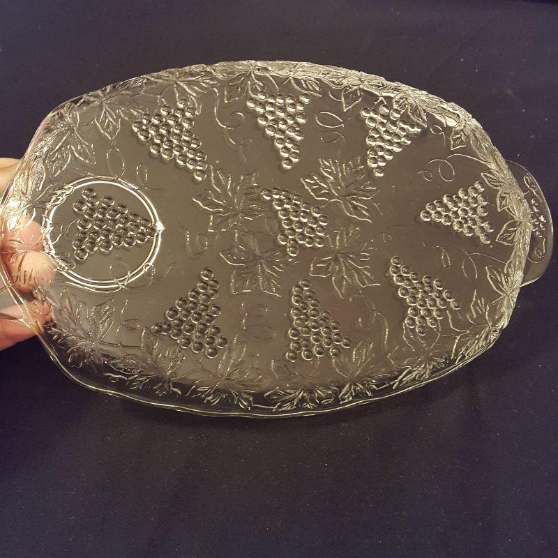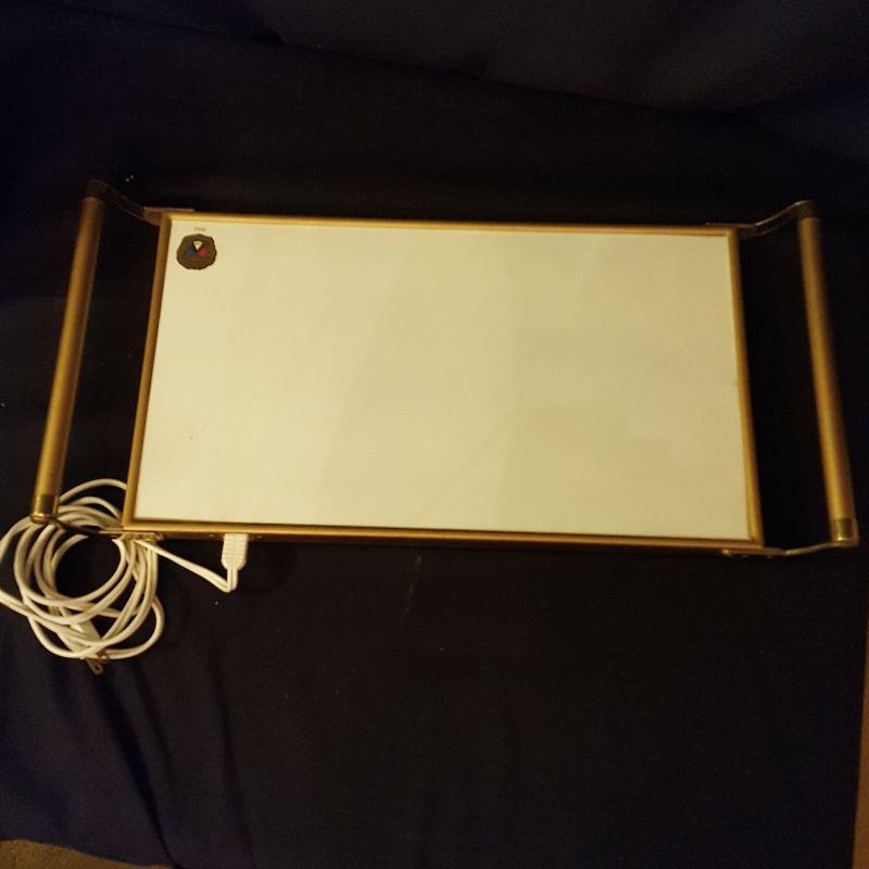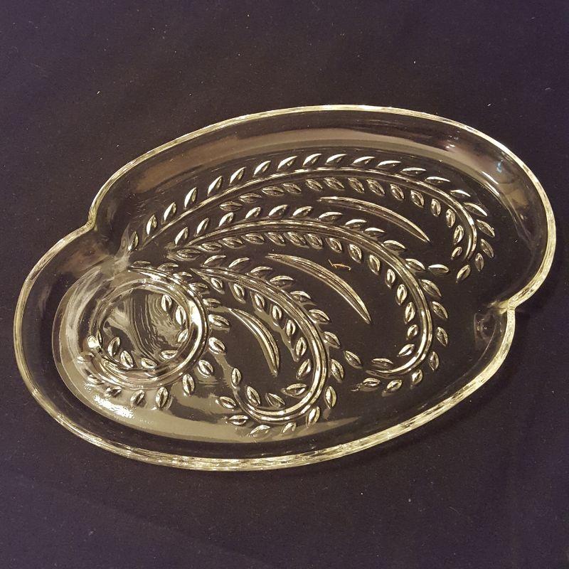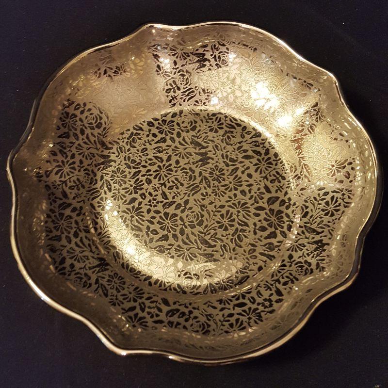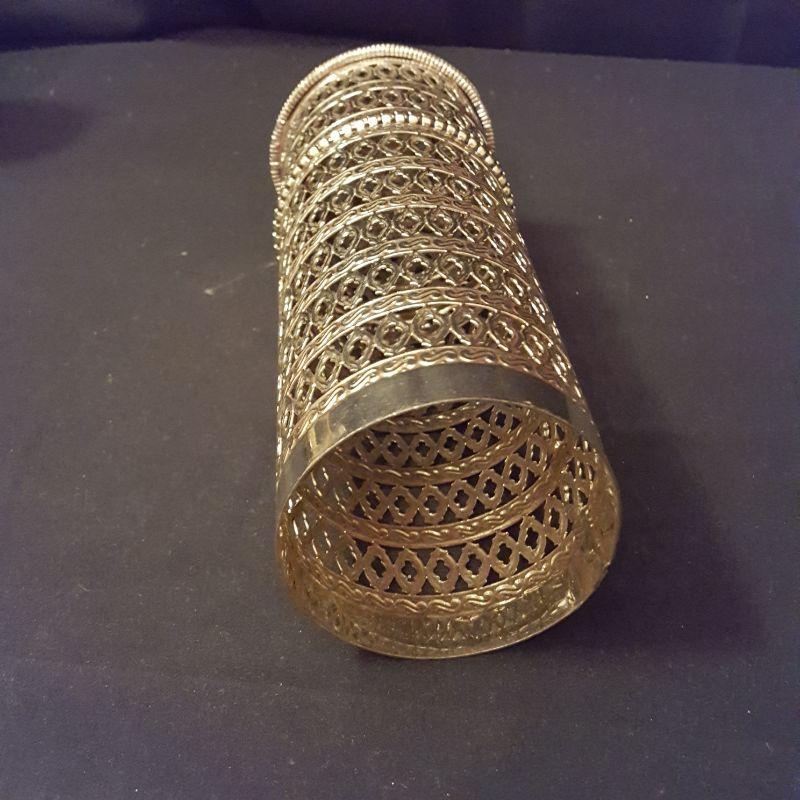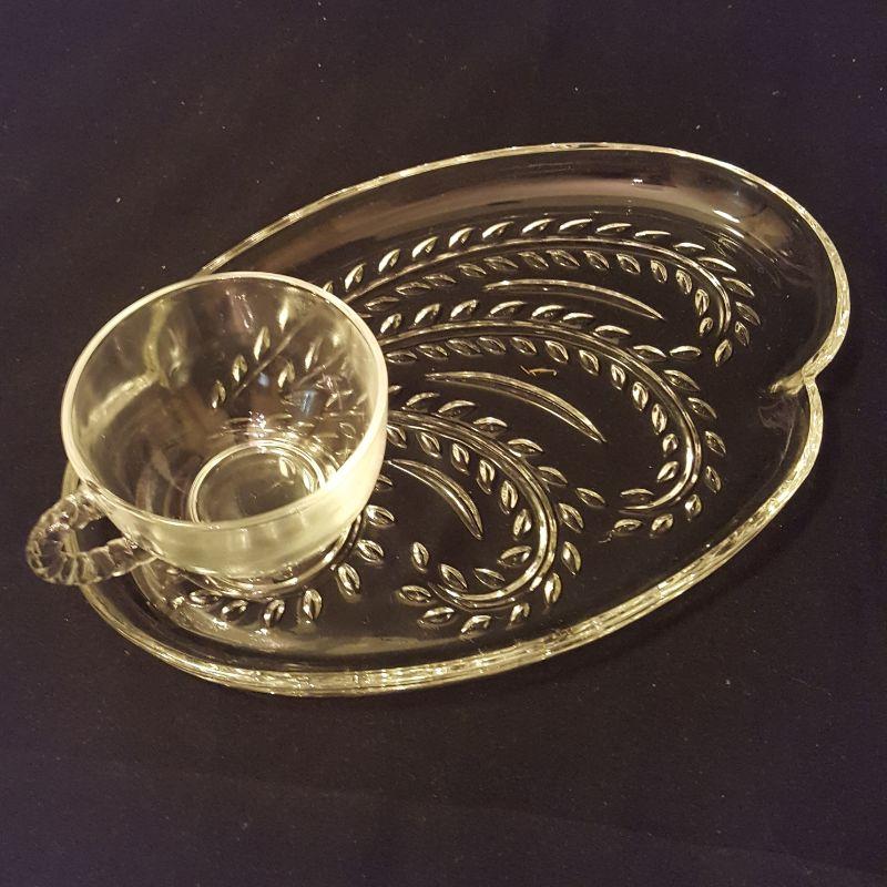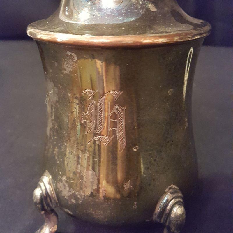 Ladies! This lot will get you ready for a fun day! We will start you off with 5 glass snack trays and 4 cups that fit the ring on the tray. Next, there are 7 floral print linen napkins and 6 coral linen napkins, with two napkins with small amounts of discoloration, see pictures. Then plug in the Supreme Electray to keep your food ready when you are. It has been tested and gets warm when plugged in. The Electray measures 20x9.5 inches, including the handles. Then keep your ice cold with a Sheffield Silver Co. ice bucket. Pull the handke back to open. It could use a good polishing. There is a glass Pryex liner inside that does not come out. Other than the polishing, the bucket appears to be in good condition. Next is a silver, hollow cylinder, topped with green and yellow stones. We're not exactly sure what it does, but it looks good! It stands 9 inches tall and 3 inches in diameter. Then we have a small glass dish (8in) with silver berries and leaves. The dish appears to be in good condition. Next, is a Shefield tea caddy with an engraved, what appears to be a "G". This piece could also use a good polishing, but other than that, it's in good condition. Finally, a Wheeling Gold China bowl (6in) with a silver glaze of flowers.