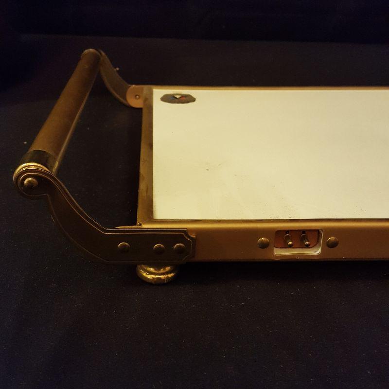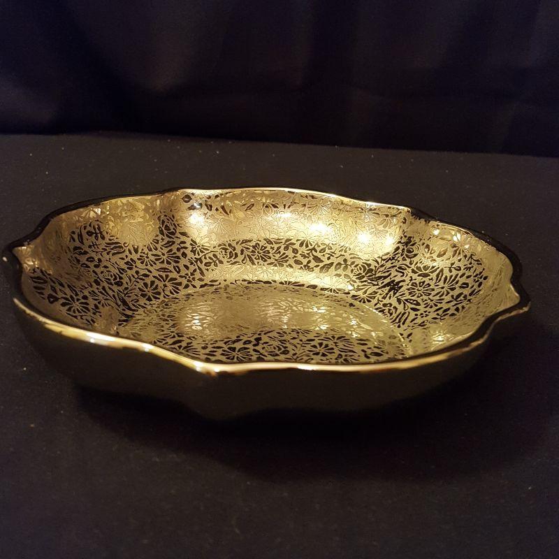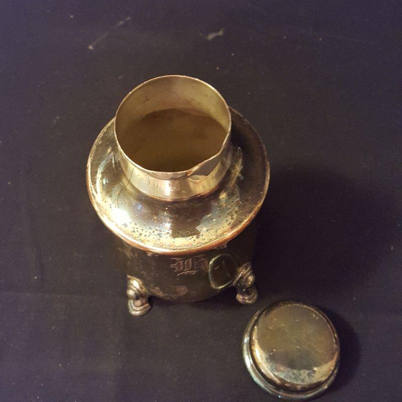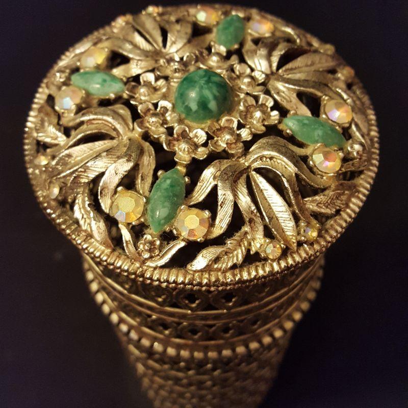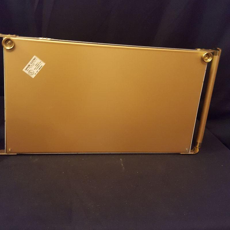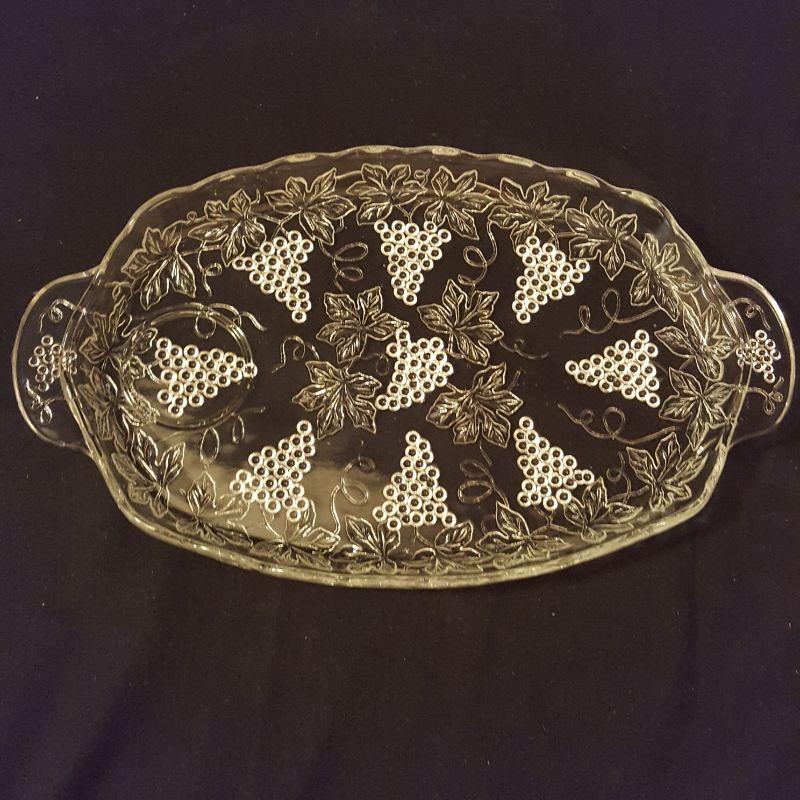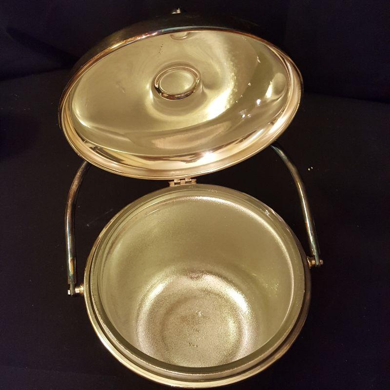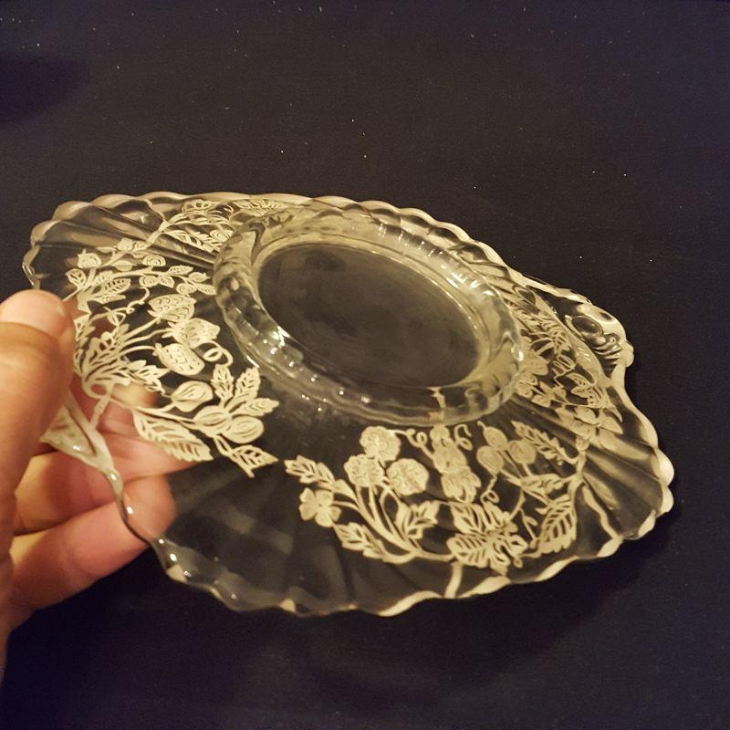 Ladies! This lot will get you ready for a fun day! We will start you off with 5 glass snack trays and 4 cups that fit the ring on the tray. Next, there are 7 floral print linen napkins and 6 coral linen napkins, with two napkins with small amounts of discoloration, see pictures. Then plug in the Supreme Electray to keep your food ready when you are. It has been tested and gets warm when plugged in. The Electray measures 20x9.5 inches, including the handles. Then keep your ice cold with a Sheffield Silver Co. ice bucket. Pull the handke back to open. It could use a good polishing. There is a glass Pryex liner inside that does not come out. Other than the polishing, the bucket appears to be in good condition. Next is a silver, hollow cylinder, topped with green and yellow stones. We're not exactly sure what it does, but it looks good! It stands 9 inches tall and 3 inches in diameter. Then we have a small glass dish (8in) with silver berries and leaves. The dish appears to be in good condition. Next, is a Shefield tea caddy with an engraved, what appears to be a "G". This piece could also use a good polishing, but other than that, it's in good condition. Finally, a Wheeling Gold China bowl (6in) with a silver glaze of flowers.