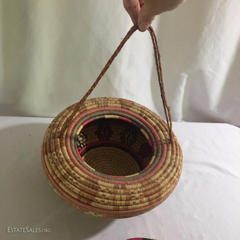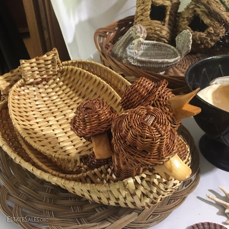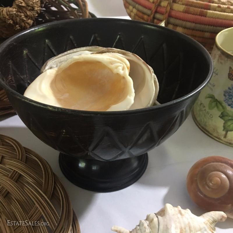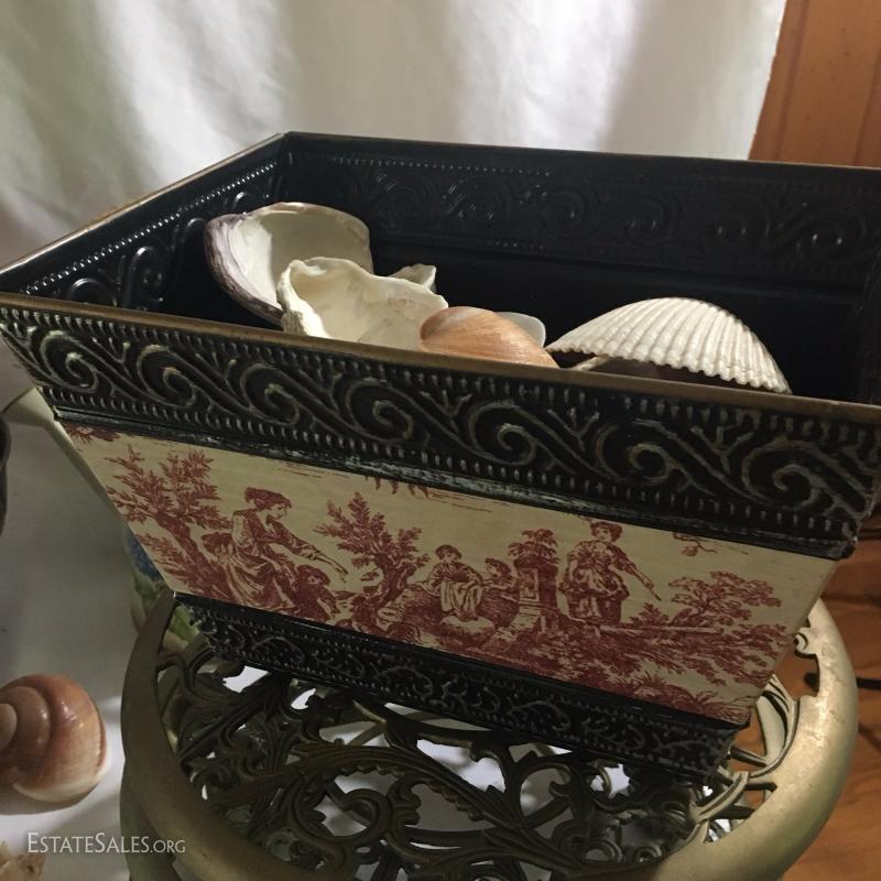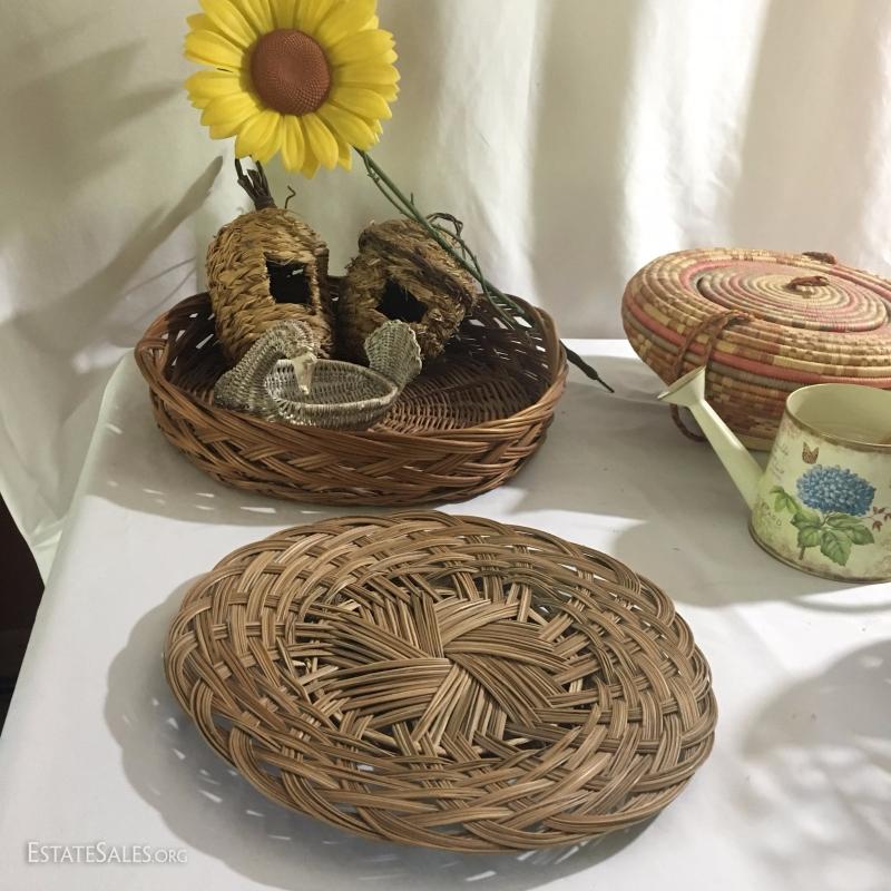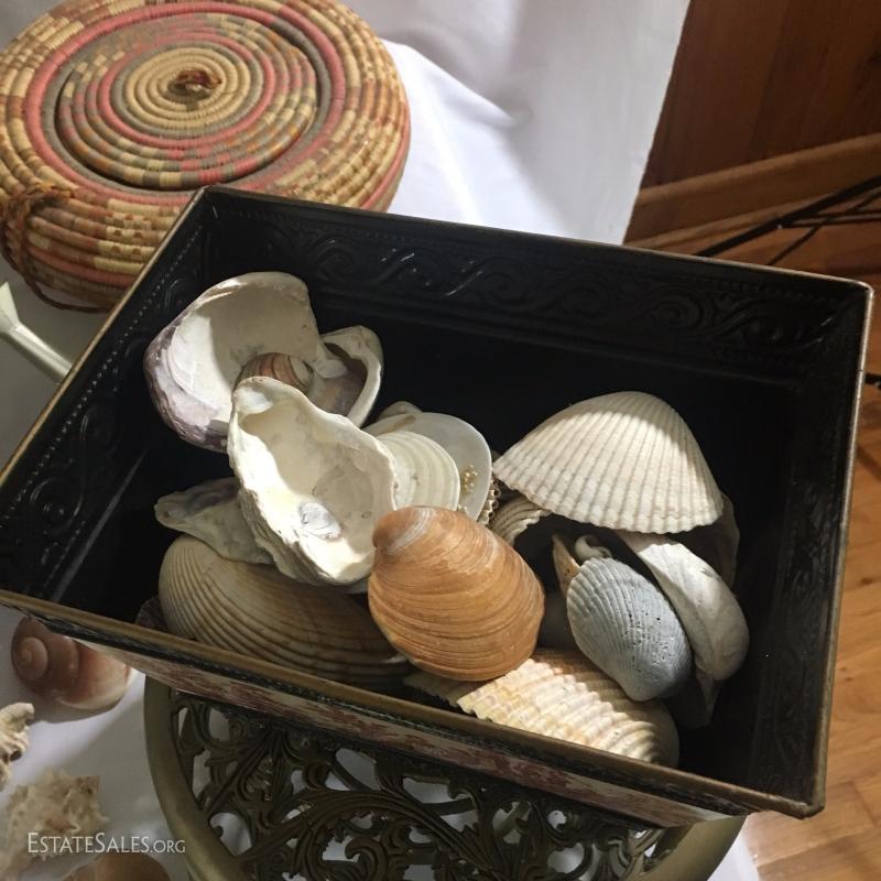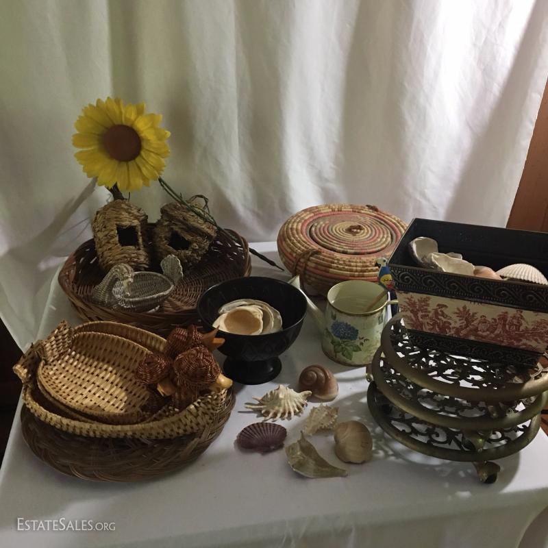 Large lot includes baskets, planters, shells and planter roller stands. See pictures.