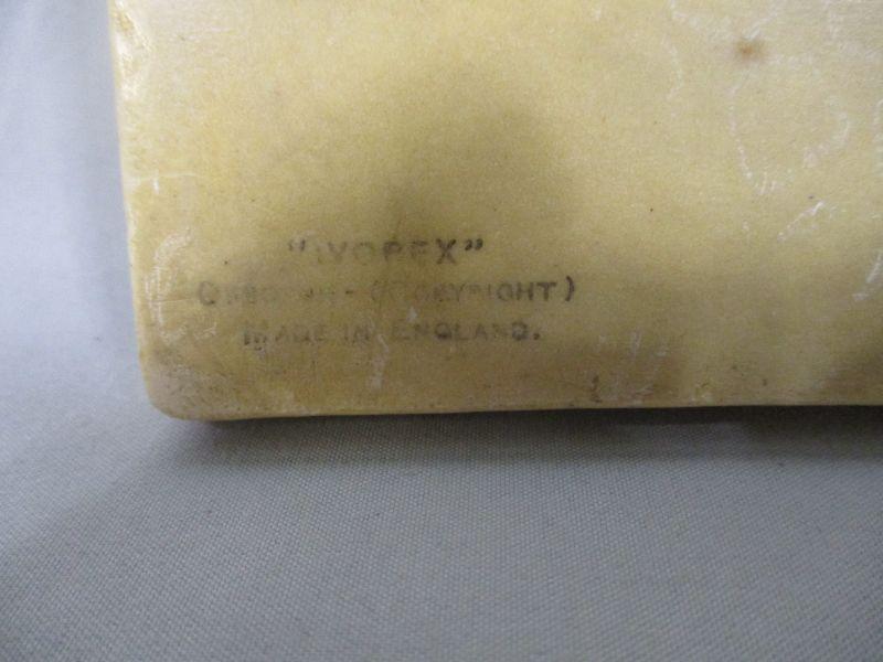 There was another one of these two auctions ago and I couldn't figure out what the material was - now I know because this one is marked on the backside "Ivorex Made in England". This one also is marked, "Copyright 1924 E. Osbourne & Co." It is 9.25" x 6.25" and I don't see any issues.