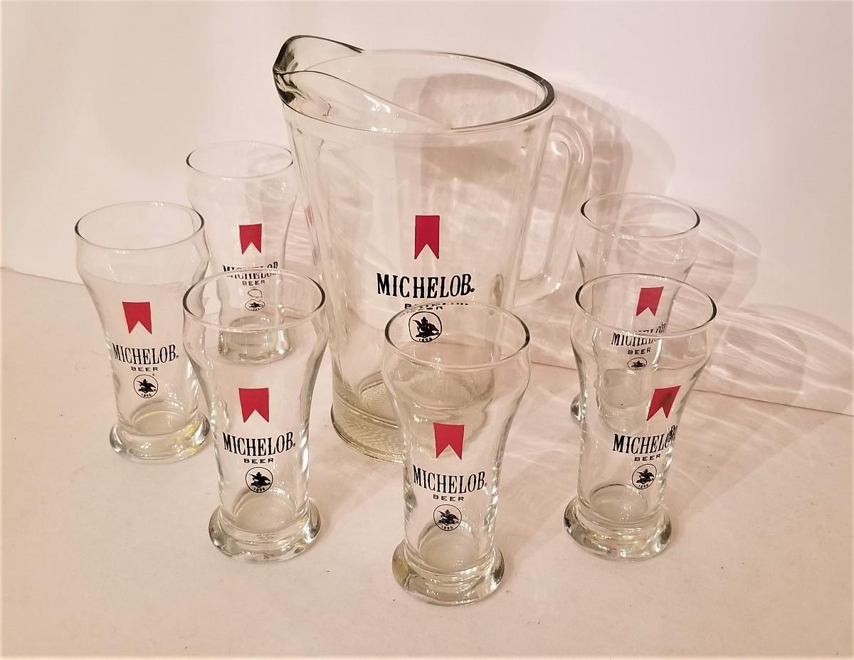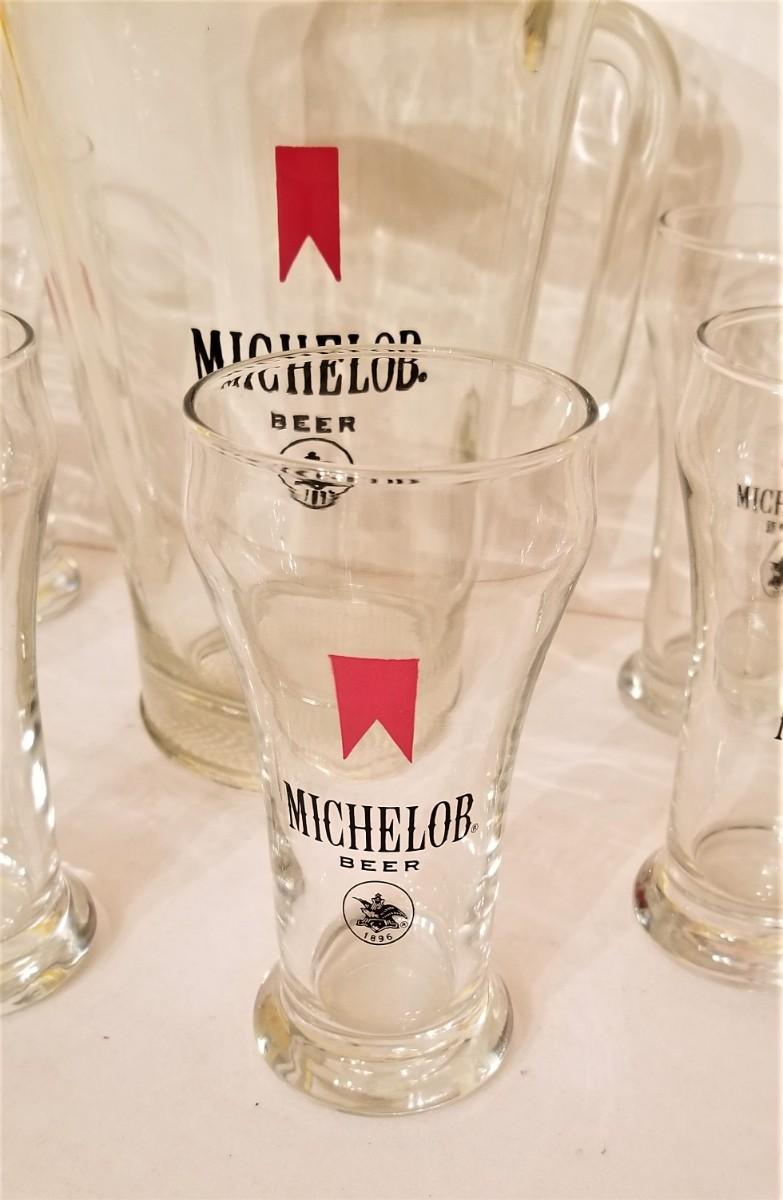 Michelob Beer Pitcher (9" tall) and 6 matching glasses (each 5.5" tall). All in good condition.