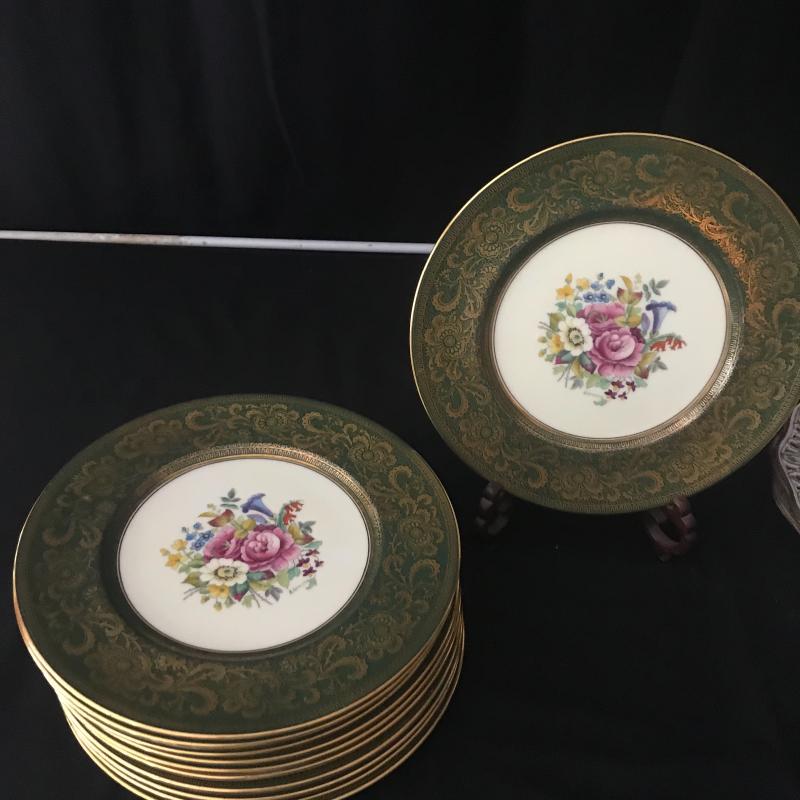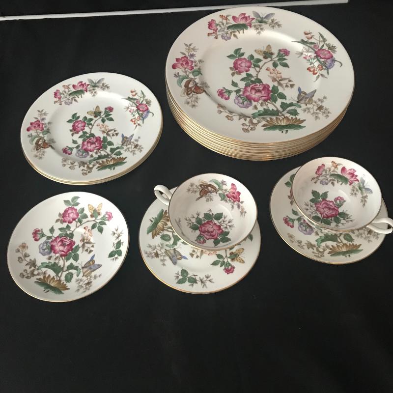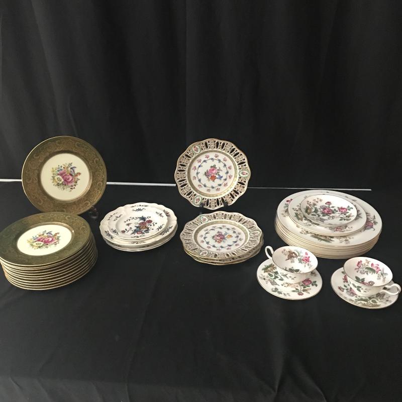 Lot includes 12 lunch or salad plates by Cauldon China for Tiffany & Co., 4 salad and 2 desert plates by Wedgewood, 4 luncheonette plates by Brothers Company and Wedgewood Charnwood Pattern in 8 dinner, 2 salad, and 2 cups and saucers. Lot is available for shipping but be aware it will be pricy through UPS Store to ensure safe arrival. May want to get an estimate of cost from 28804.