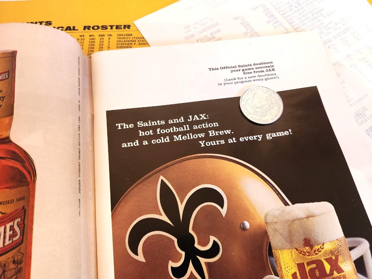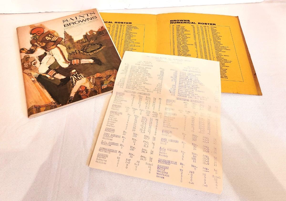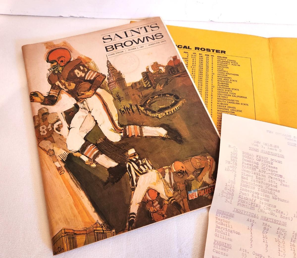 Game Program dated 10 Oct 1967 - Saints played the Browns at Tulane Stadium. Jax doubloon intact. also comes with player stats sheets. Great condition.