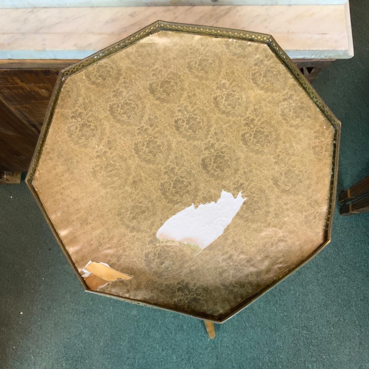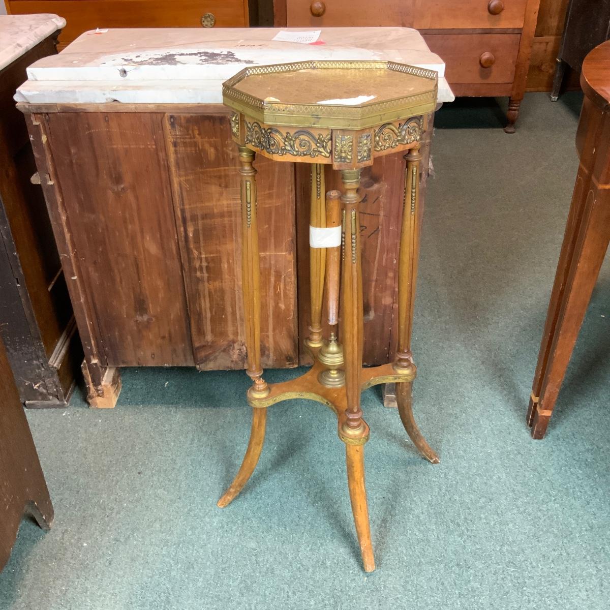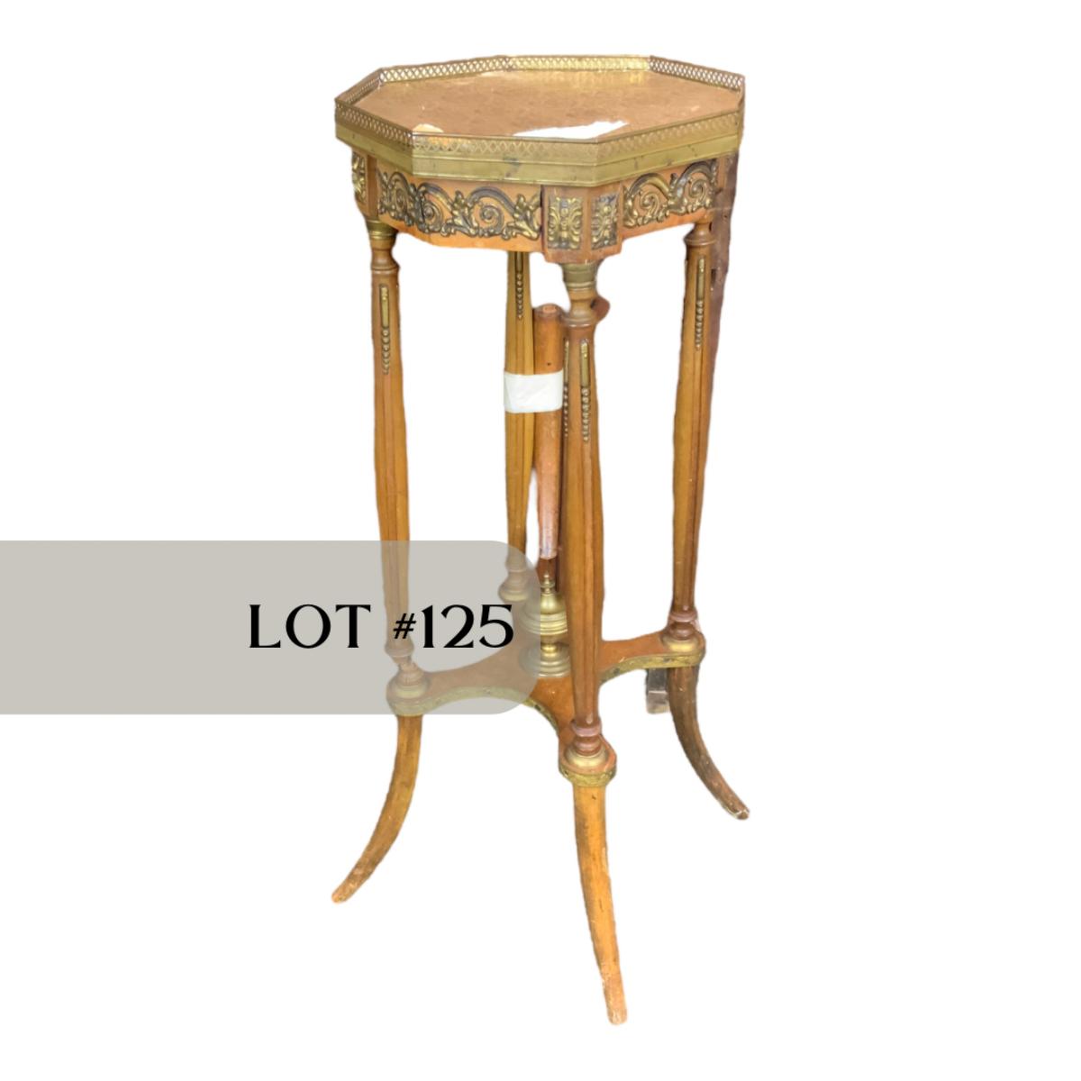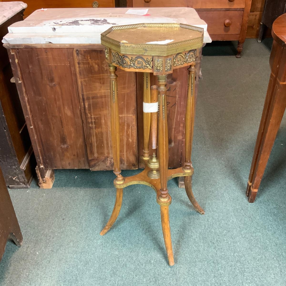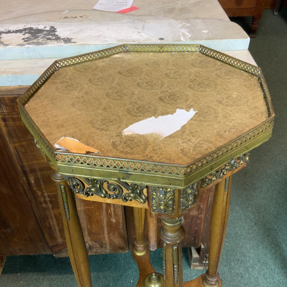 Octagon Plant Stand. Really unique design. It will make your Cactus look like a King! Needs marble piece for the top. Missing leg is included. //::\\ Please see photos for details and condition. No attempt has been made to hide any imperfections. All items listed in this auction are warehouse items, and need to be cleaned. A majority of the items need restoration as well. All items are sold AS IS and WITHOUT GUARANTEE. If you are uncertain about an item, DO NOT BID. Due to the nature of this online auction in-person inspection is HIGHLY recommended. All Sales are FINAL. Pick Up Times are FIRM. Please confirm with your own schedule that you can pick up in the scheduled times listed in the Terms and Conditions. Any questions please message the auctioneer. DO NOT Contact The Harp Gallery.