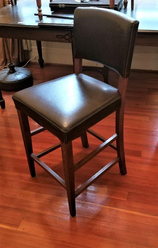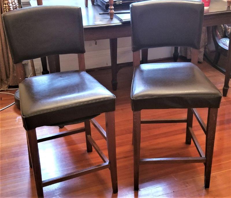 Nice pair of contemporary leather bar stools in good condition. 37.5" tall, 17.5" across.