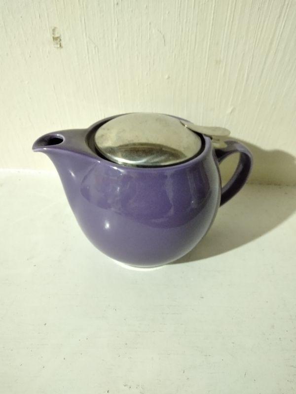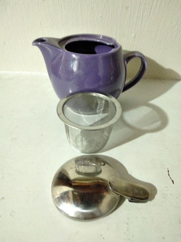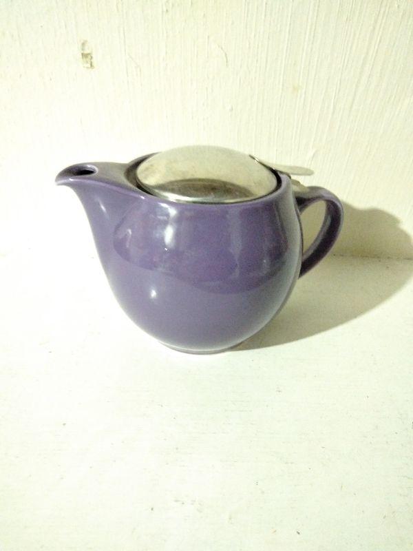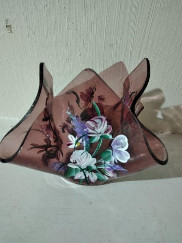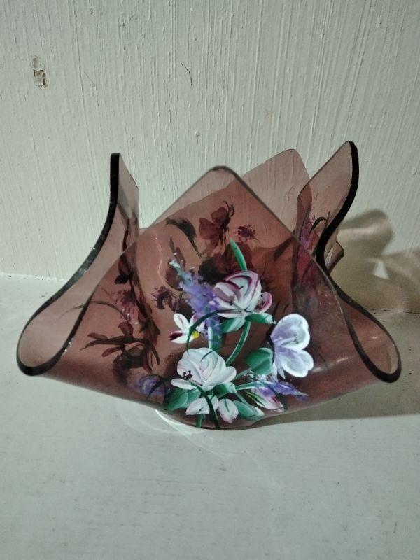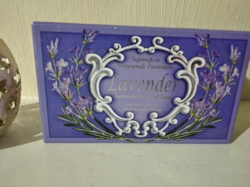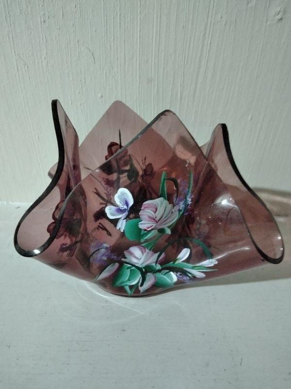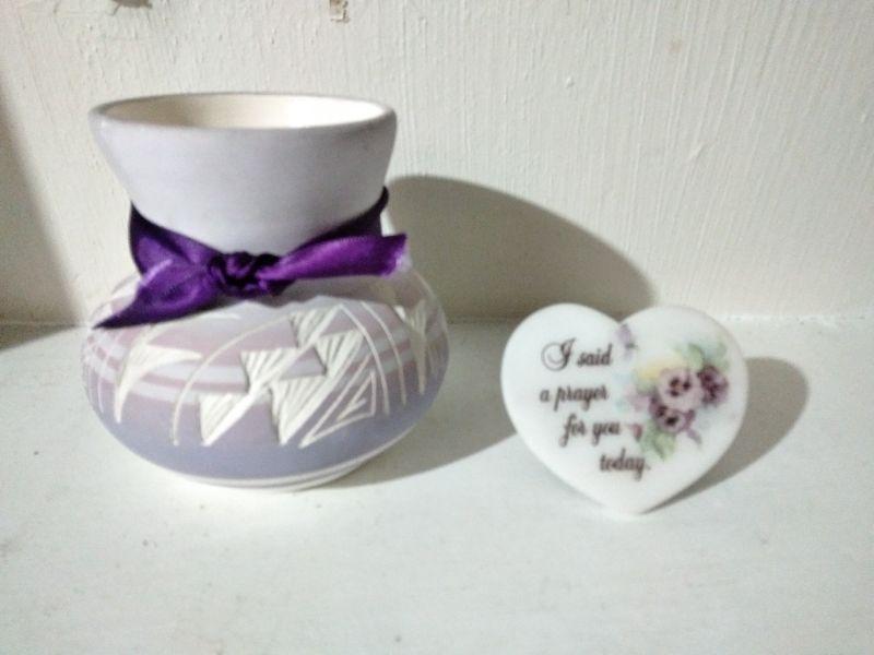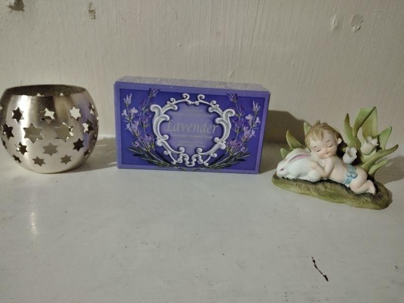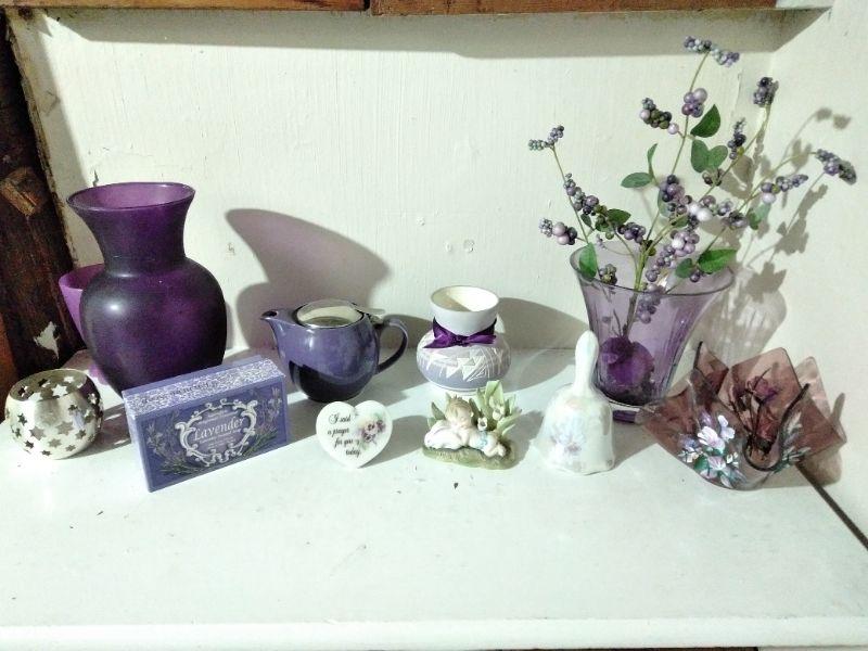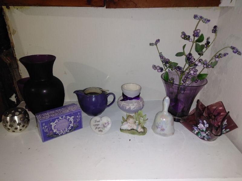 PURPLE HOUSEHOLD DECOR, INCLUDING A PURPLE VASE, LAVENDAR SOAP, ZERO CHINA TEA POT WITH INSERT, CASE WITH FLOWERS,, LEFTON BABY WITH BUNNY, AND A GLASS HAND PAINTED ART PIECE, AND MORE.