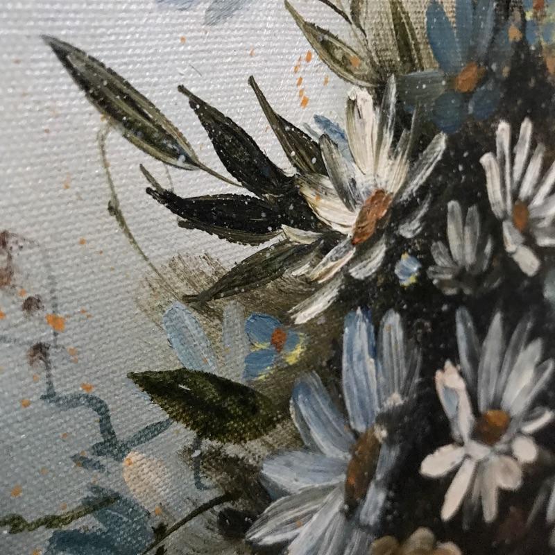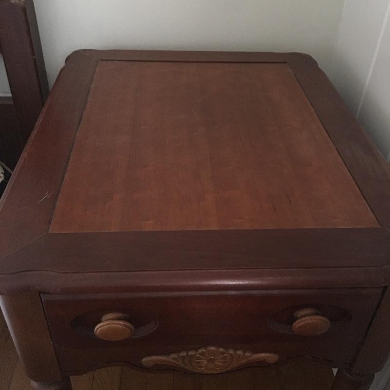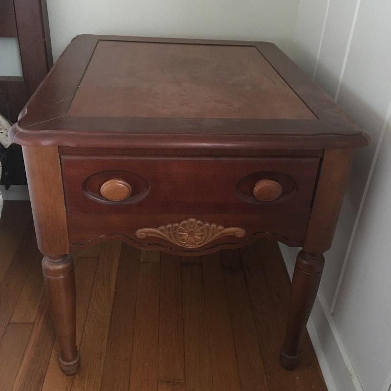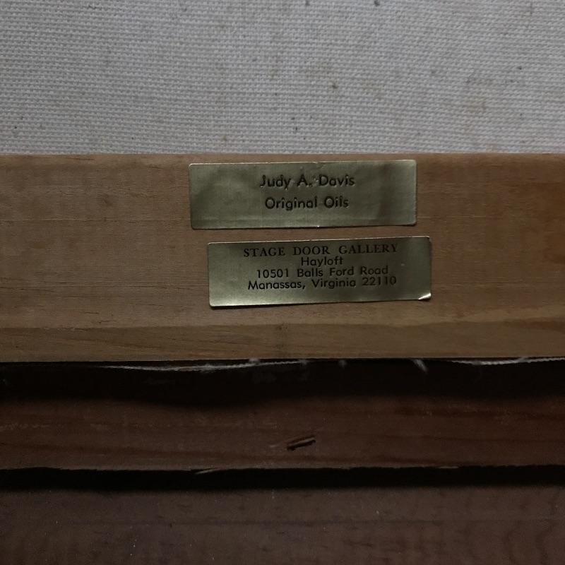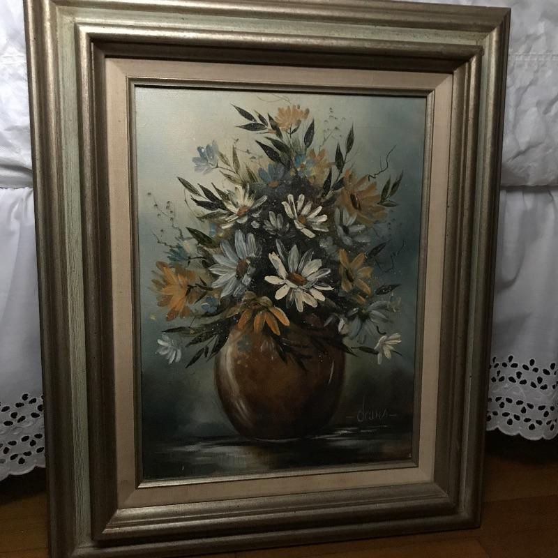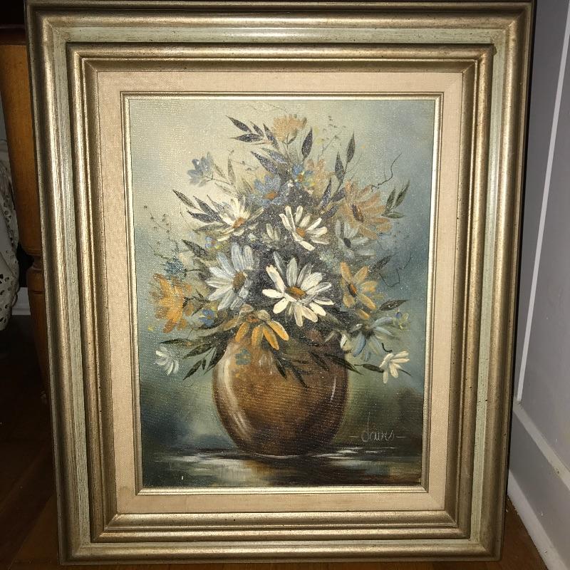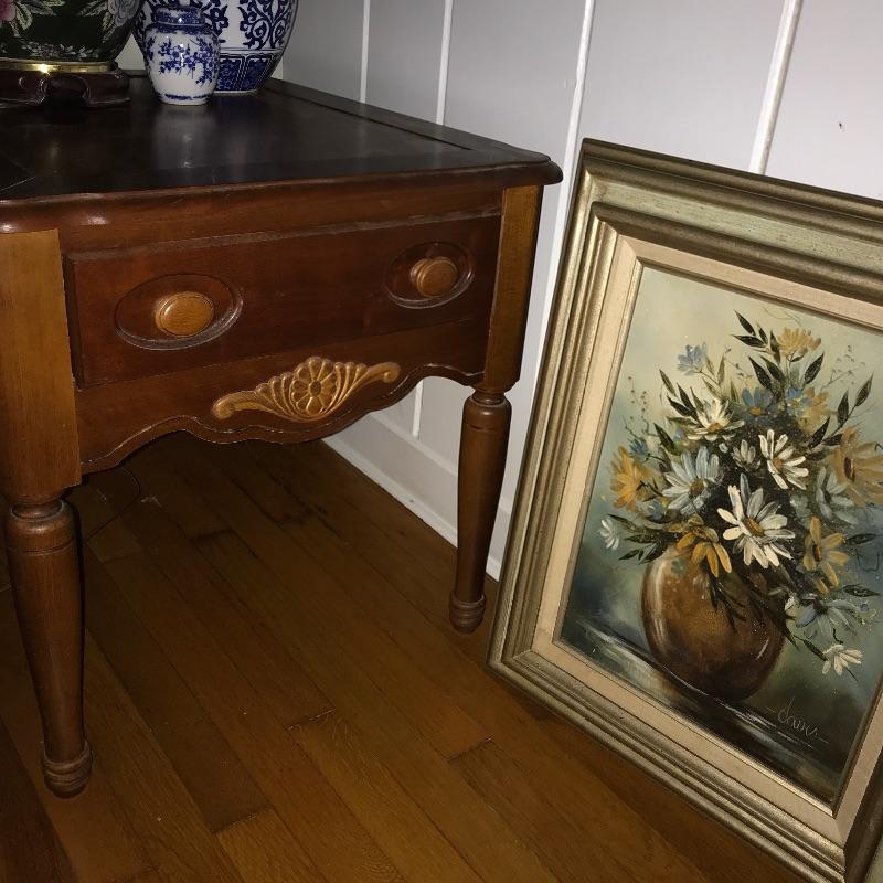 Wooden side table and original signed painting by Judy A. Davis. Nice wooden side table with a drawer and a lovely floral painting by Davis will make you want this in your home.