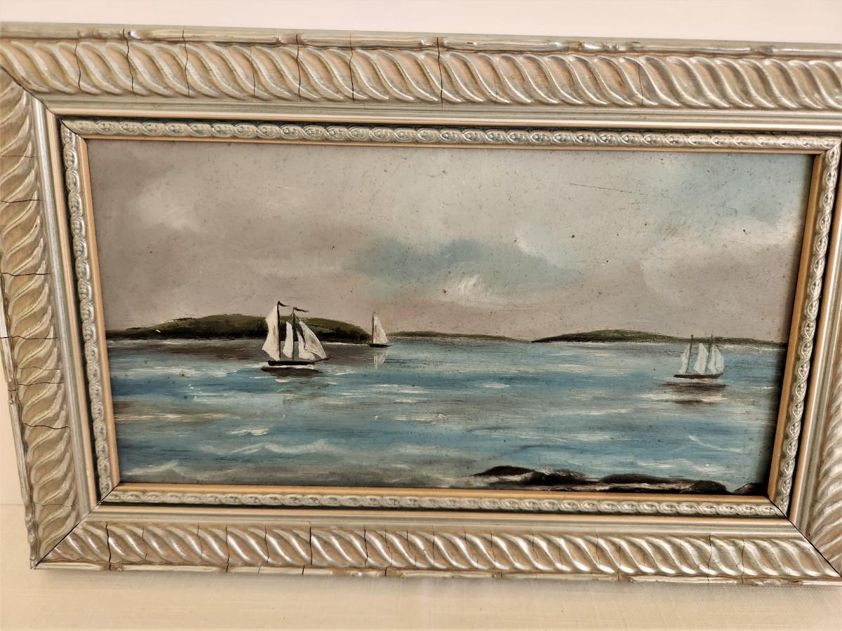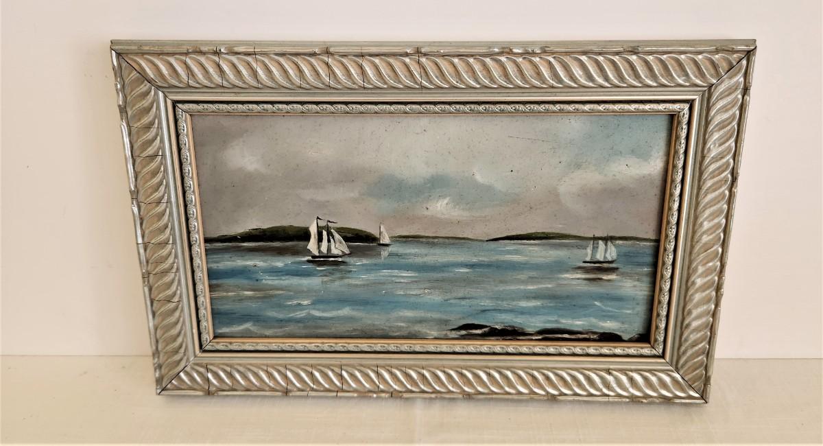 Smallish (about 8.5" x 14") oil on board - sailboats on lake - UNSIGNED. Well executed - vintage. Contemporary frame.