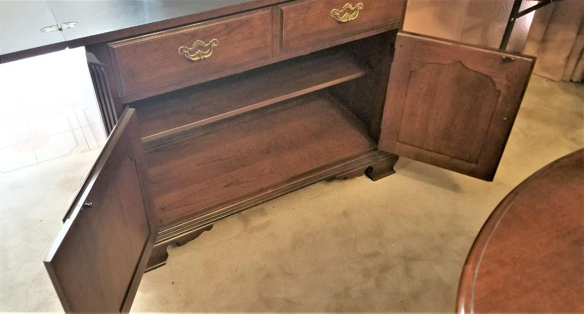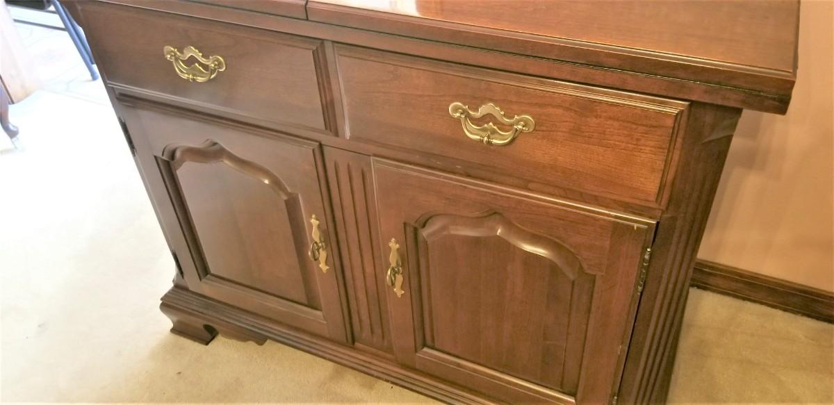 Beautiful Thomasville flip top bar - otherwise known as a "Jeeves table". Two drawers, lots of storage underneath - on castors. Finished top flips open to reveal a laminate-like surface - perfect for a home bar or small sideboard. Measures 80" across when fully extended, 31.5" tall, 18" deep. Gently used. A very versatile piece of furniture.