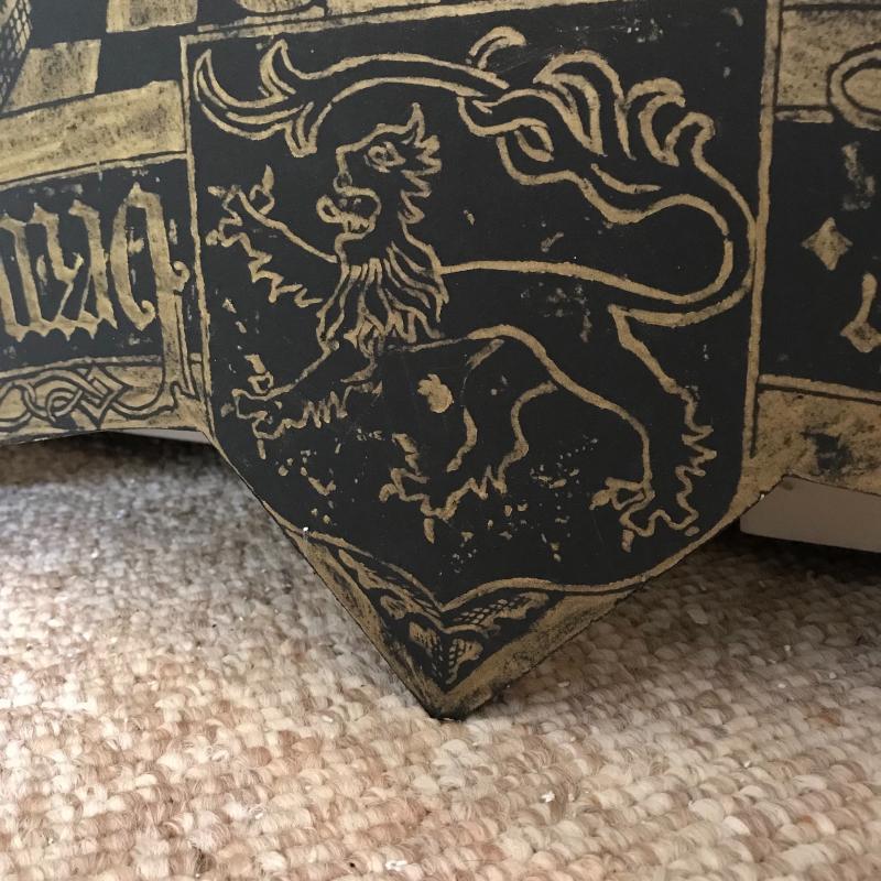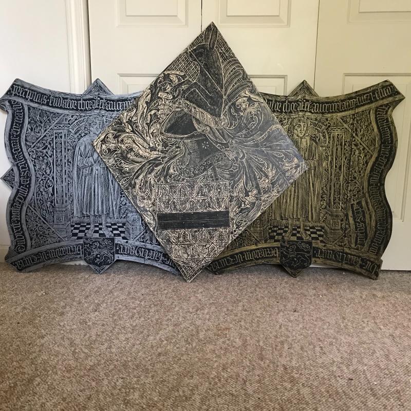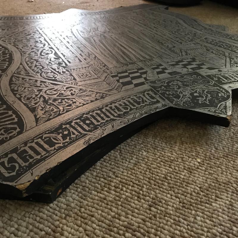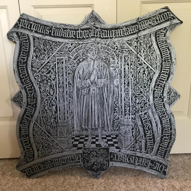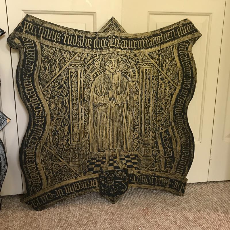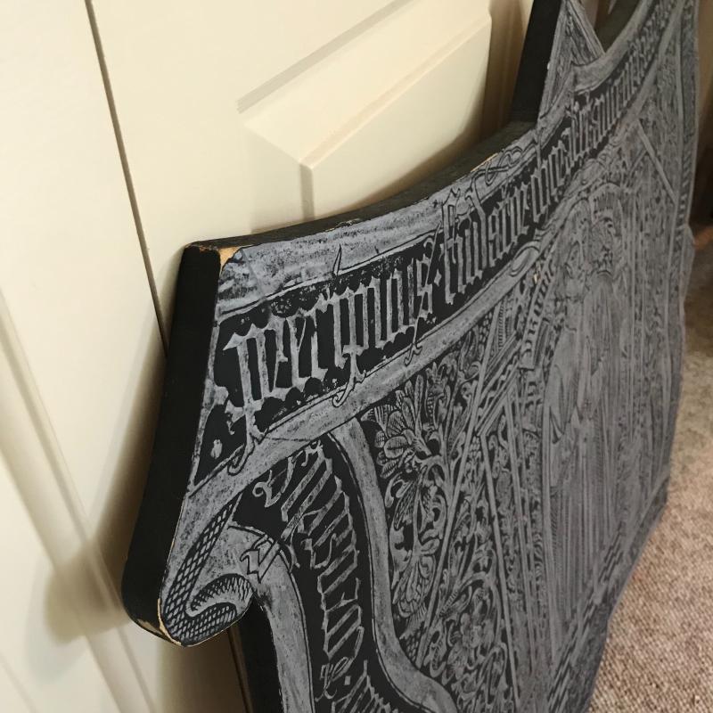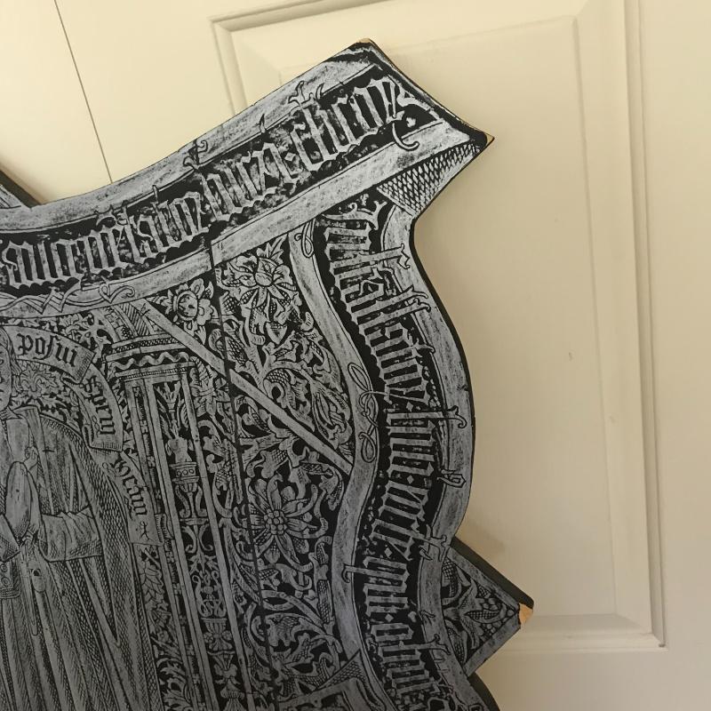 Three gorgeous rubbings all on particle board with wood backing. The silver and gold rubbings are approximately 32” x .75” x 31.5” with very similar shape. The silver has more details on a point on each side. The third rubbing is diamond shaped and on .5” thick particle board. Some wear is noted in photos, the diamond shaped and gold rubbings appear to have hanging capabilities. Brass rubbings are done by stretching a linen rag paper over the deeply etched monumental brass that is usually found at the gravesite. After securing the paper, heelball (a very hard wax) is rubbed vigorously over the paper surface to get an exact copy of the brass plate. A single rubbing can take from 2 hours to 2 days to complete depending in it's size, condition, and complexity.(Description taken from google) Shipping is available, please call UPS for a quote prior to bidding. Pieces are heavy and shipping art may be costly.