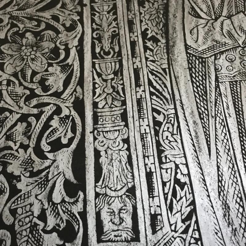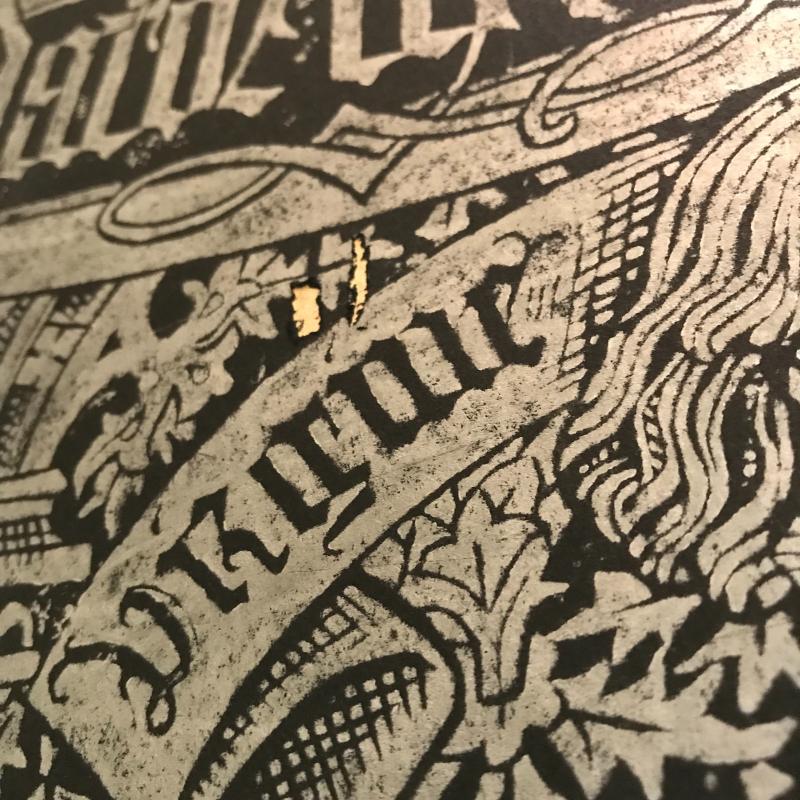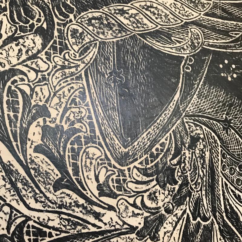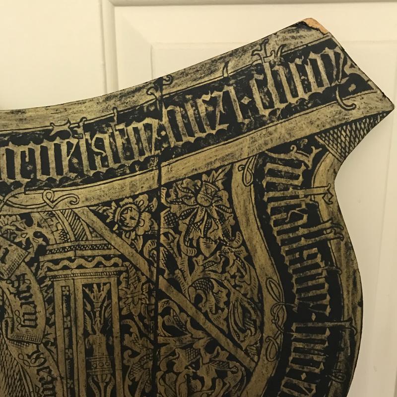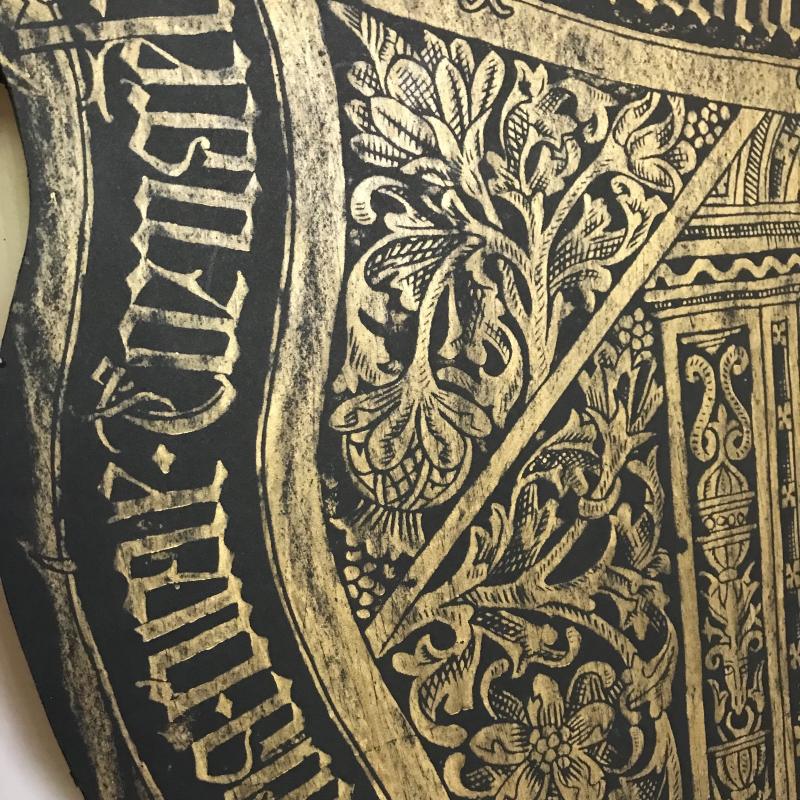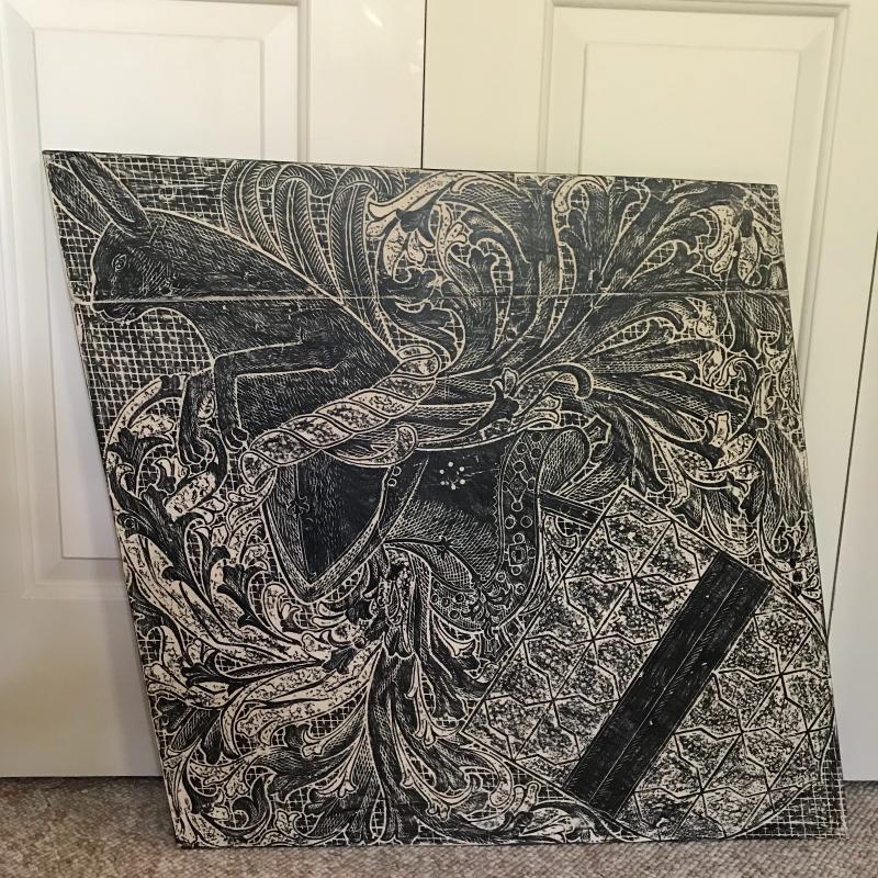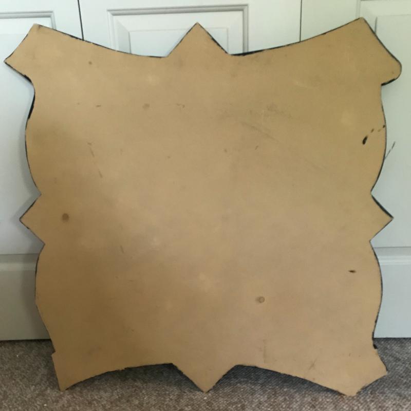 Three gorgeous rubbings all on particle board with wood backing. The silver and gold rubbings are approximately 32” x .75” x 31.5” with very similar shape. The silver has more details on a point on each side. The third rubbing is diamond shaped and on .5” thick particle board. Some wear is noted in photos, the diamond shaped and gold rubbings appear to have hanging capabilities. Brass rubbings are done by stretching a linen rag paper over the deeply etched monumental brass that is usually found at the gravesite. After securing the paper, heelball (a very hard wax) is rubbed vigorously over the paper surface to get an exact copy of the brass plate. A single rubbing can take from 2 hours to 2 days to complete depending in it's size, condition, and complexity.(Description taken from google) Shipping is available, please call UPS for a quote prior to bidding. Pieces are heavy and shipping art may be costly.