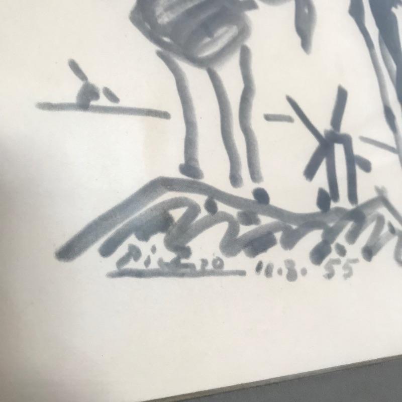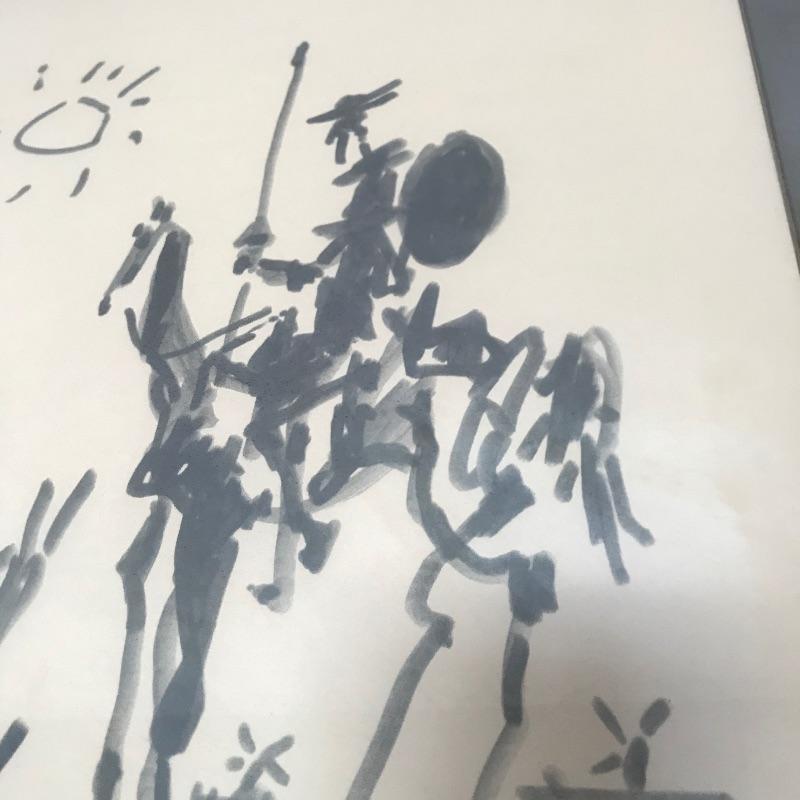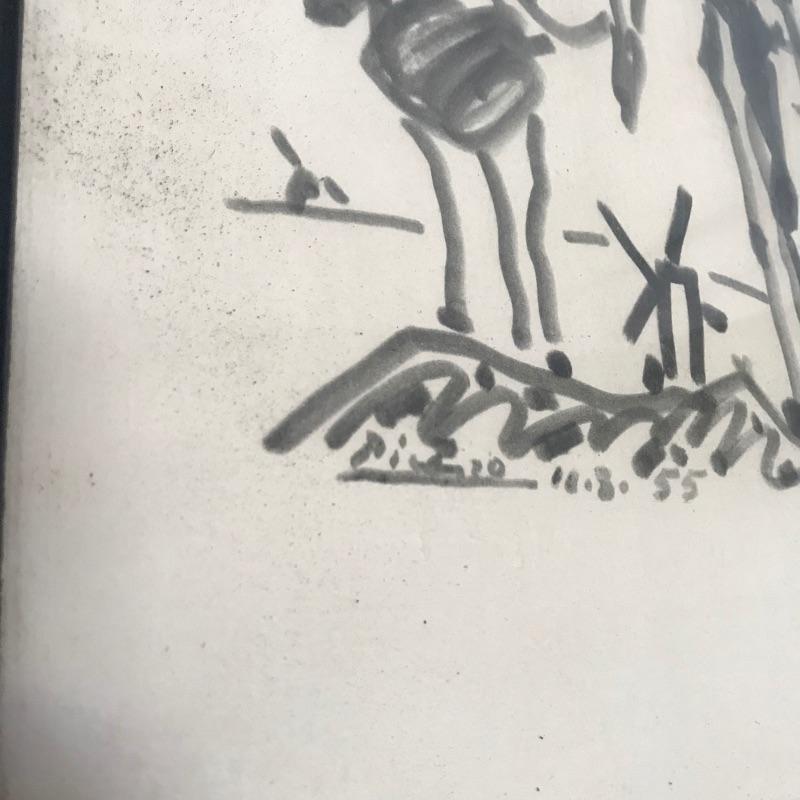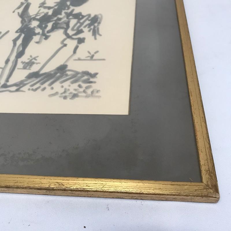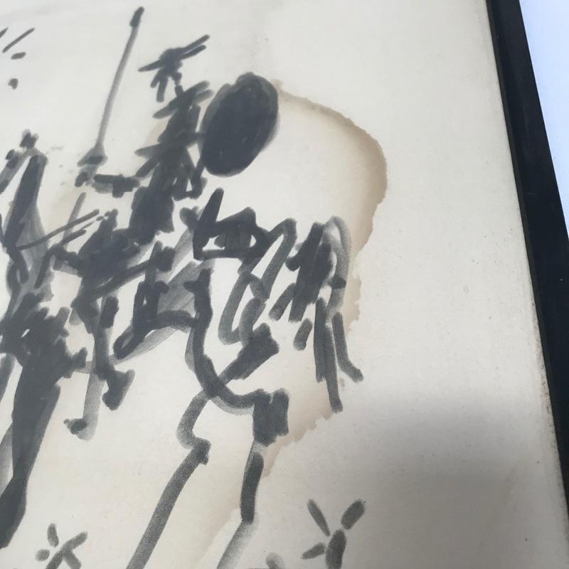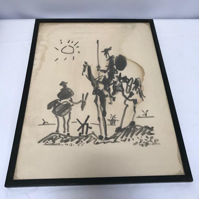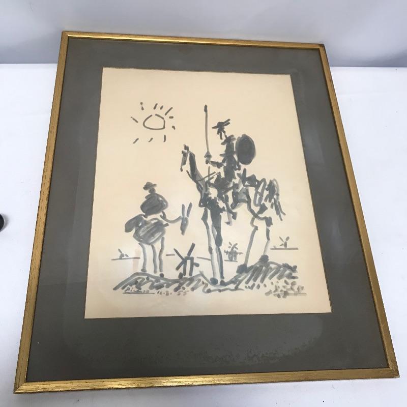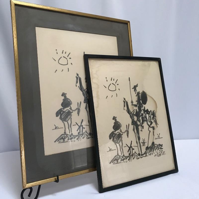 Two vintage matching Don Quixote prints by Picasso behind glass in wooden frames. Both frames paper backing is wearing out and needs to be delicately handled. The smaller black frame art has water spots on print and the frame is separating in the upper right corner. See photos. The larger frame measures 20.25” x 25”. Shipping available. Please call UPS with dimensions at 828-252-6930 for a shipping quote prior to bidding.