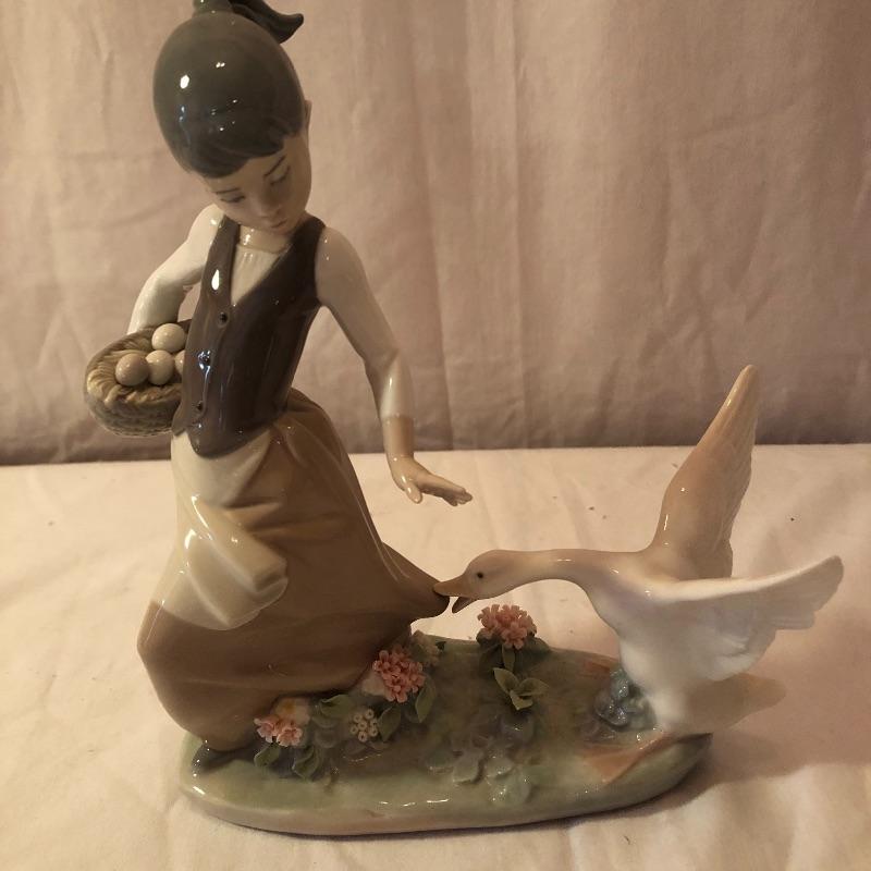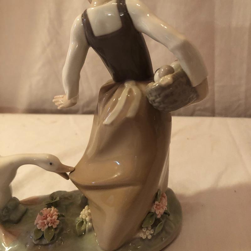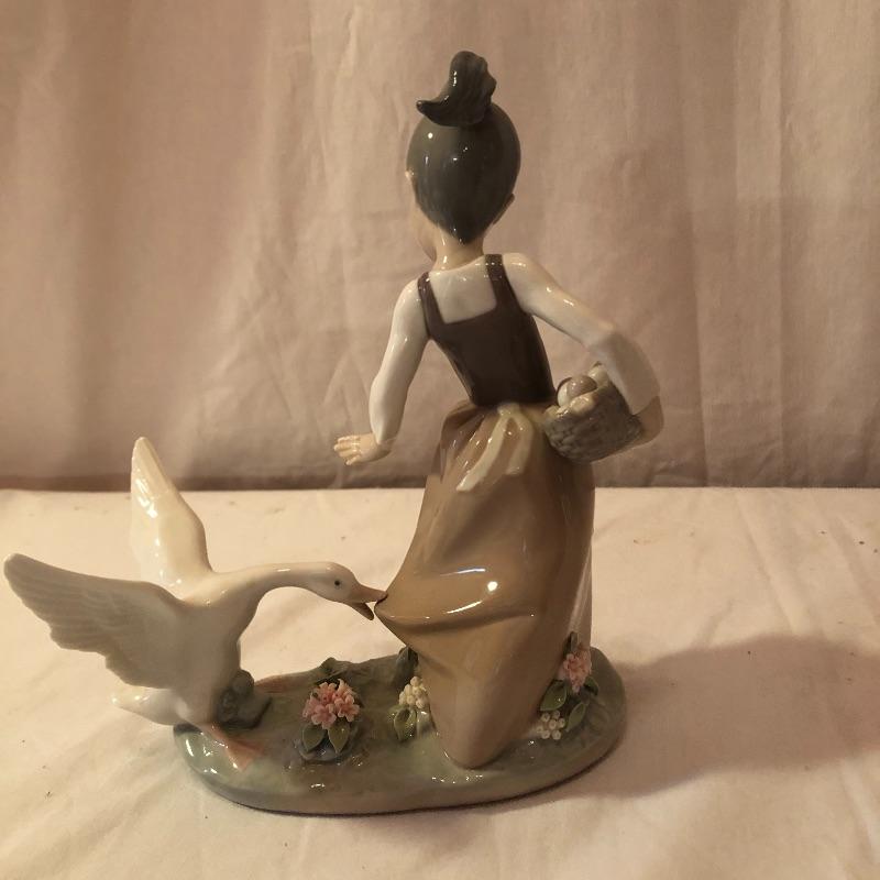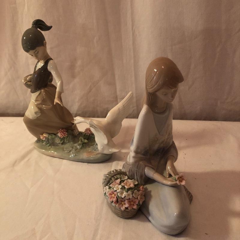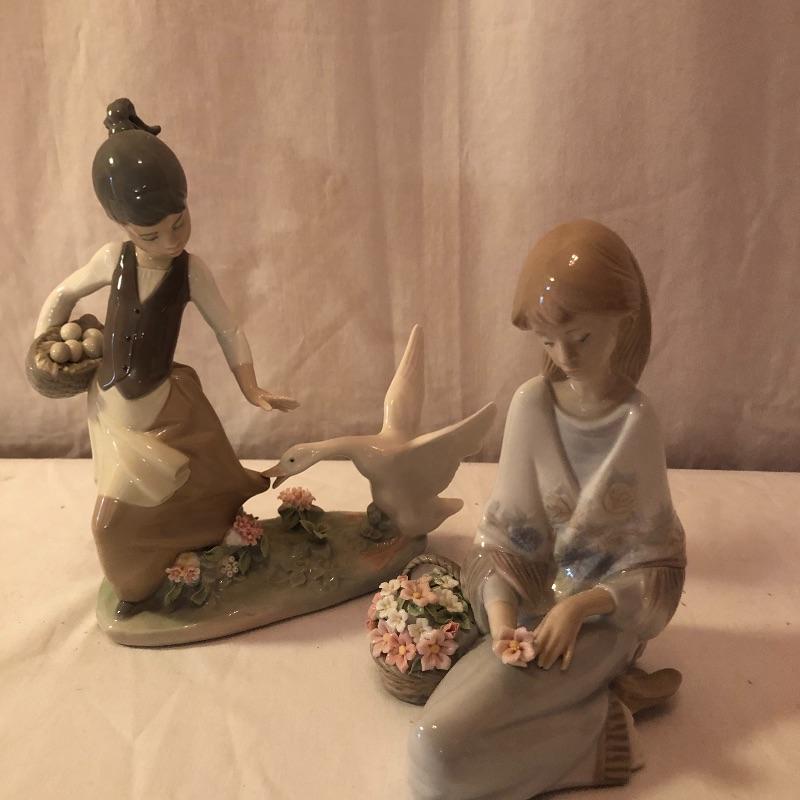 This lot contains two young women Lladro figurines. One woman is holding a flower and the other is running through flowers being chased by a goose. Shipping Available.