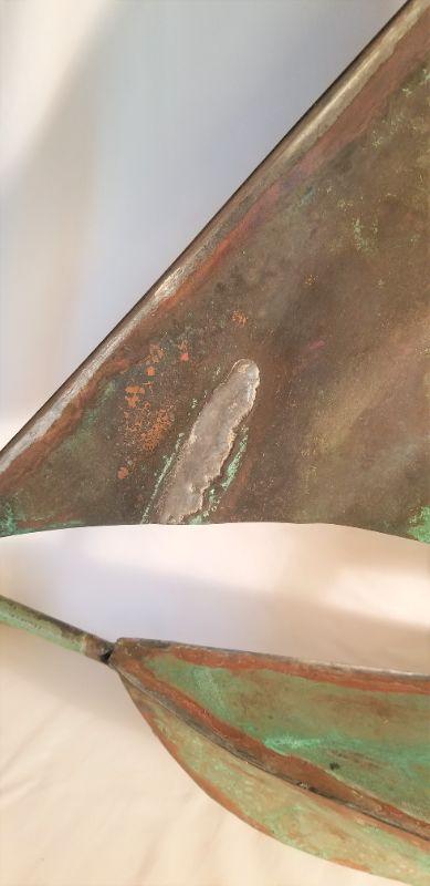 One of the best items in the sale - attic find! - old copper weather vane in the form of a sale boat. Great original patina. Show evidence of an old repair (see photo). Measures 30.5" wide, 31.5" tall.