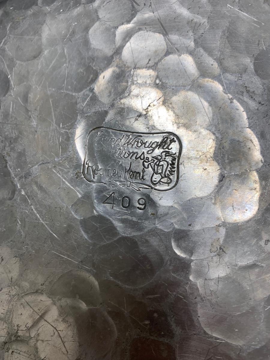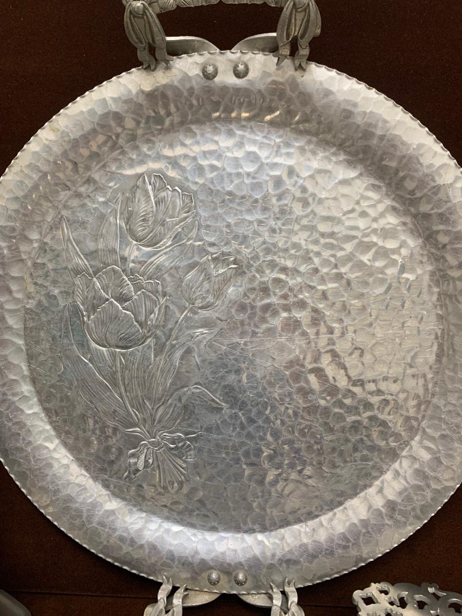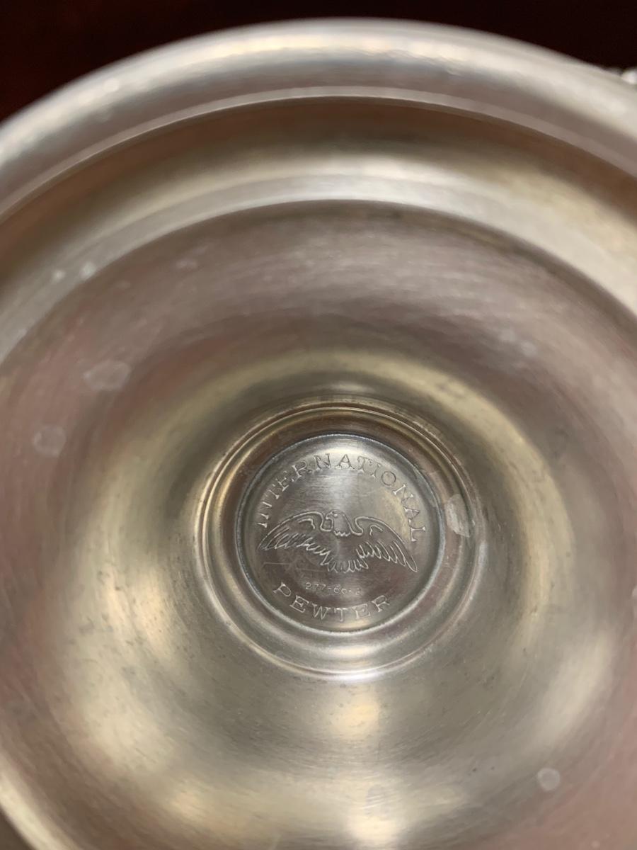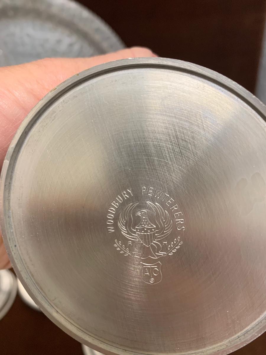Includes hammered aluminum platter, International Pewter vase and coaster, Woodbury Pewter cup and saucer, Pair of candleholders, small coaster and a bowl with handles