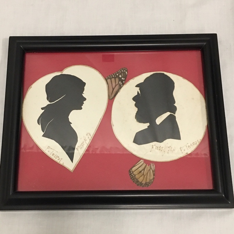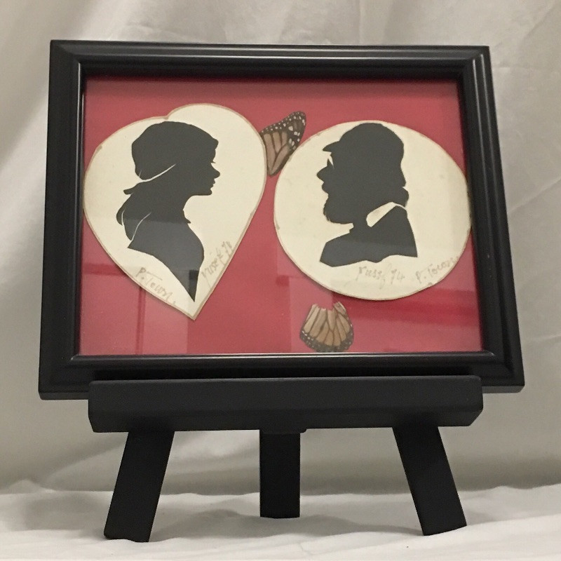 Framed silhouettes with frame stand and twenty five vintage postcards. These neat postcards will have you reminiscing about the good old days!Frame measures 9.5” x 11.5”.
